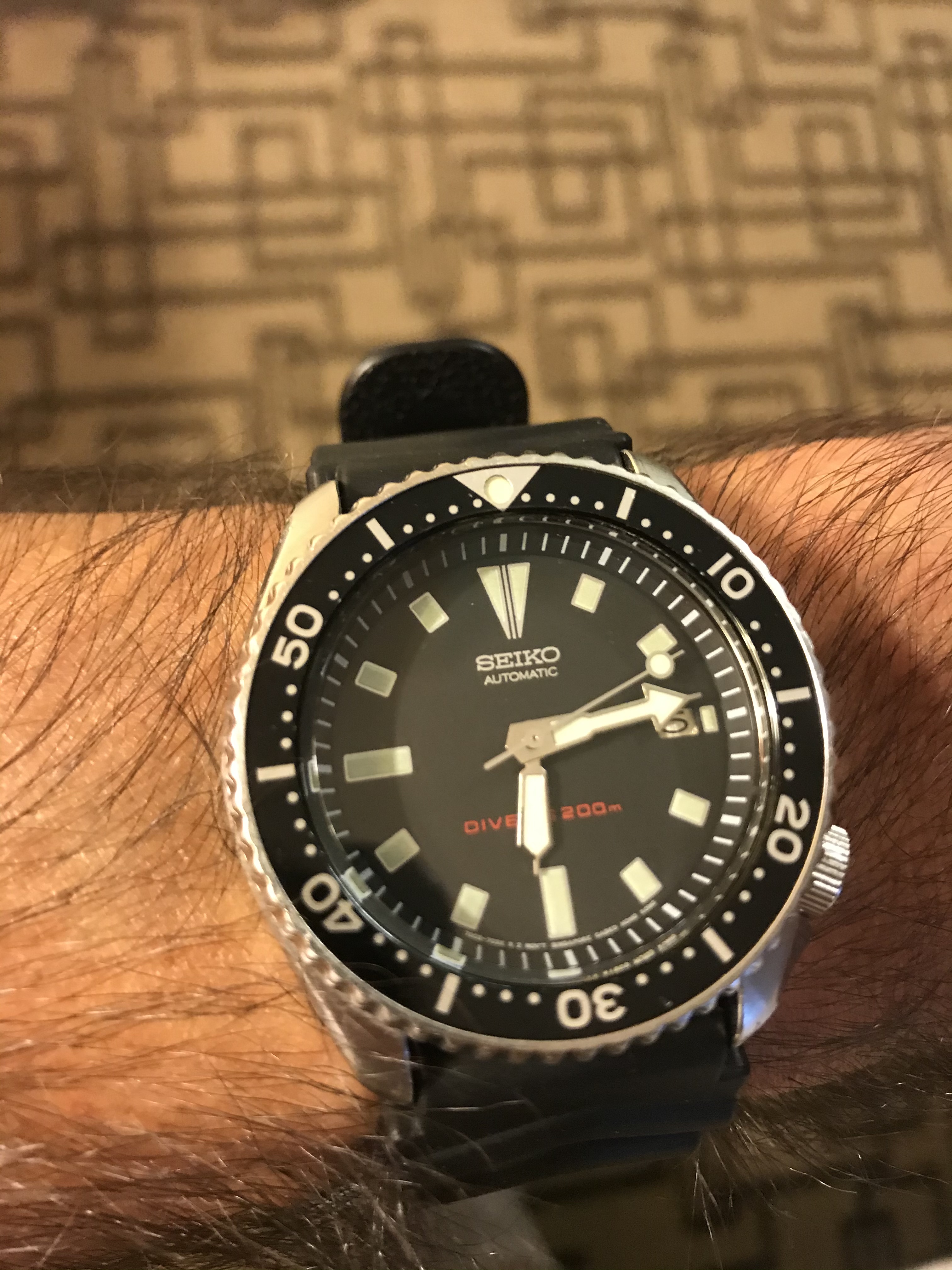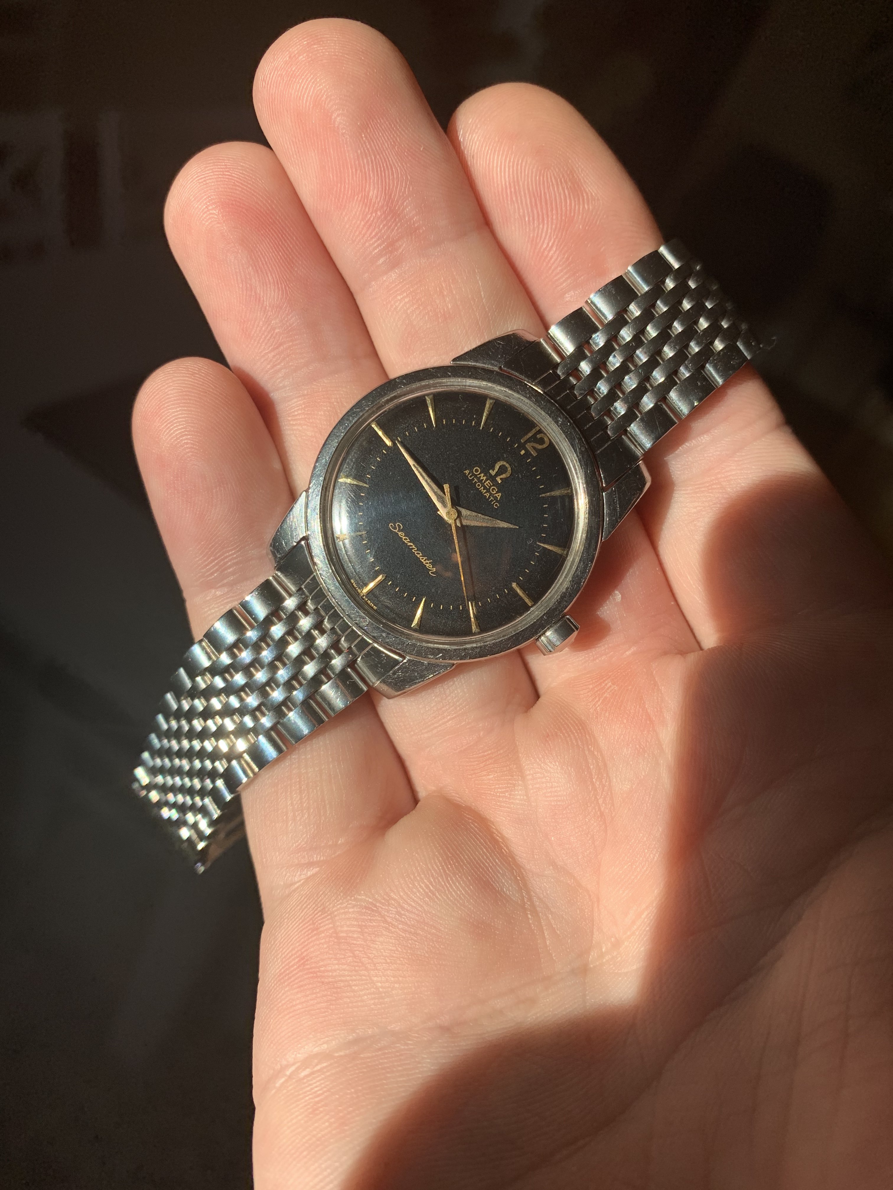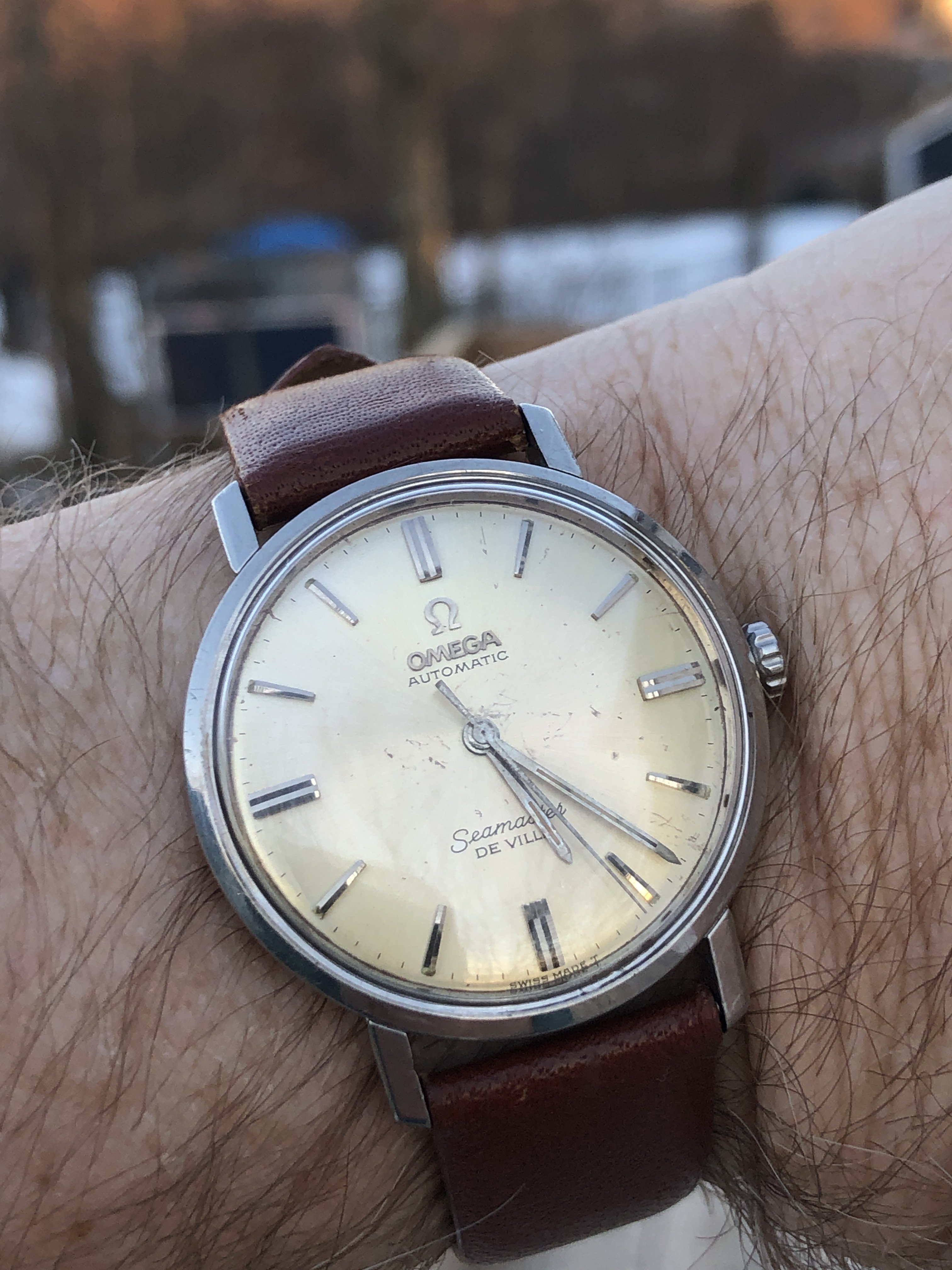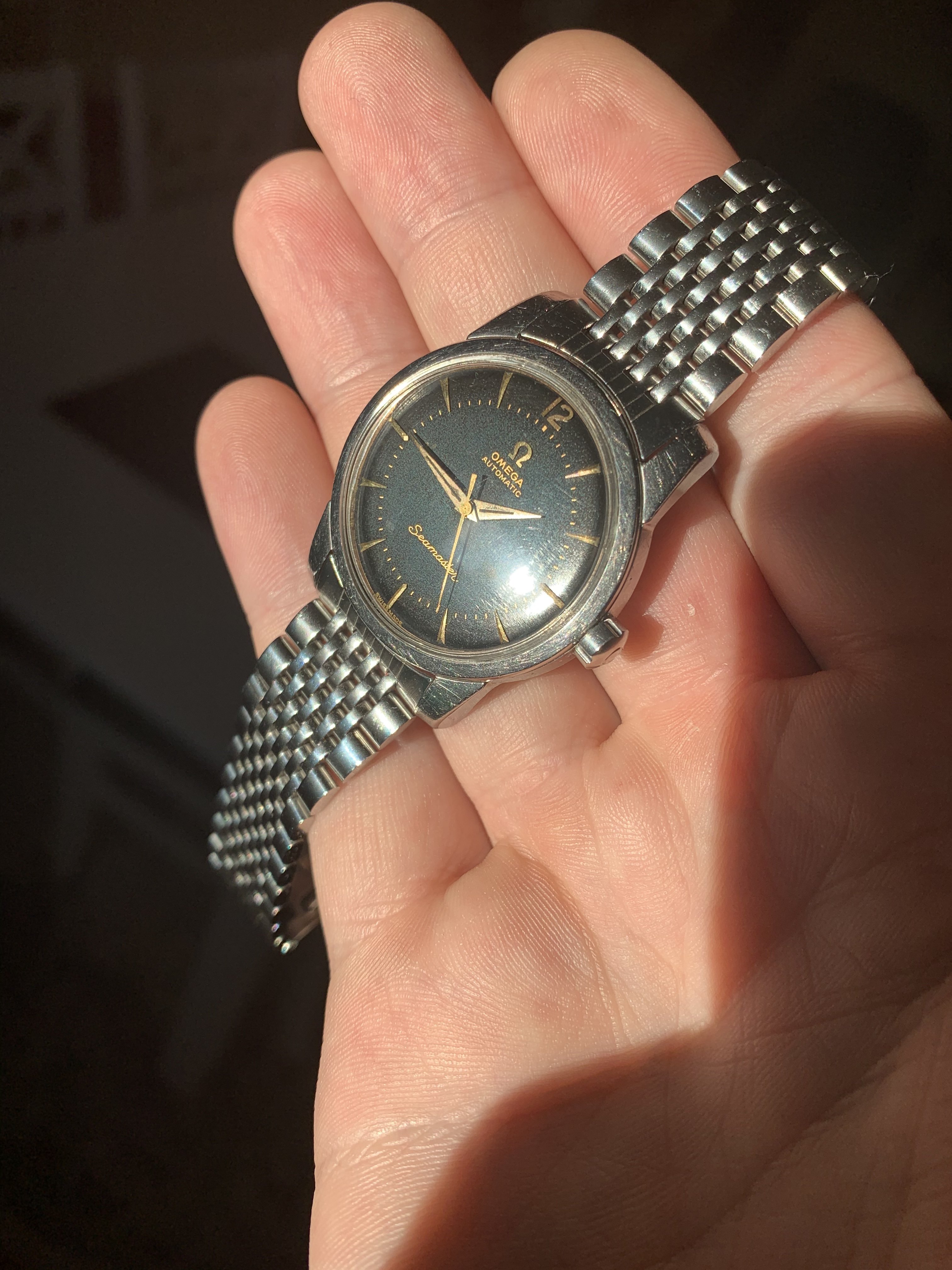 Just want to put this up. My only Seamaster. I think I’ve had 7 pass through my hands that I picked up as gifts for people this is the only one I kept. Got it for 70 bucks a couple years back. Just one of those right place right time things that rarely happens to me. All the ones I gave away cost more than this, though none were extremely expensive but this one I always liked and don’t wear it nearly enough. It really needs a better strap I’ll get around to it, the watch ain’t going anywhere. I really like her dinged up dial and all.