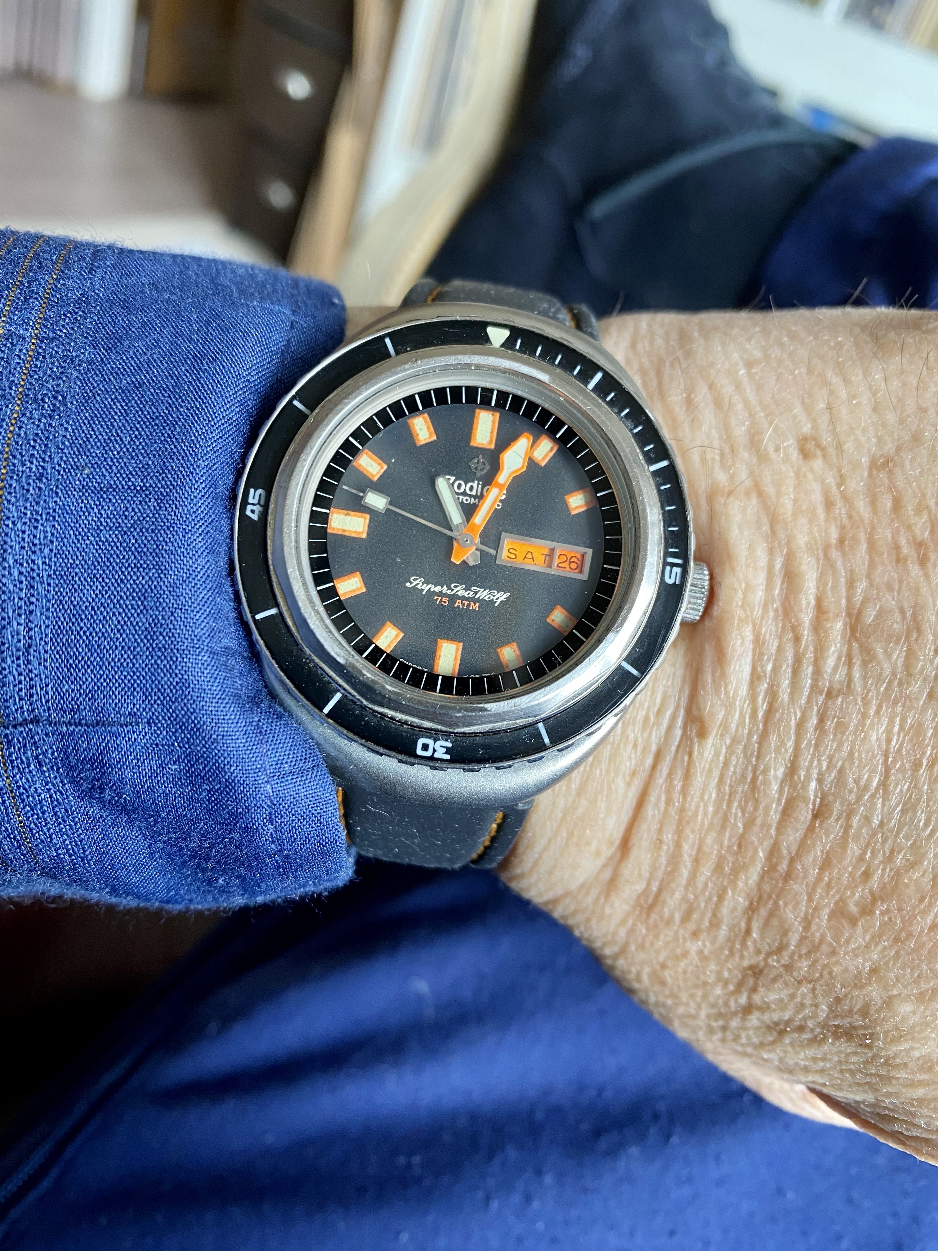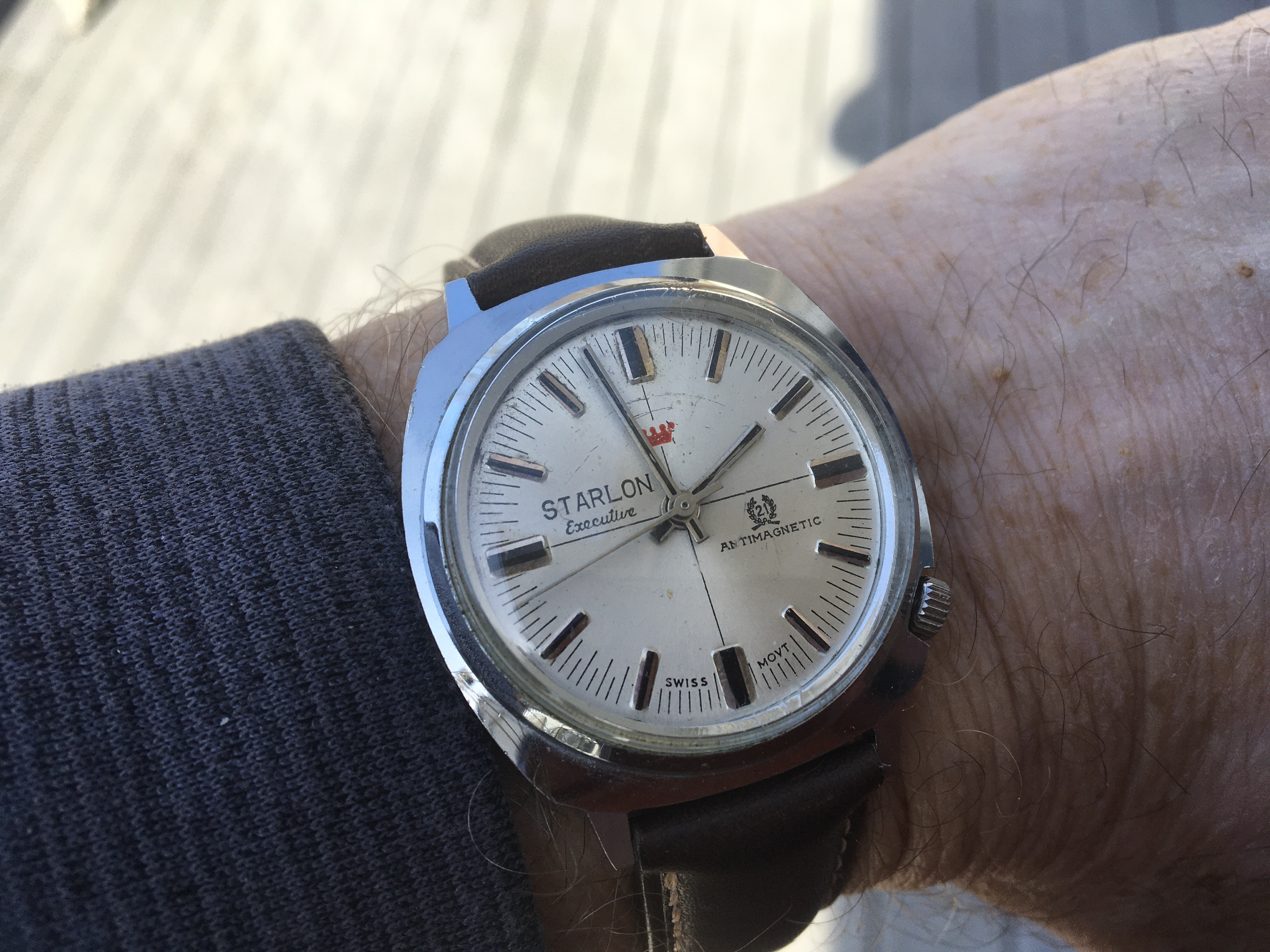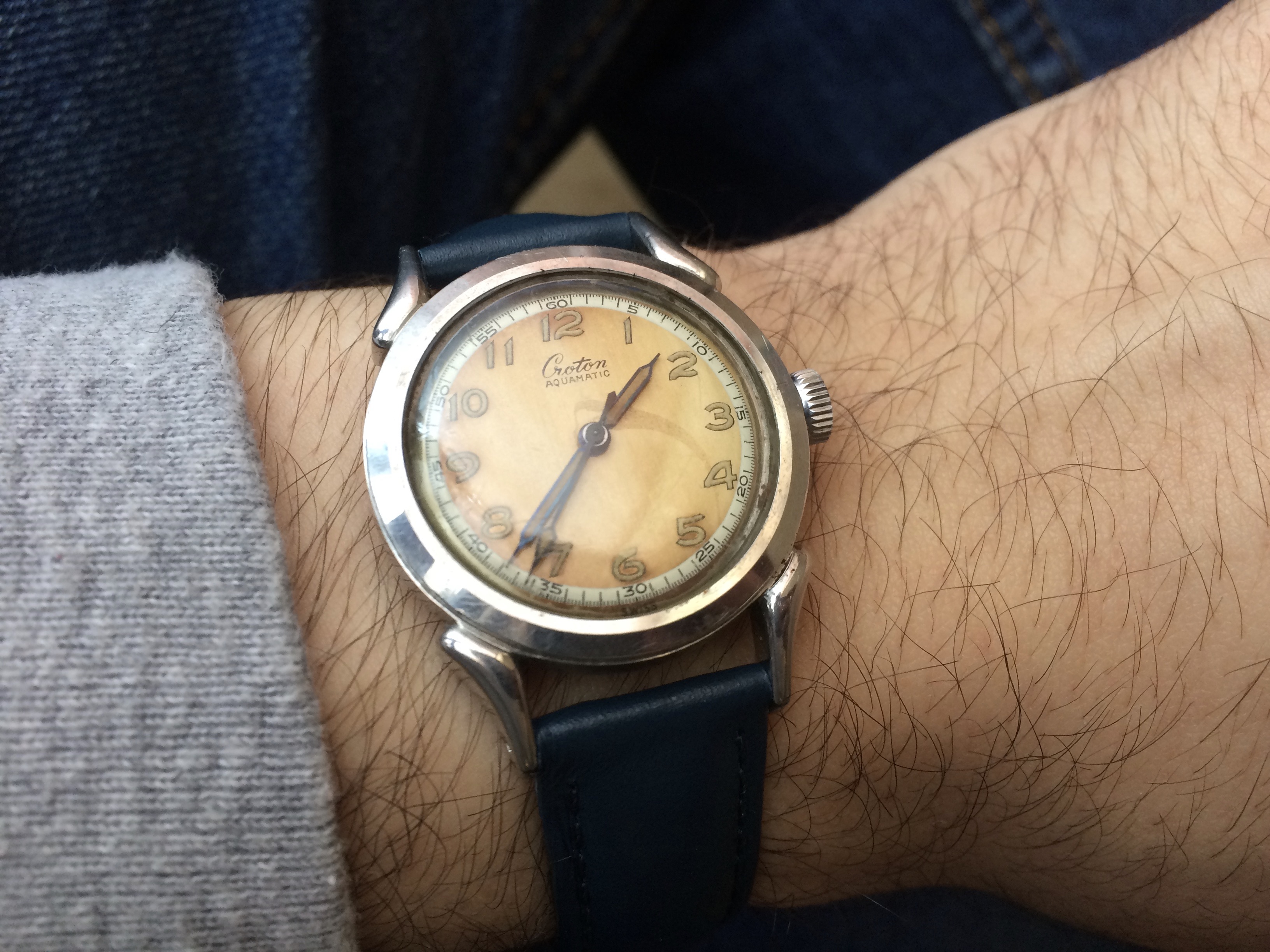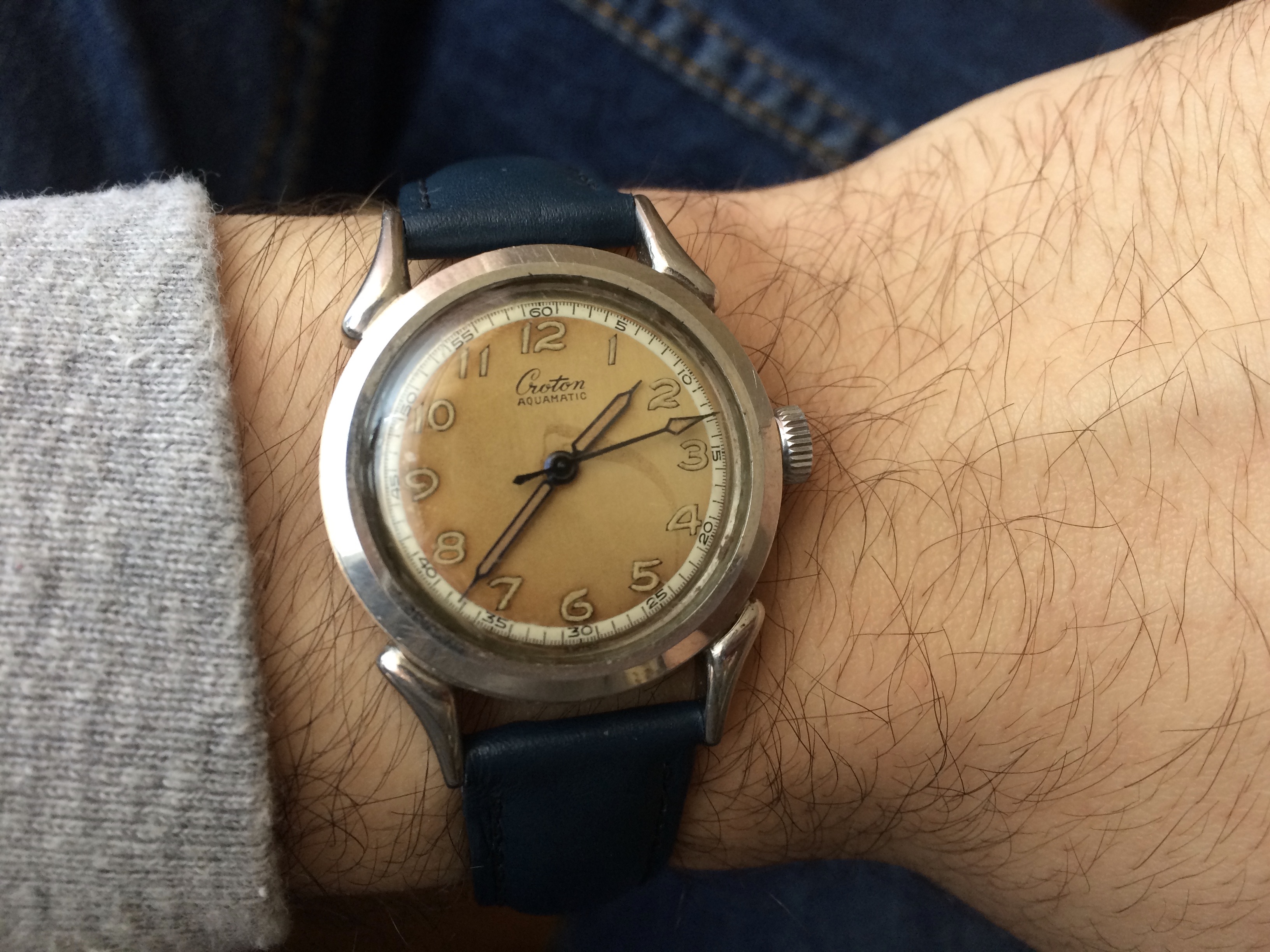 The watch's complication is a barometric indicator. Uses a Peseux 7001 movement, face has double-sided antireflective coating, and the "T" lume has developed a toasty patina. (Bonus!)