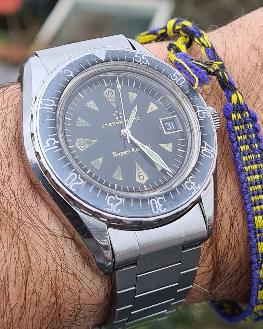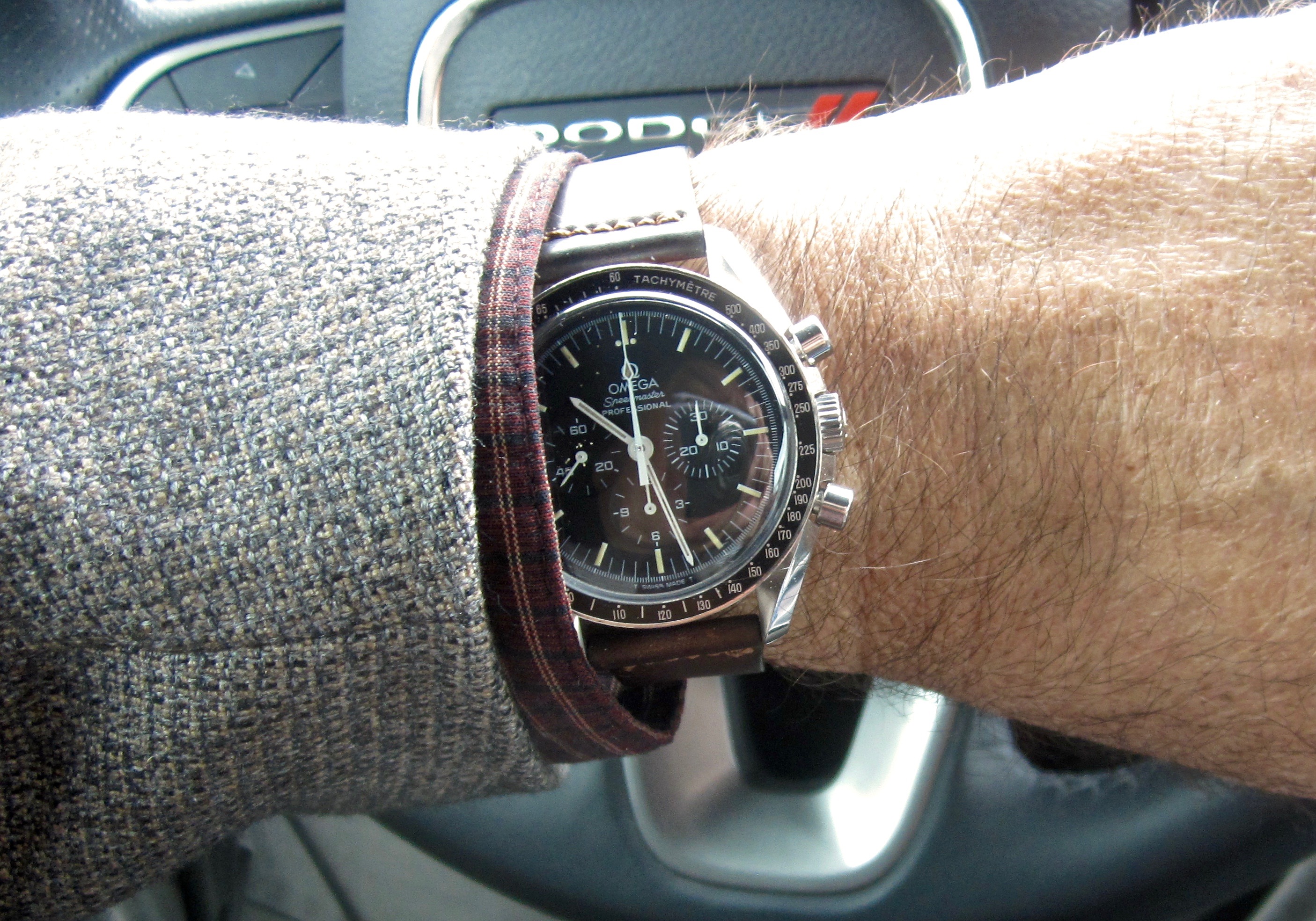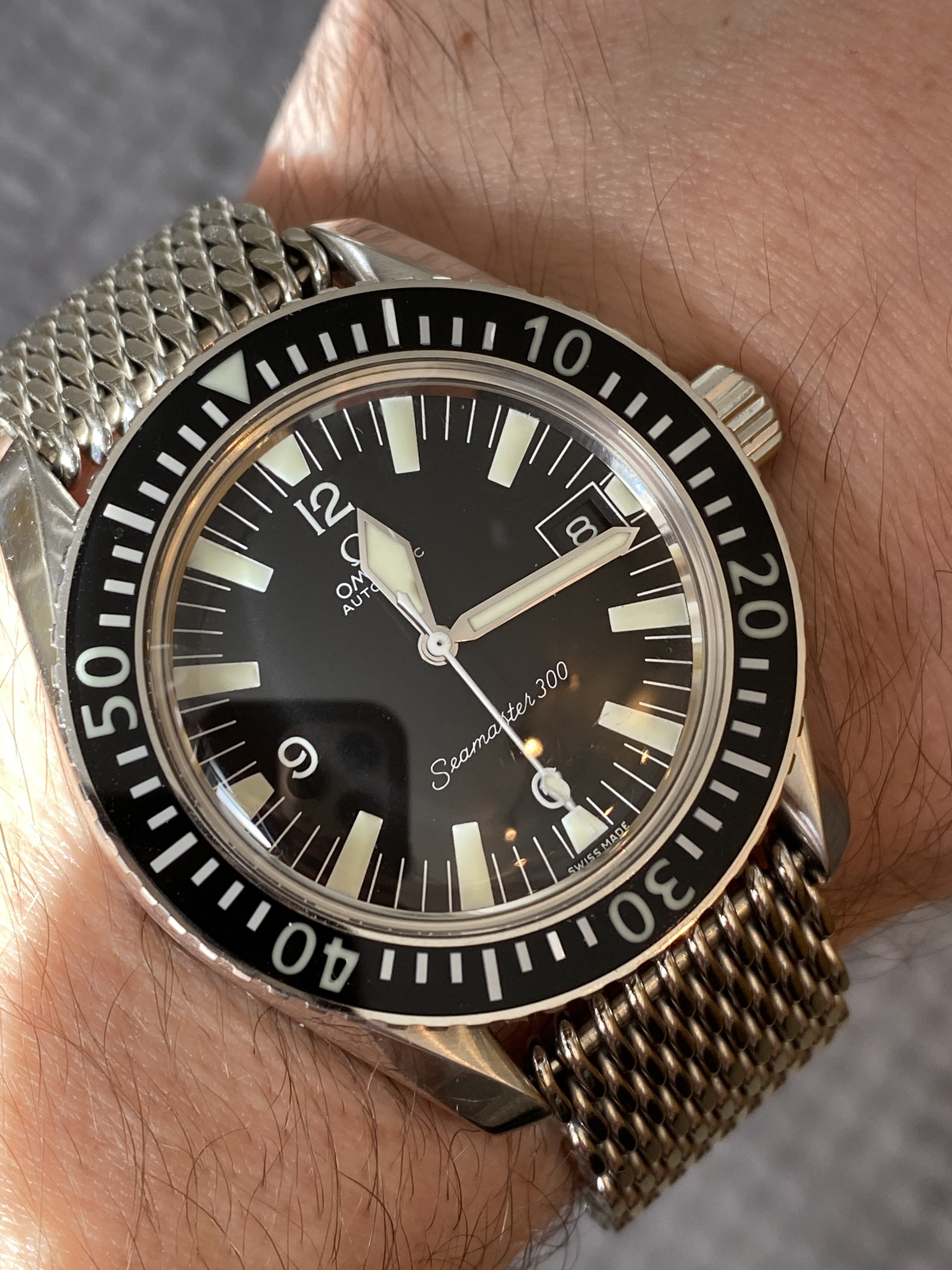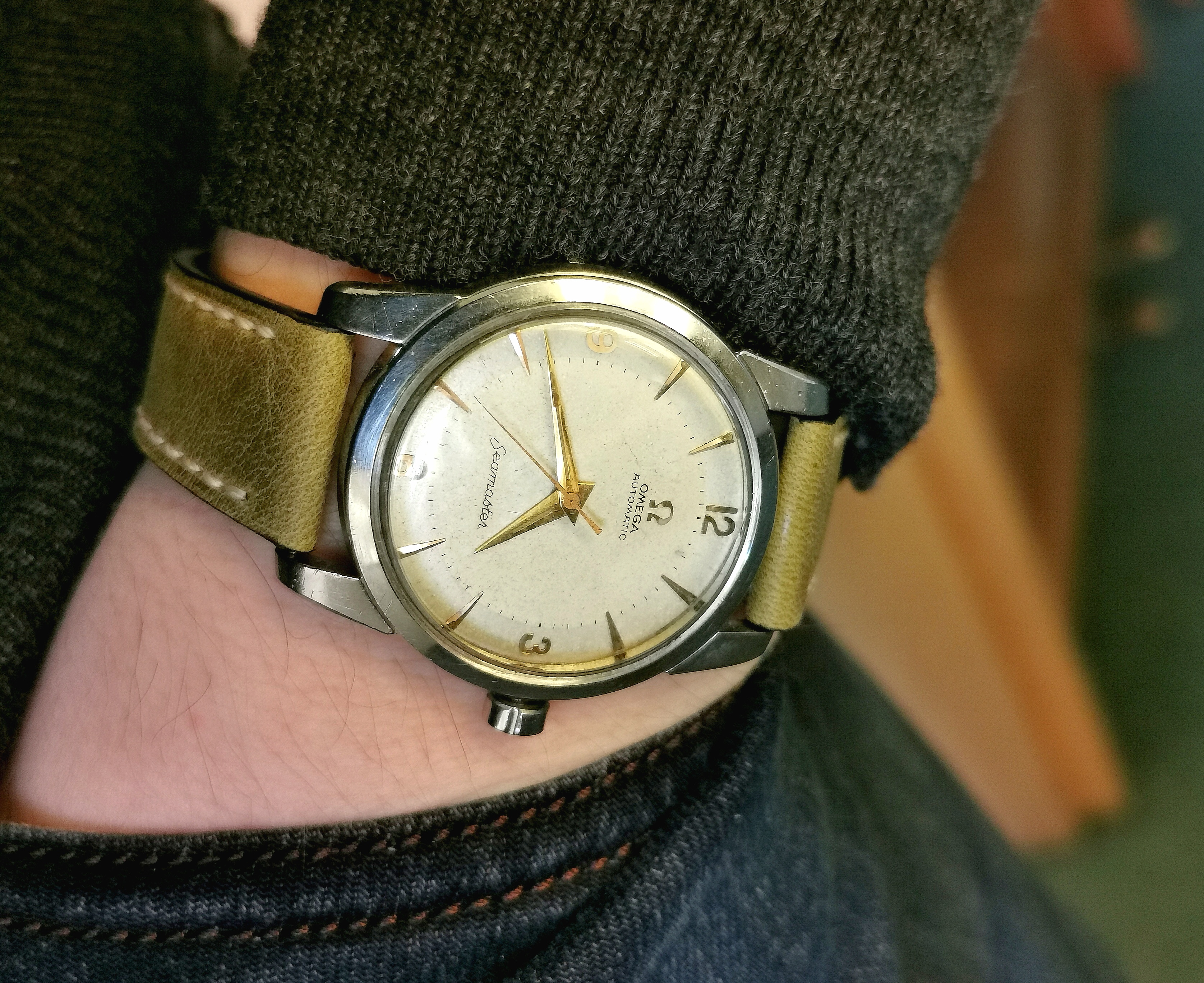 The watch's complication is a barometric indicator. Uses a Peseux 7001 movement, face has double-sided antireflective coating, and the "T" lume has developed a toasty patina. (Bonus!)