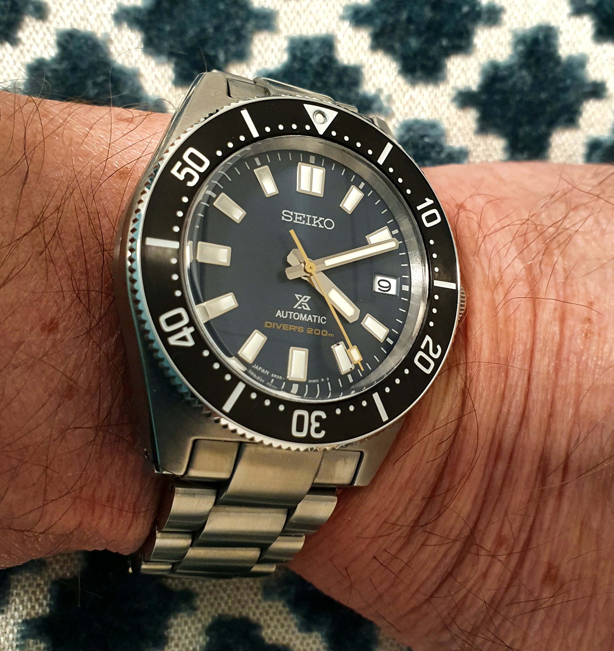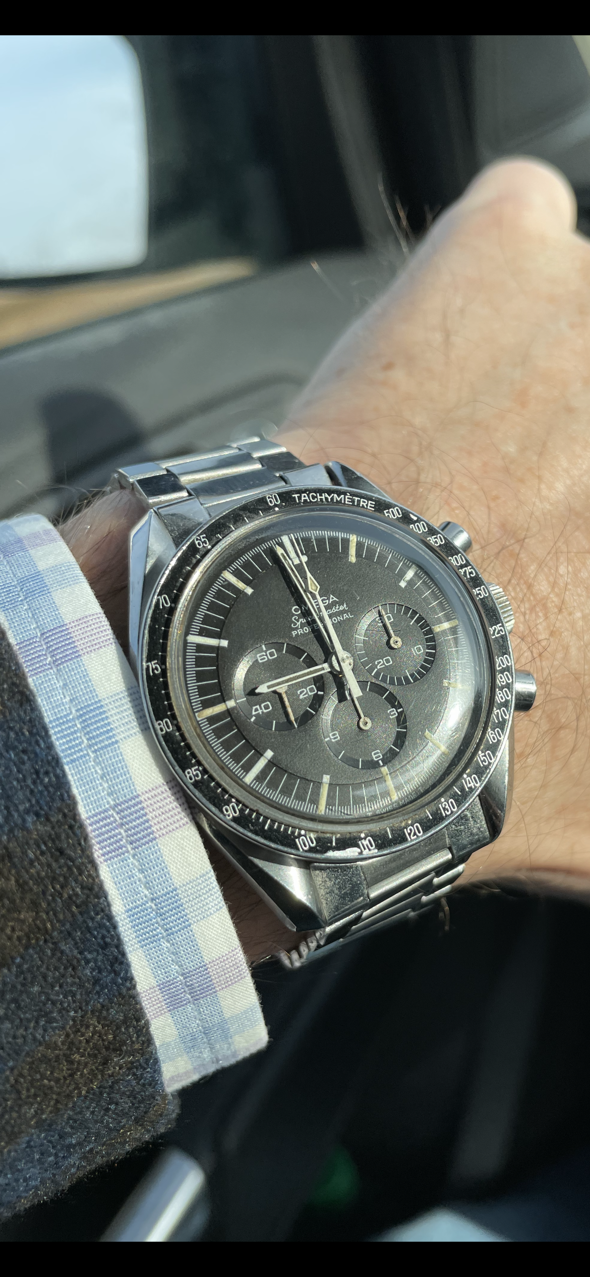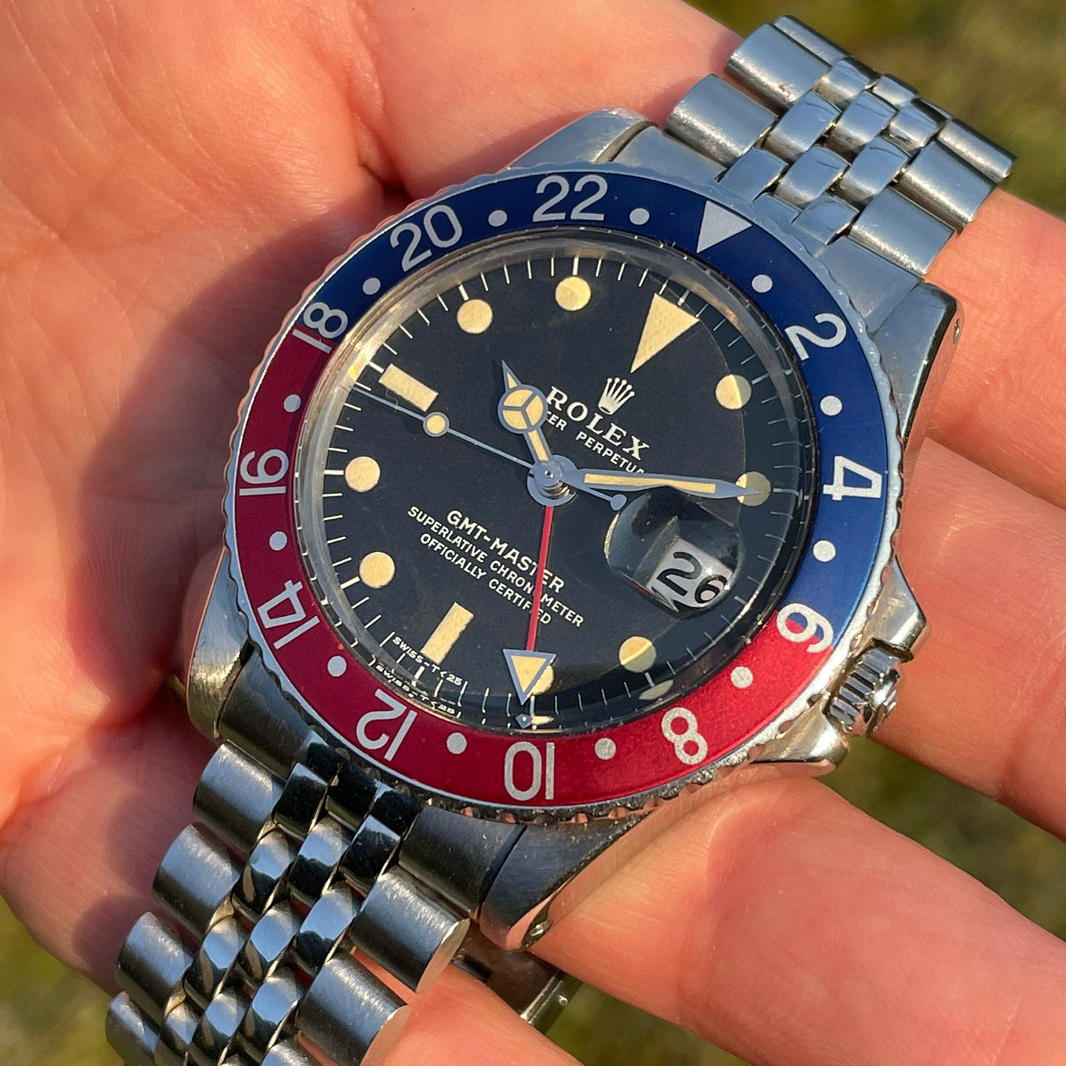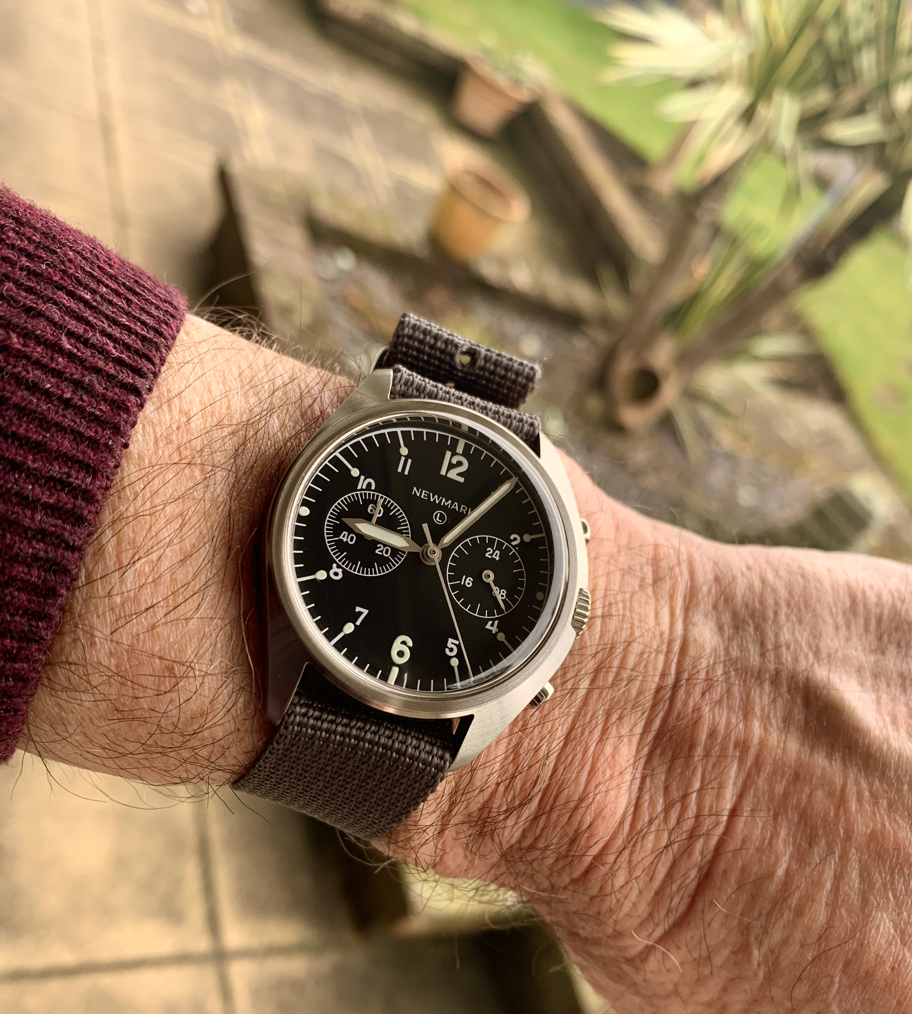 The watch's complication is a barometric indicator. Uses a Peseux 7001 movement, face has double-sided antireflective coating, and the "T" lume has developed a toasty patina. (Bonus!)