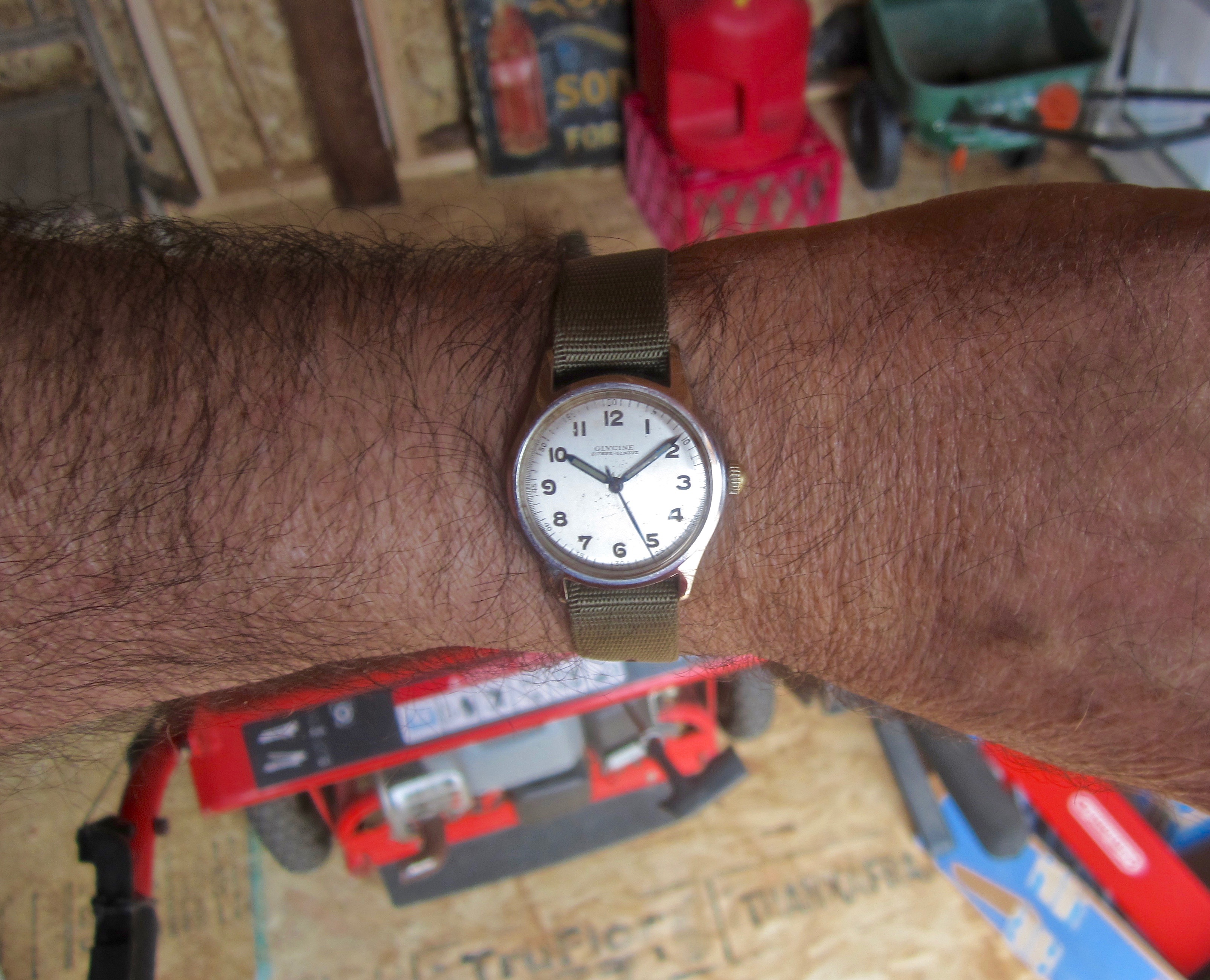 We added a sturdy new garden shed to the backyard a couple days ago. Saturday chore day is filling it up and arranging its contents. It was coming up on watch photography time, 10:10. Chores day calls for a chores watch.
