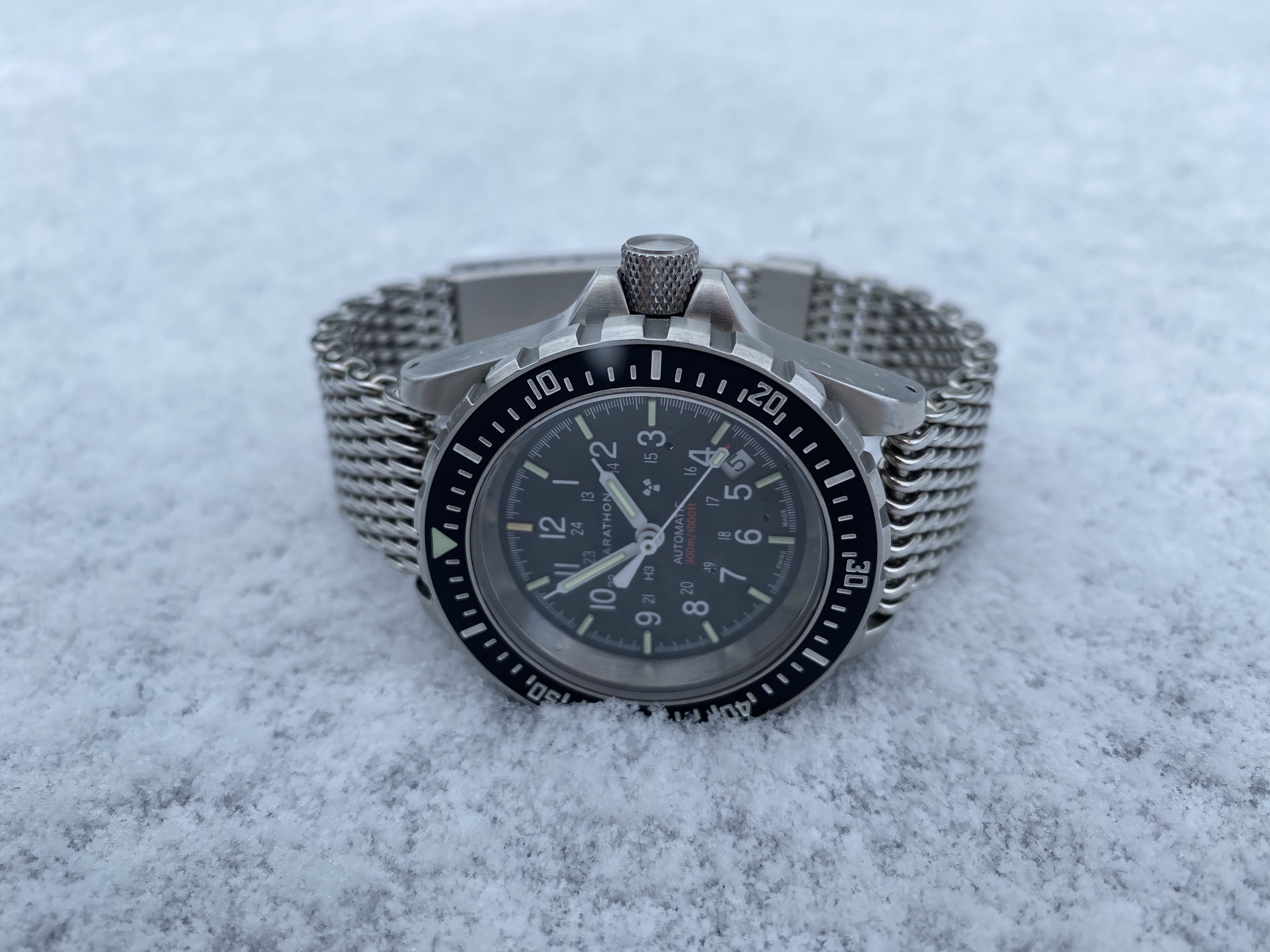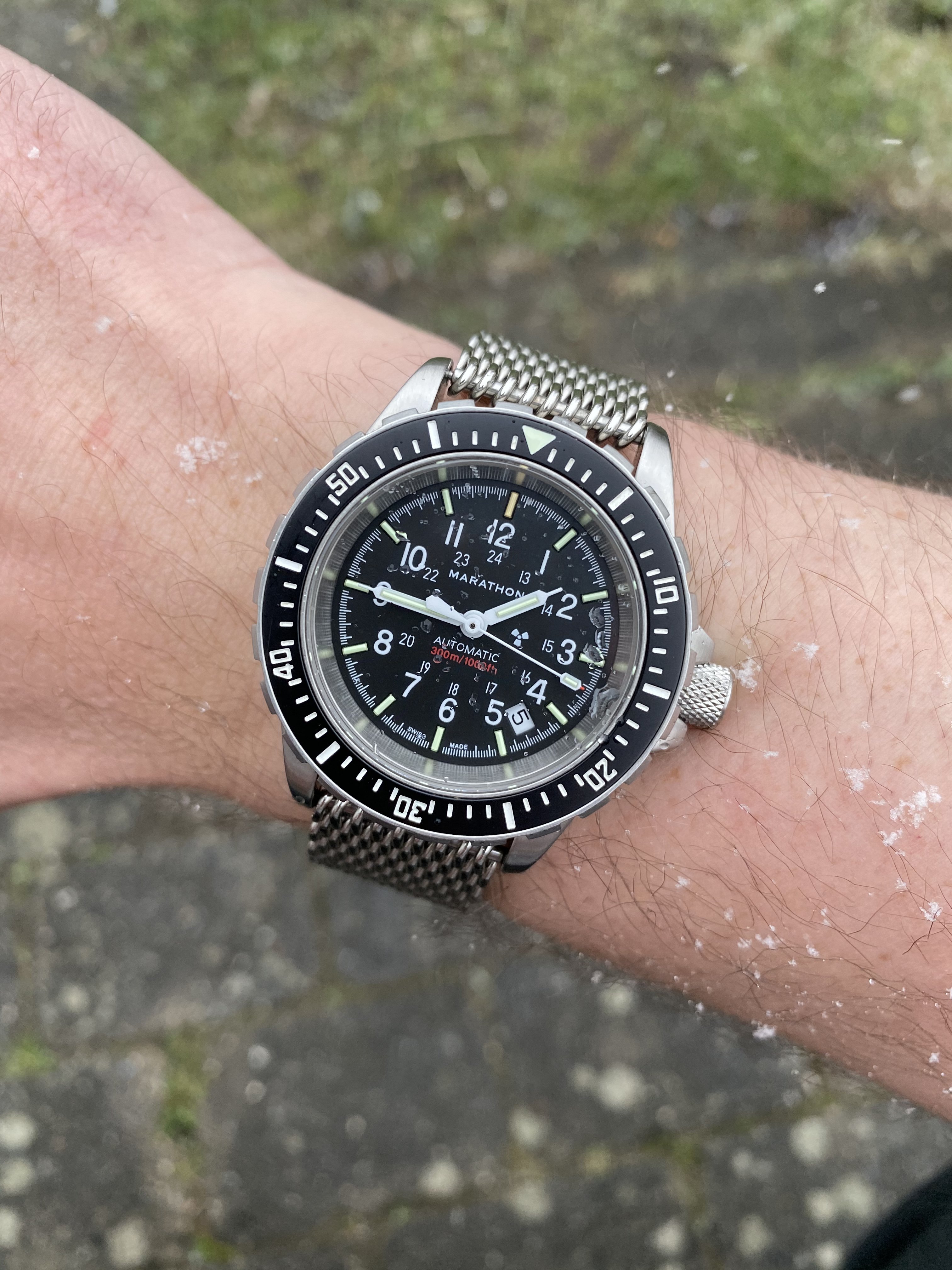 Posts 2,583 Likes 11,971 Togri v. 2.0 ·Apr 5, 2021·Wow! Custom title... cool Rather strange weather today; sunny and 9 degrees Celcius this morning and by 2pm we almost have a snow storm. Wearing my favourite tough watch, Marathon GSAR 41mm, on the Omega shark mesh. They look pretty good together 😀