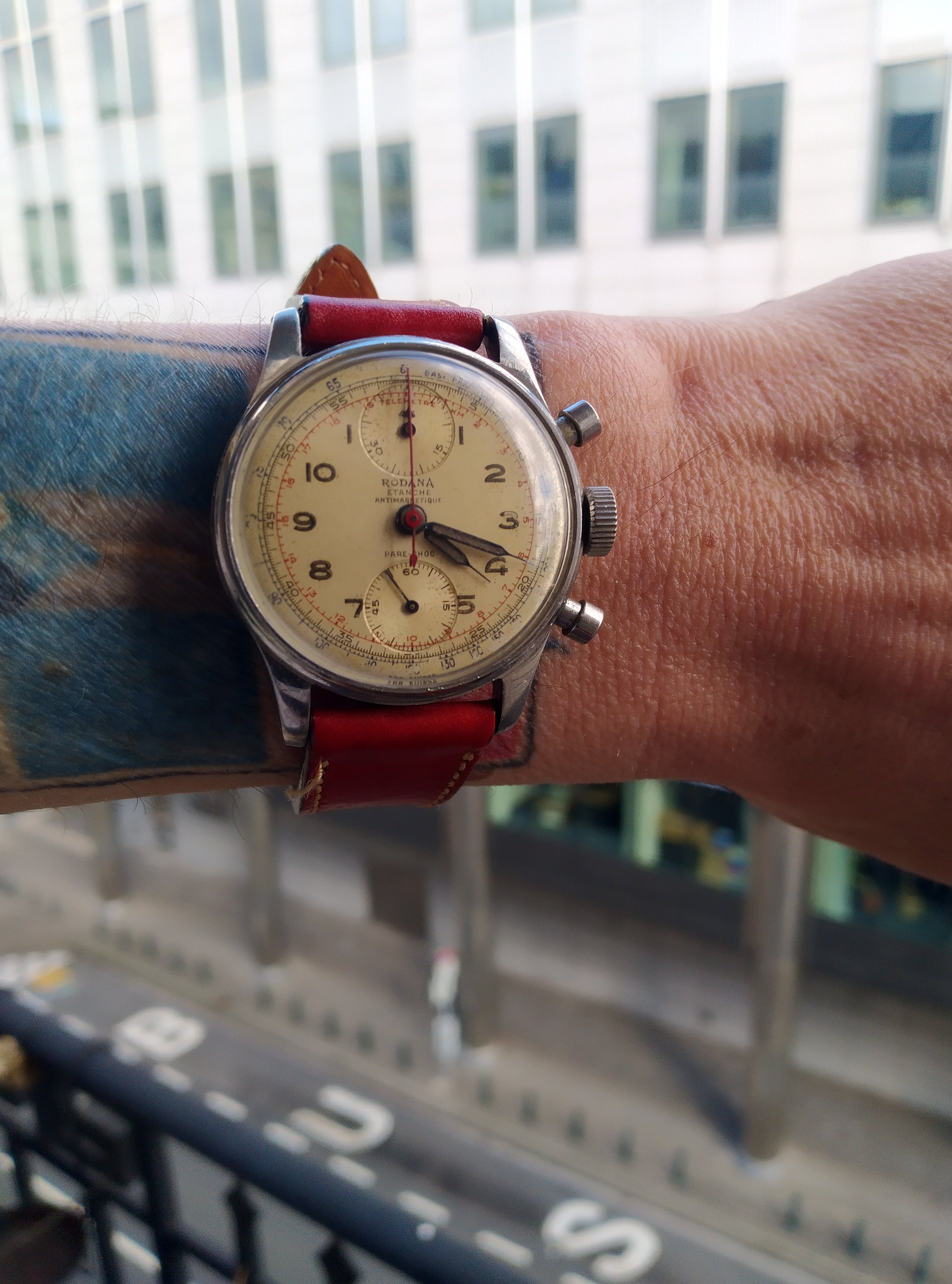 I recently bought a couple of nice collections of mostly old chronographs and got this one without even knowing it was included. It’s a lot visually but a fun watch.