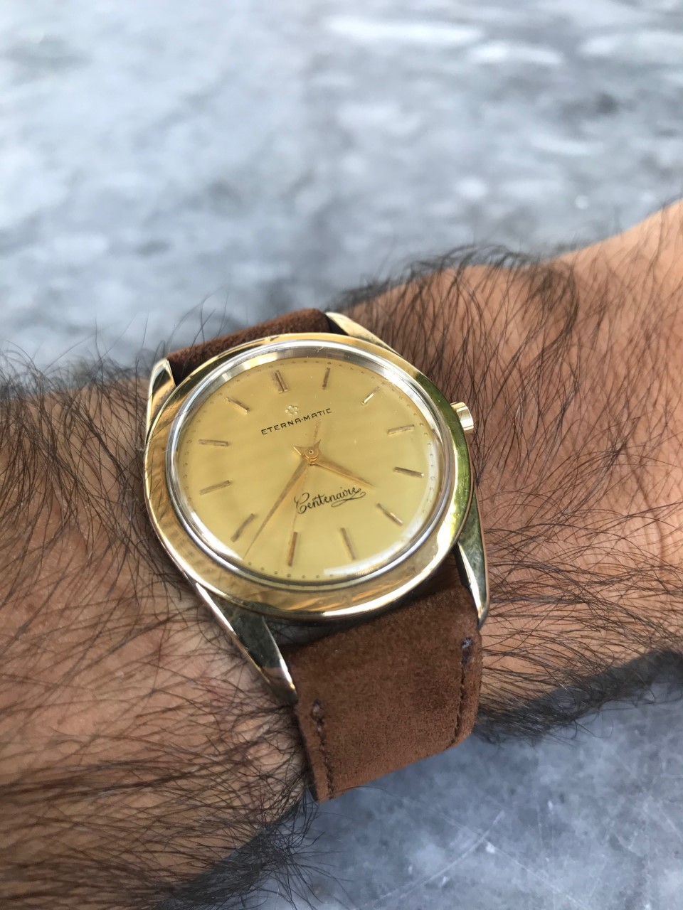 Posts 386 Likes 3,425 kaapstadflaneur ·Apr 14, 2021 Today it's a late-1950s gold-capped Eternamatic Centenaire -- 35mm but with surprisingly wide 20mm lugs, so wears slightly bigger. Keeps impeccable time...