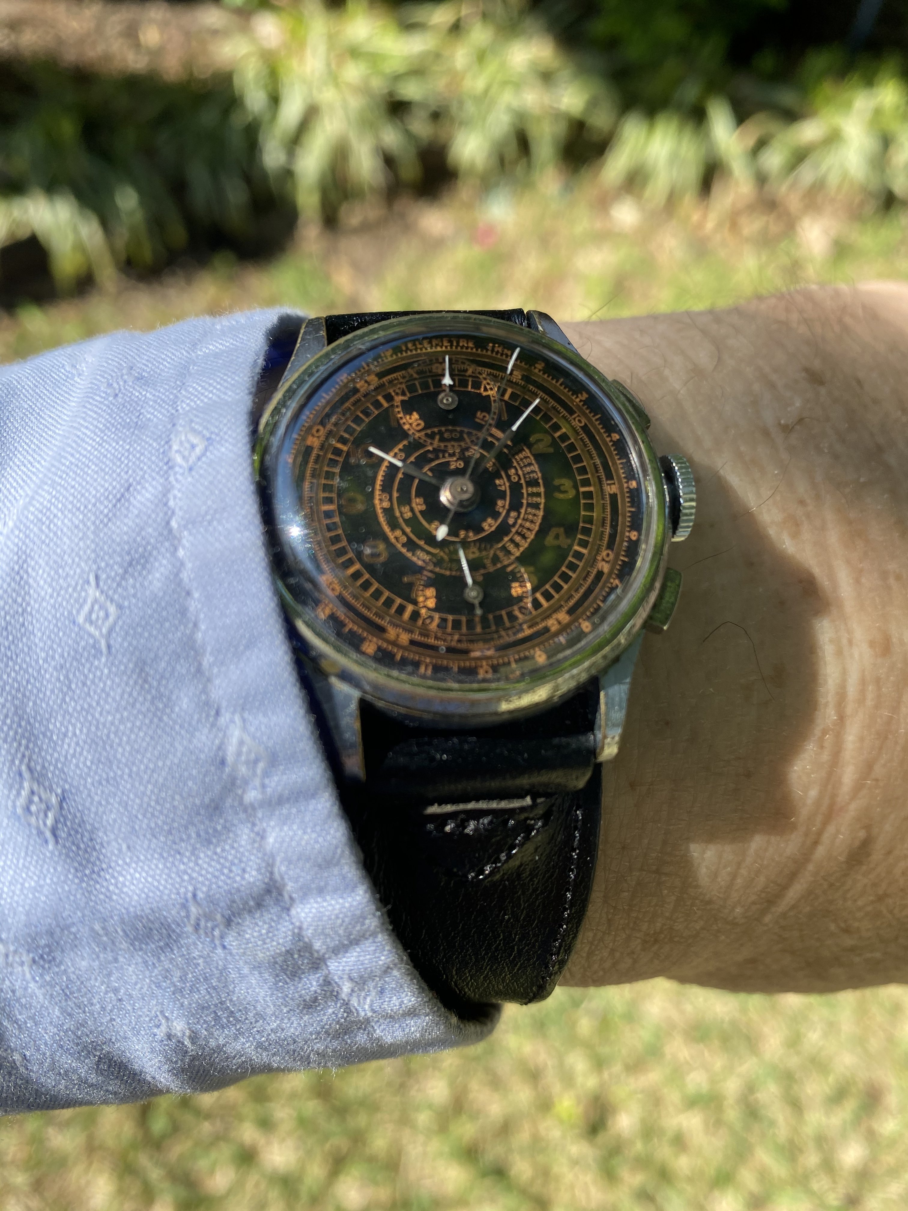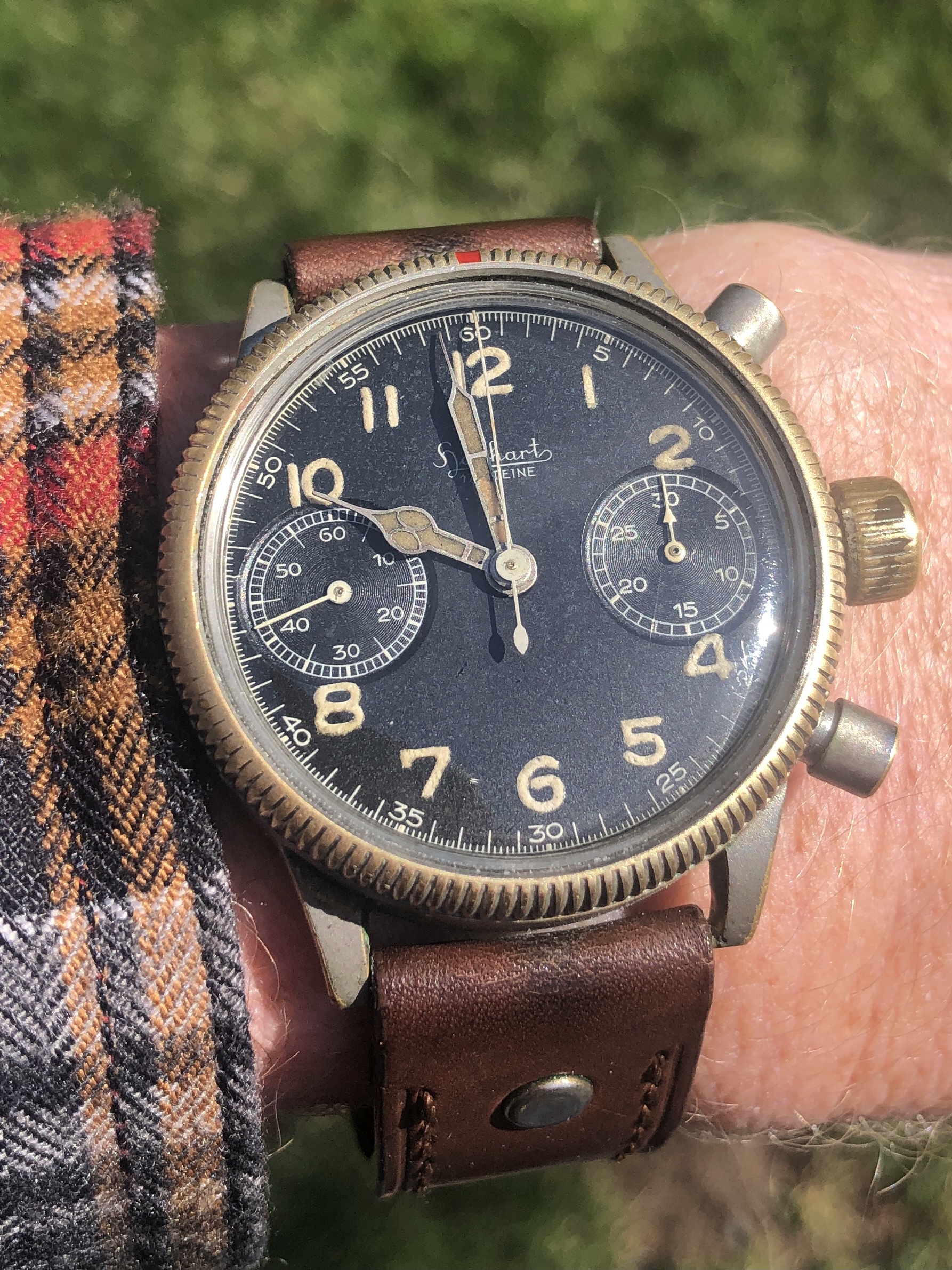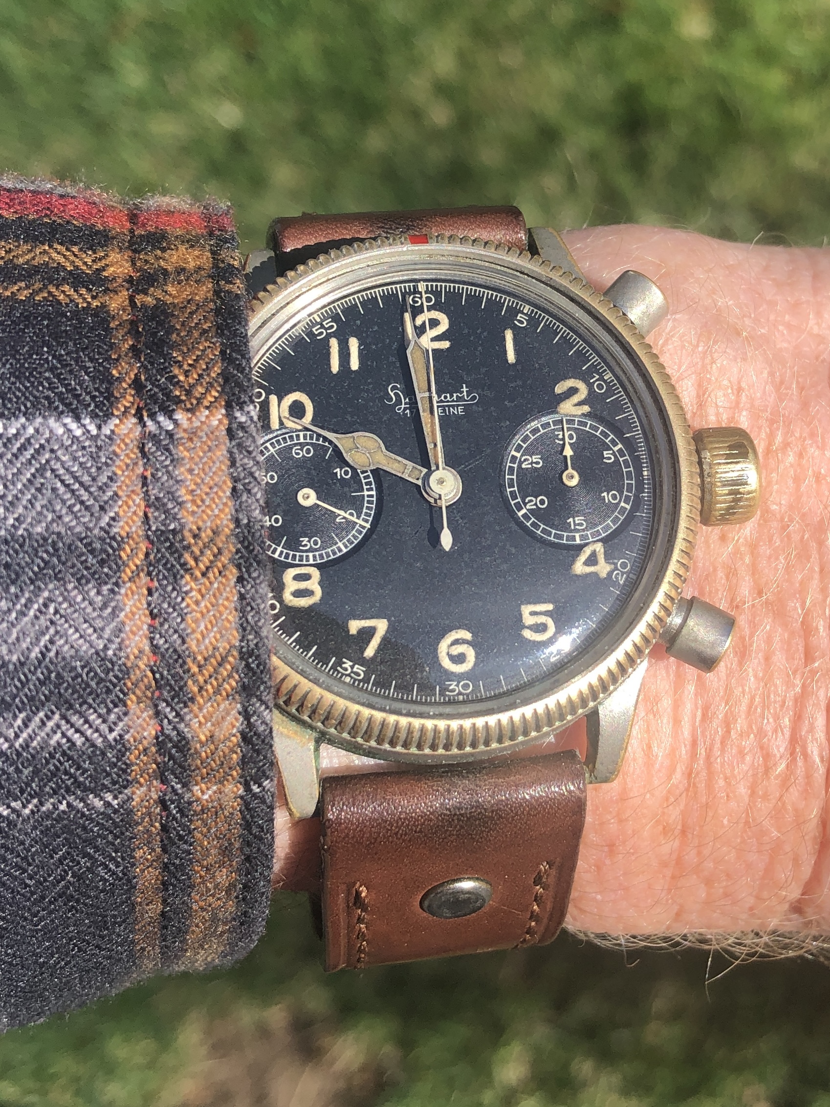 Hanhart fliegerchrono today. The left edge of the bezel - in particular- shows the wear of nearly 80 years of use. It鈥檚 a Beautiful, early spring day in the northeast US of A.