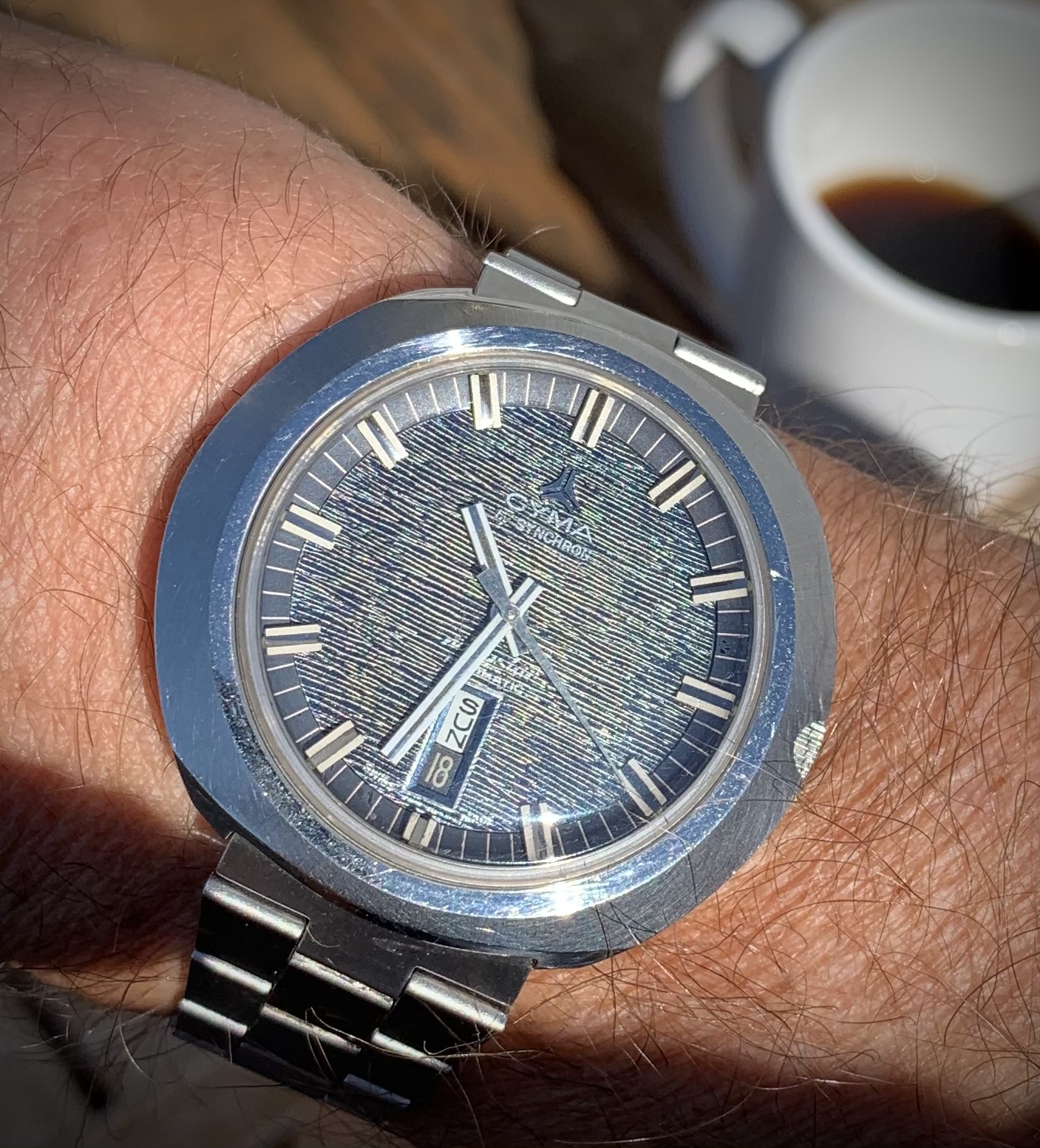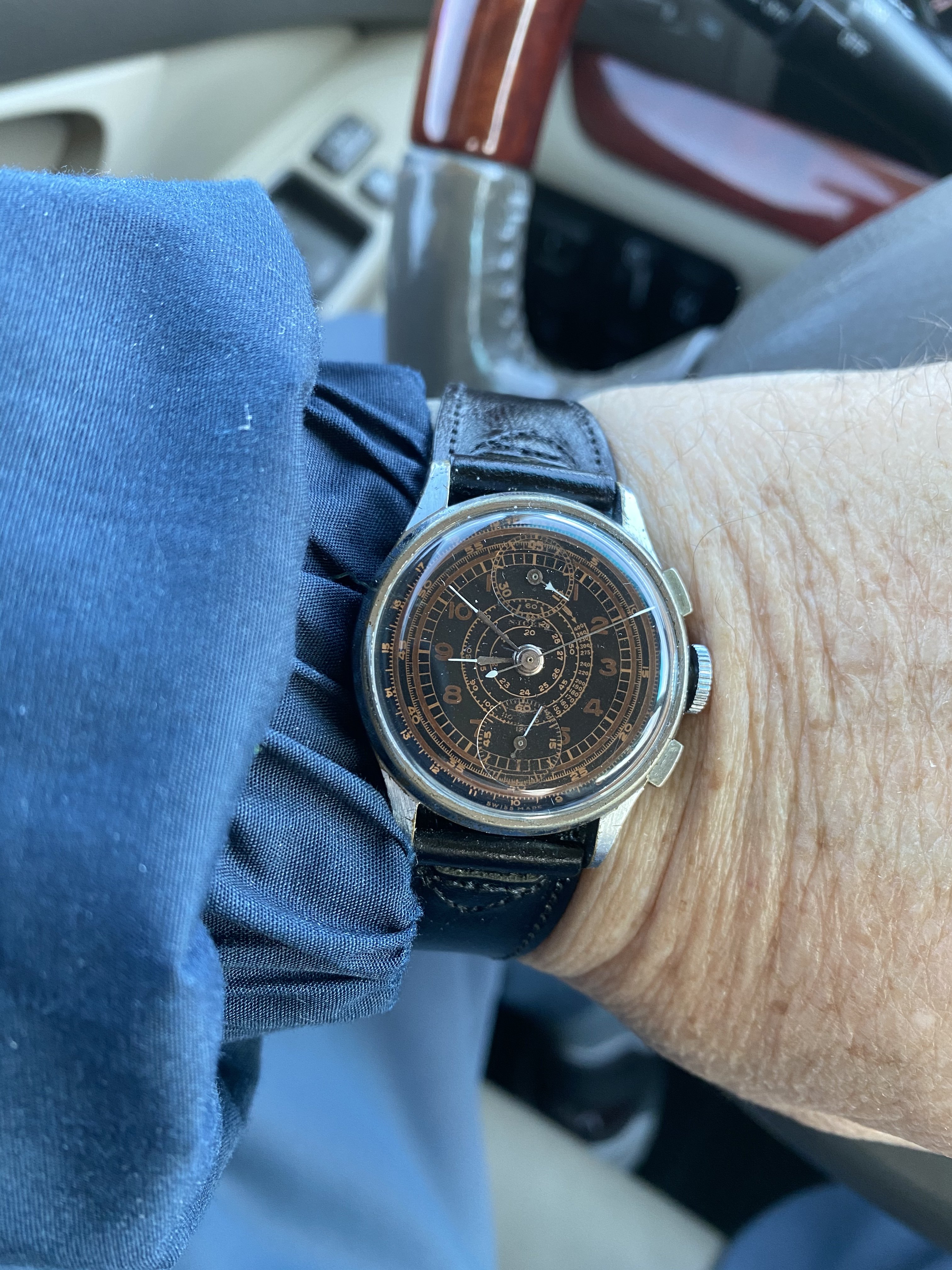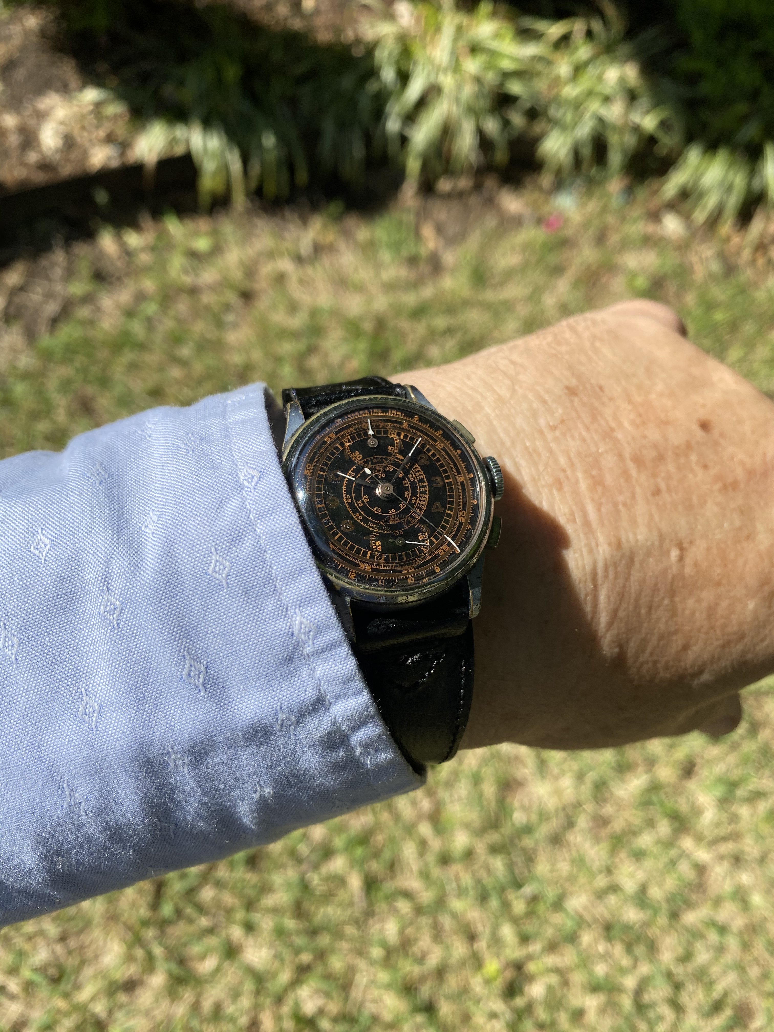 Hanhart fliegerchrono today. The left edge of the bezel - in particular- shows the wear of nearly 80 years of use. It鈥檚 a Beautiful, early spring day in the northeast US of A.