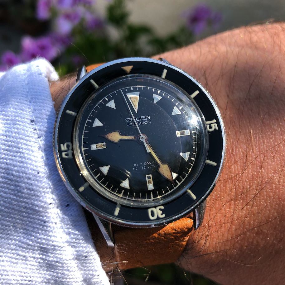 Posts 479 Likes 1,548 MoclovFlop ·Apr 20, 2021 Gruen Ocean Chief with a custom made bezel and custom concave bakelite style insert since the original bezel doesn't exist as a spare. Hands were also relumed by yours truly. I think it works quite well, all things considered.