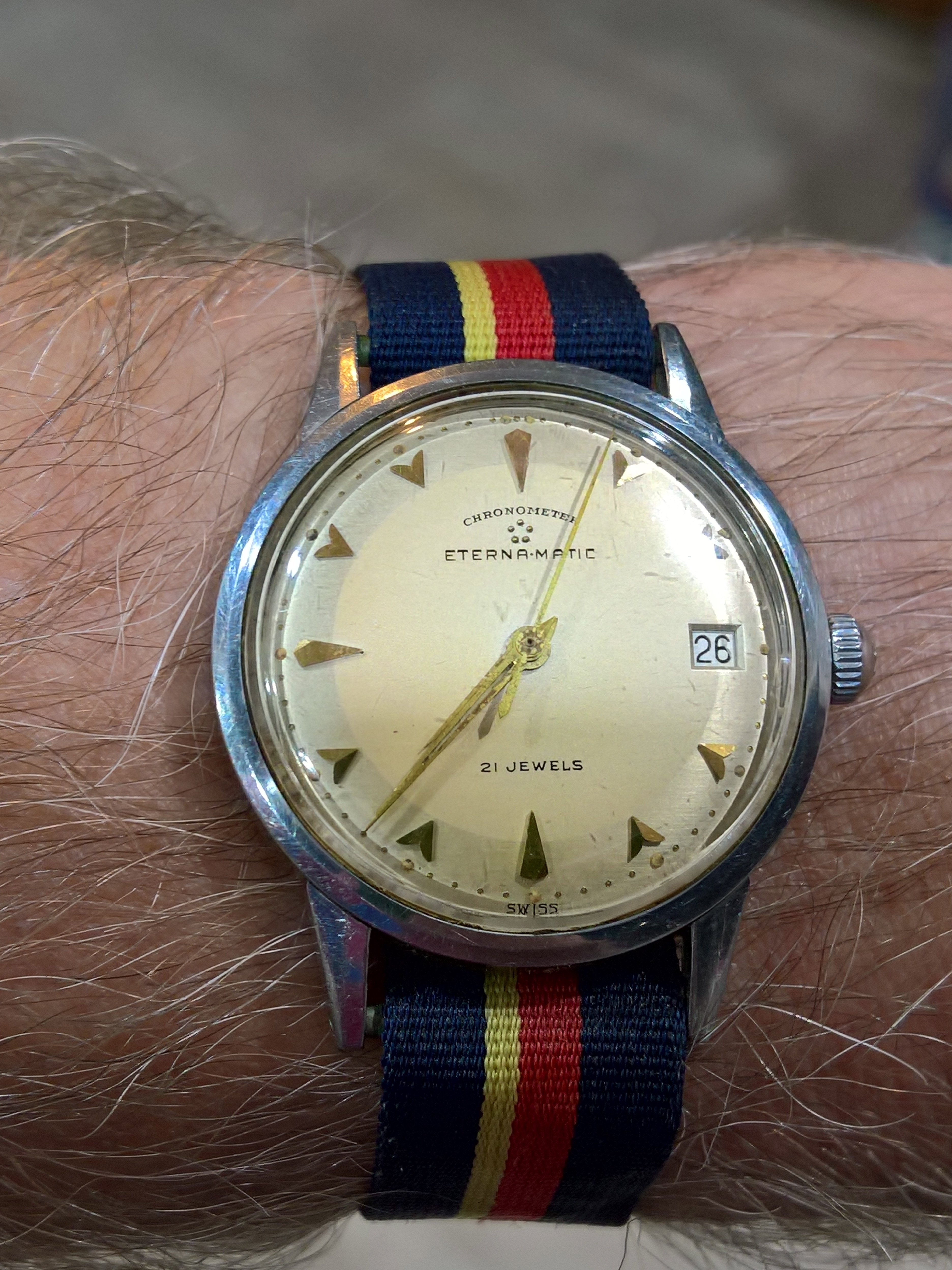 Posts 4,789 Likes 48,149 ghce ·Apr 26, 2021 Had this a couple of months but never got around to putting a strap on it, purchased it from my watchmakers collection. I am suffering from a shortage of straps ( thanks covid 19) and this one came off another recent Roamer purchase.