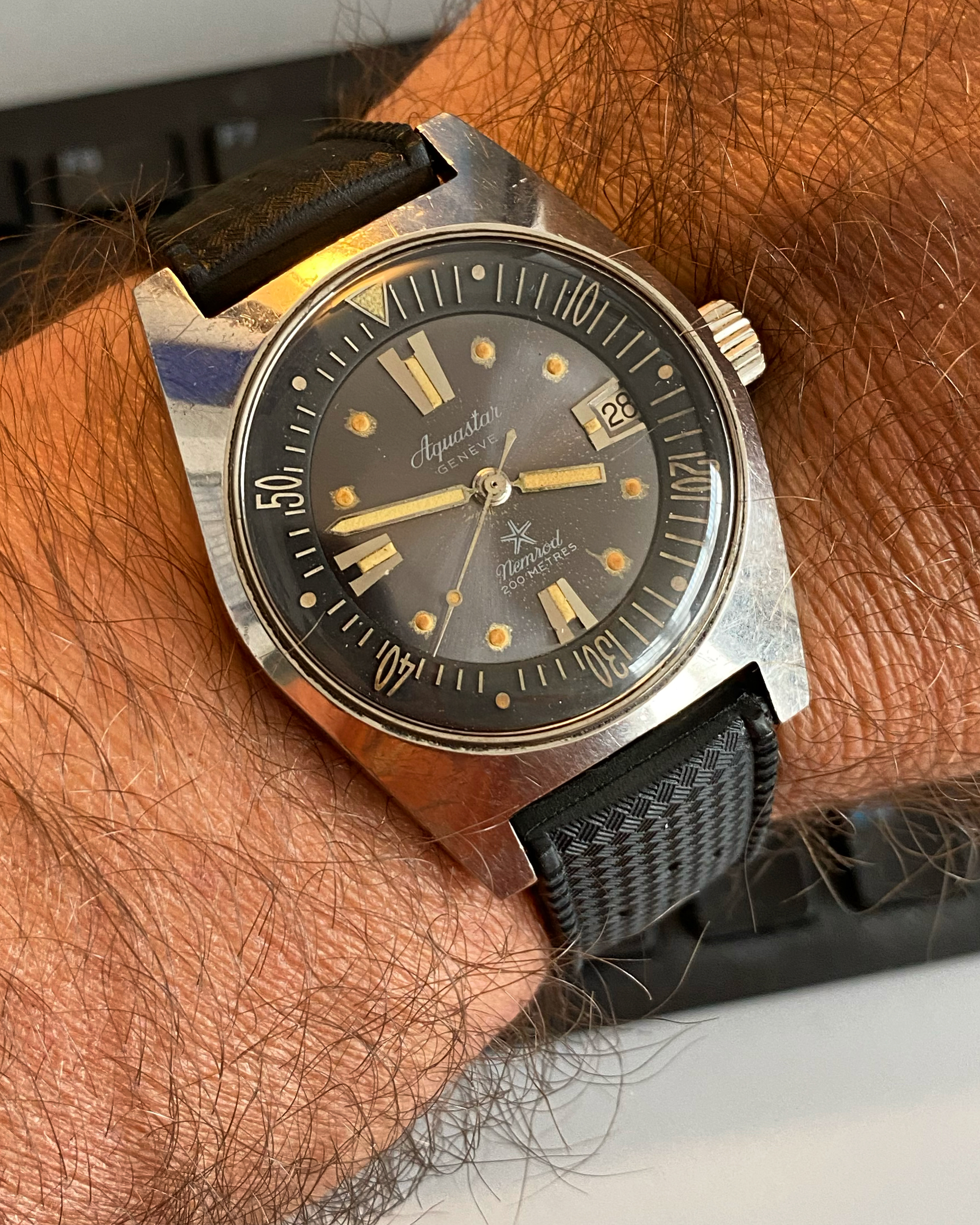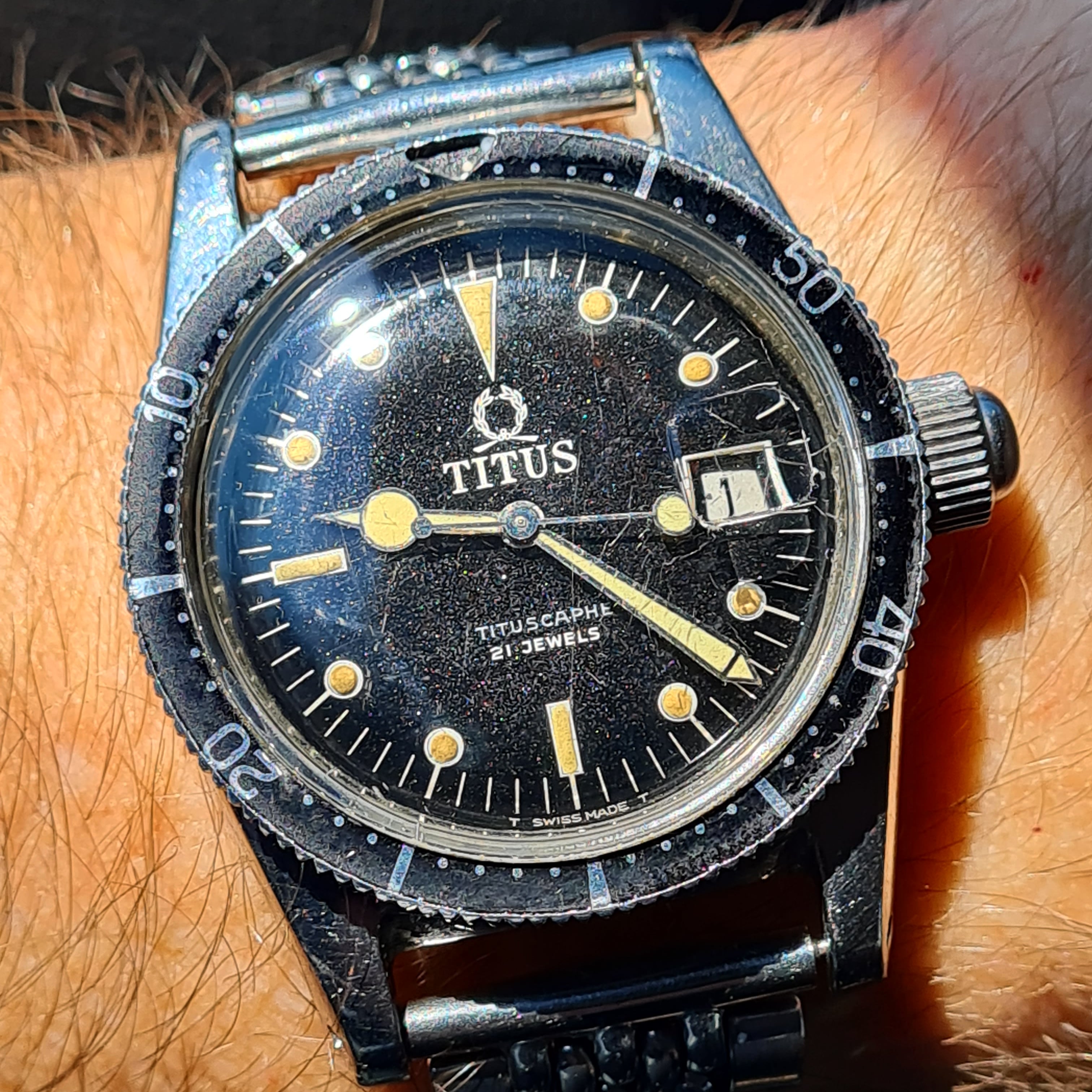 K Posts 284 Likes 2,347 KP-99 ·Apr 28, 2021 An old Titus diver today. It is known as Titus Calypsomatic Ref. 7085 big crown, but this is one of two known watches with a "Tituscaphe" instead of Calypsomatic on dial. And it is the only Tituscaphe with big Titus logo. Edited: Apr 28, 2021