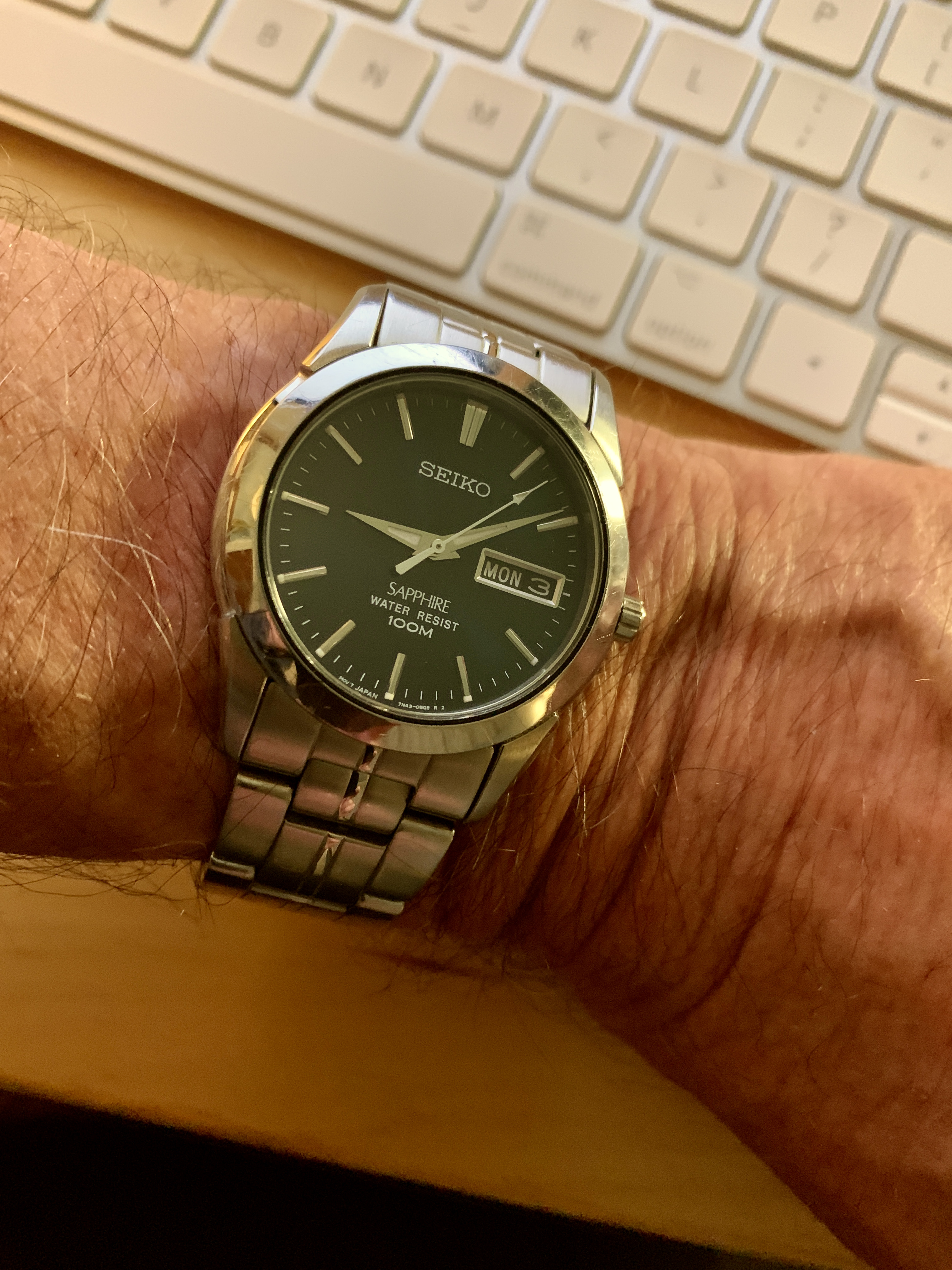 My first decent watch, purchased new while in a layover on Singapore back in 1992. For years, I kicked myself for getting a quartz watch and not an automatic, but I quite like it now.
