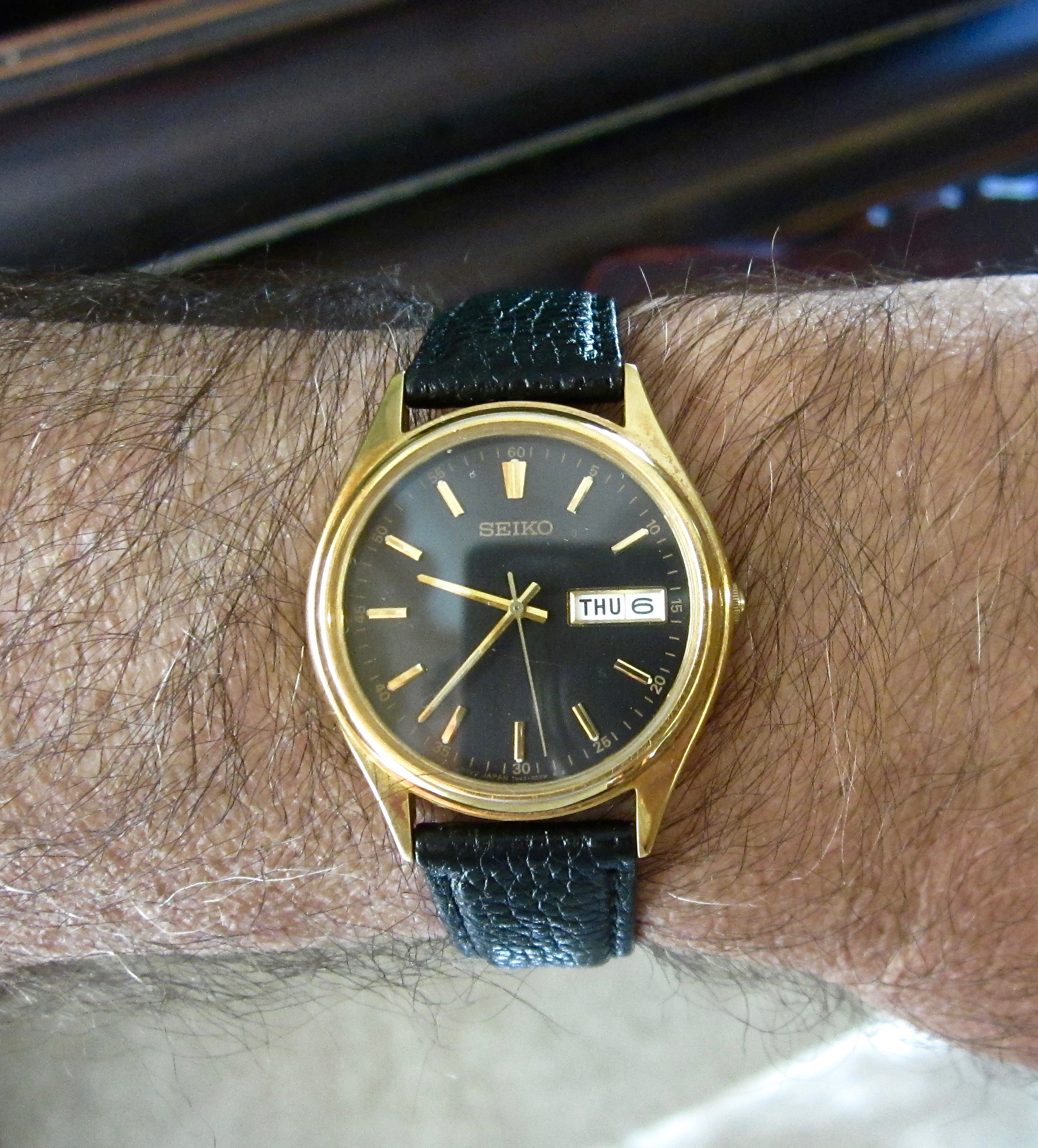 Am no fan of quartz watches, yet have had this Seiko since the late 1990s when a long suffering Mrs. Noelekal gave it to me as I was departing on a trans Atlantic trip so I would have a dependable watch. We'd both traveled in England and France a year or so before and she took a dim view of the vintage watch I was wearing that went haywire on that trip. I'm sentimentally attached to this quartz watch, the newest watch I own.