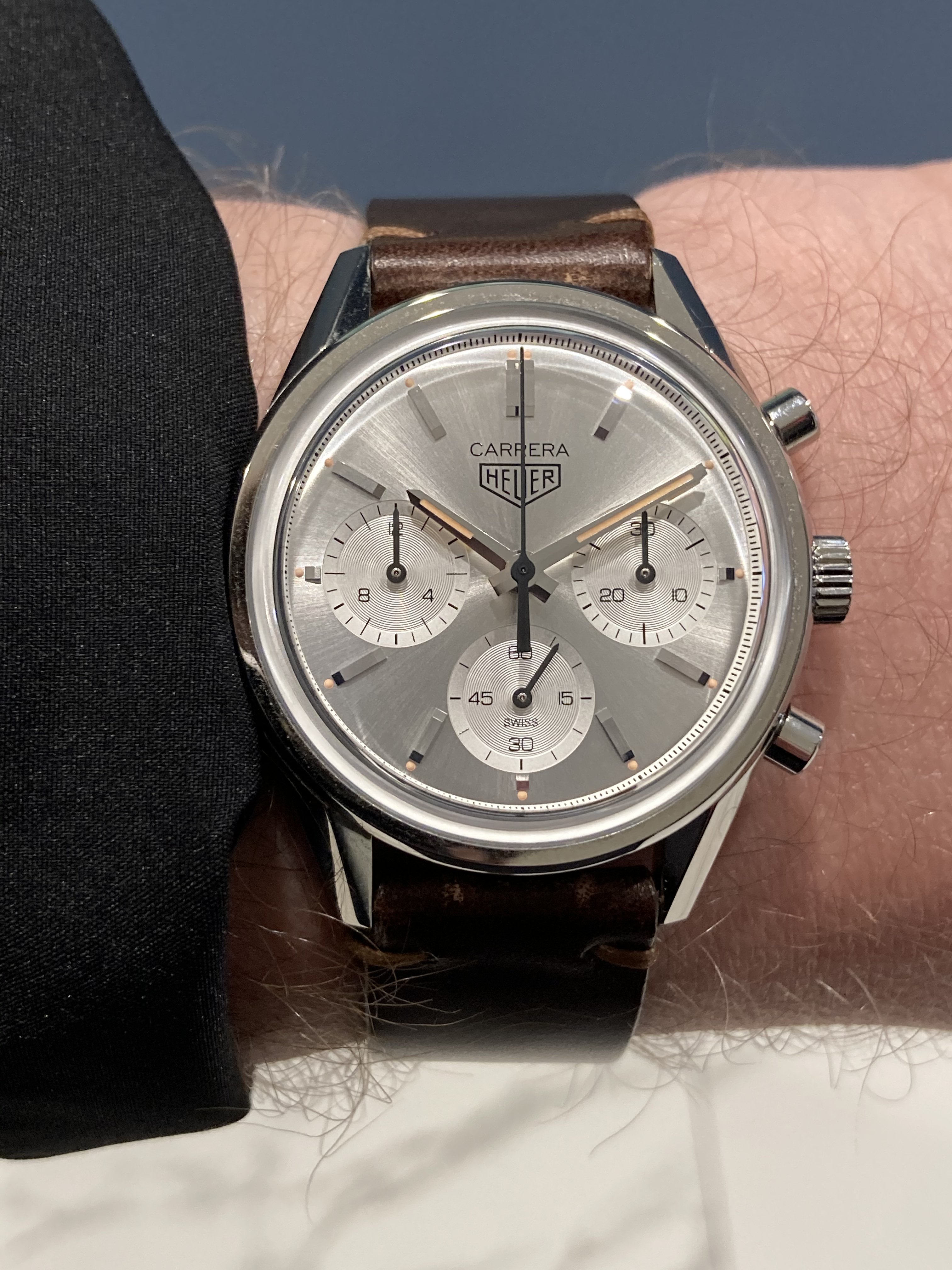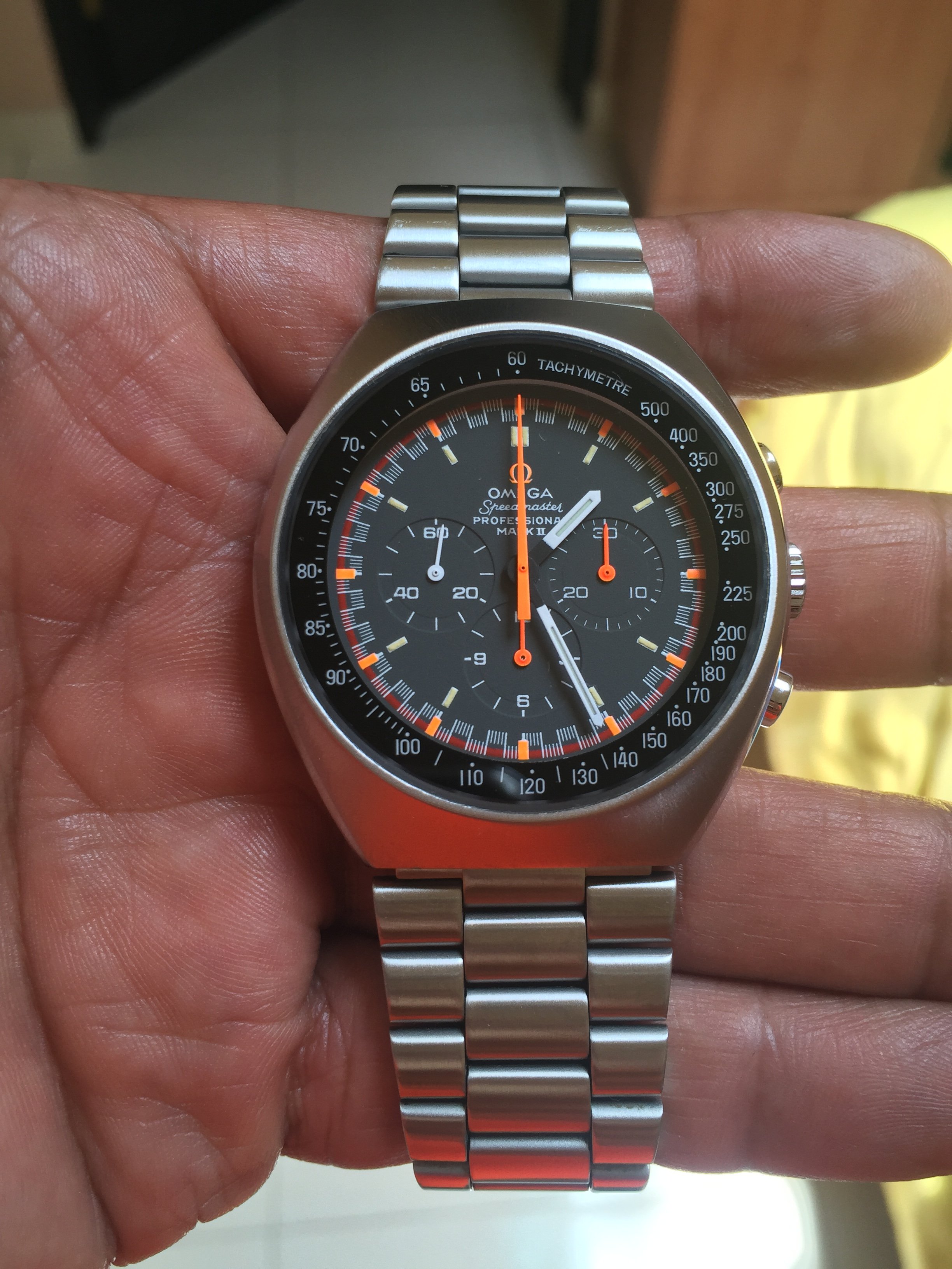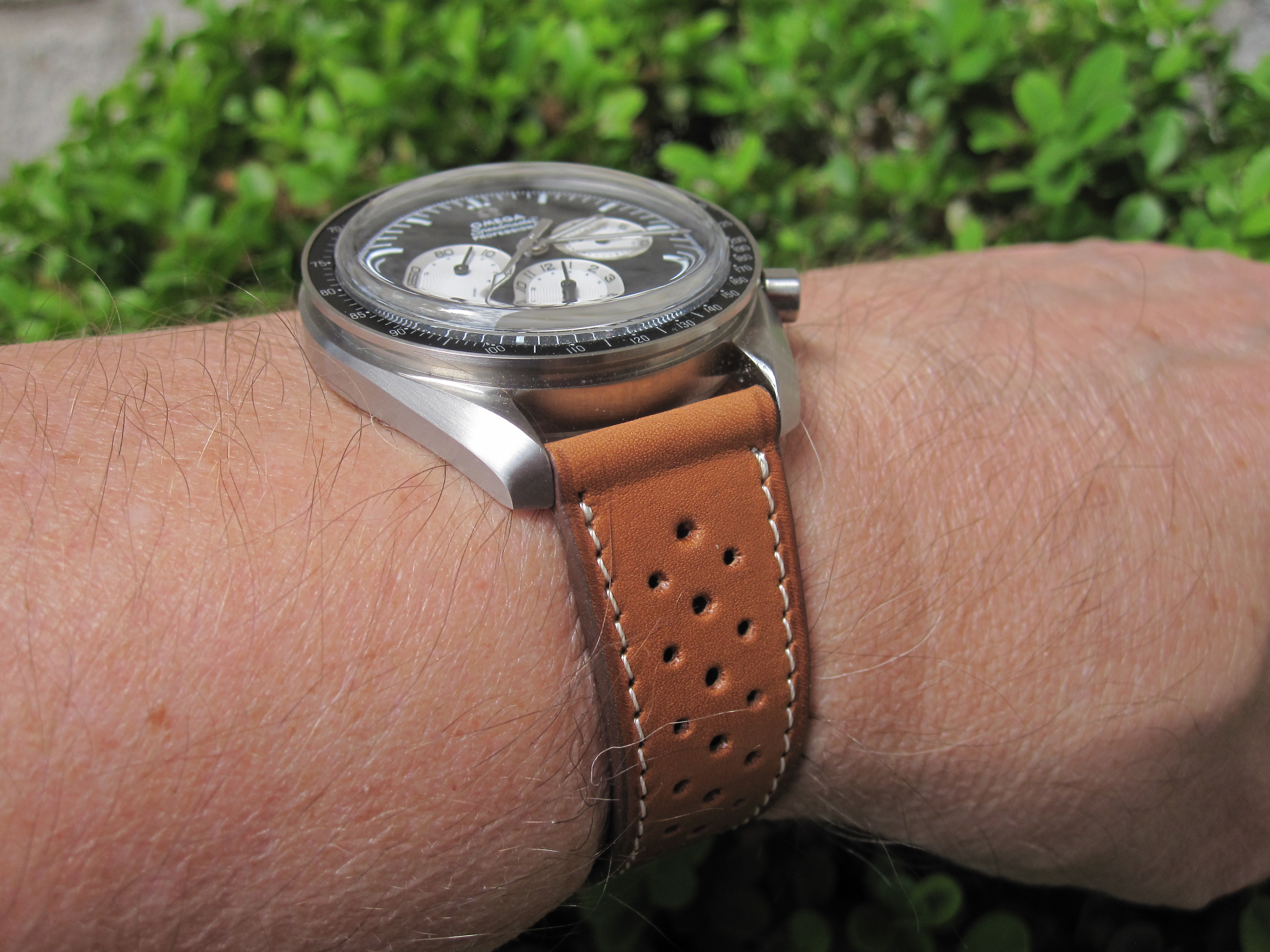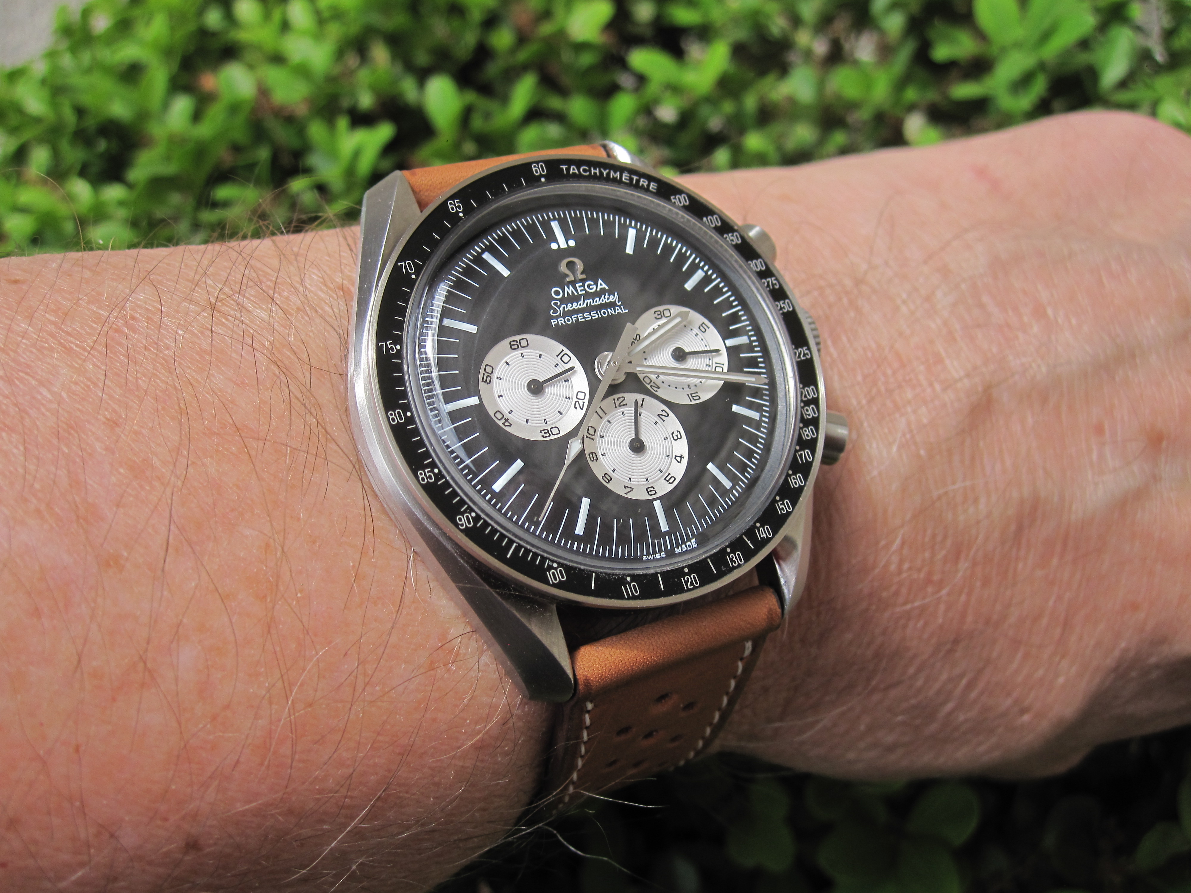 ST#1 .... one of the best looking LE's that Omega has made. Looks a lot different in person because almost everything is brushed, including hands. About the only polished items are the applied Omega logo on dial and the crown logo. Here on a tan LUGS rallye calf strap.
