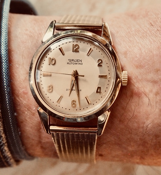 Giving the Air-King Date a rest. Dug out my late 1950s Gruen automatic. With a 14-karat gold shell on stainless steel case, 23-jewel, German made Durowe movement. Many years ago, I offered this watch for sale. Glad it didn鈥檛 go. I quite enjoy it. Good performer after conditioning.