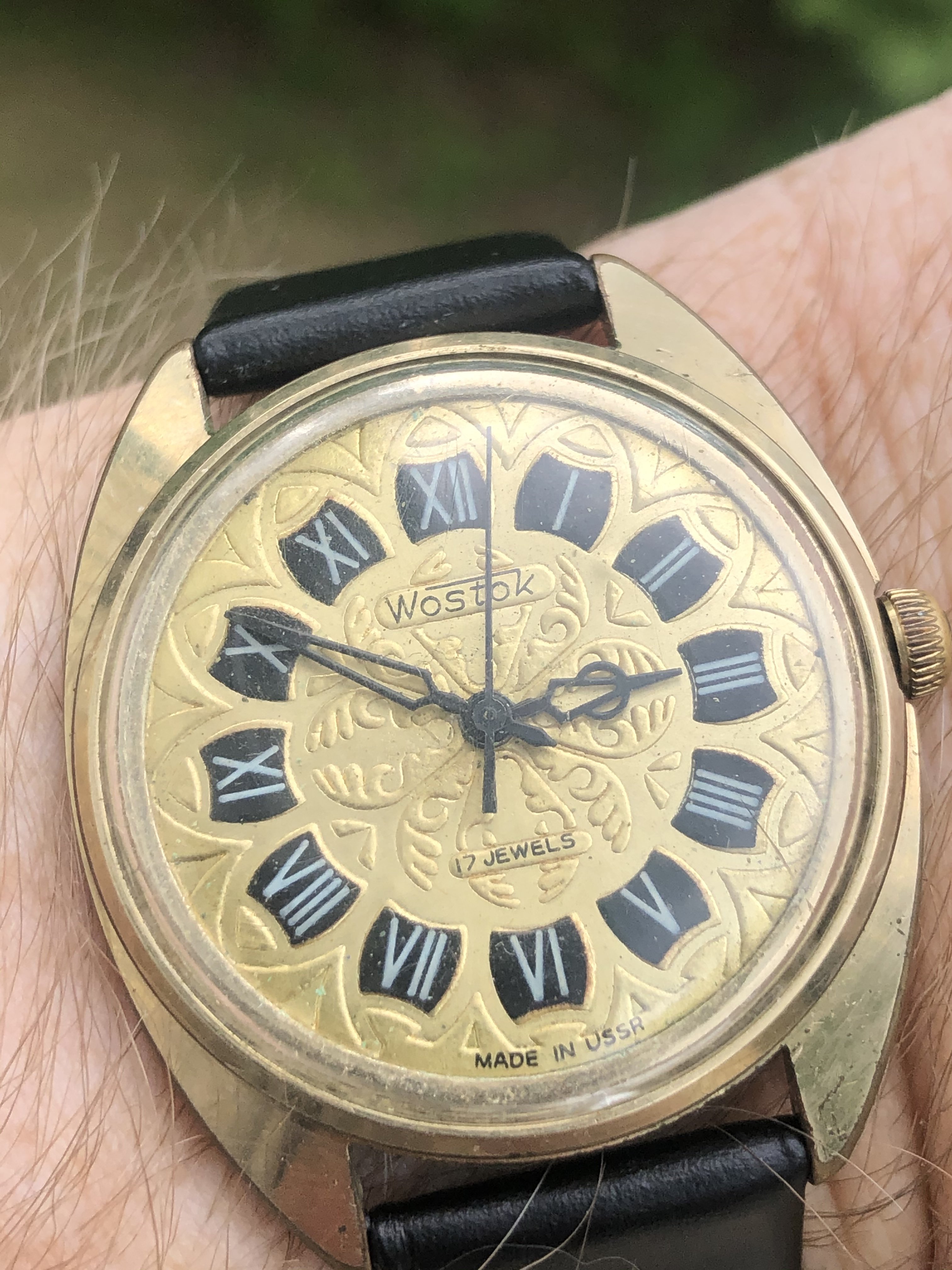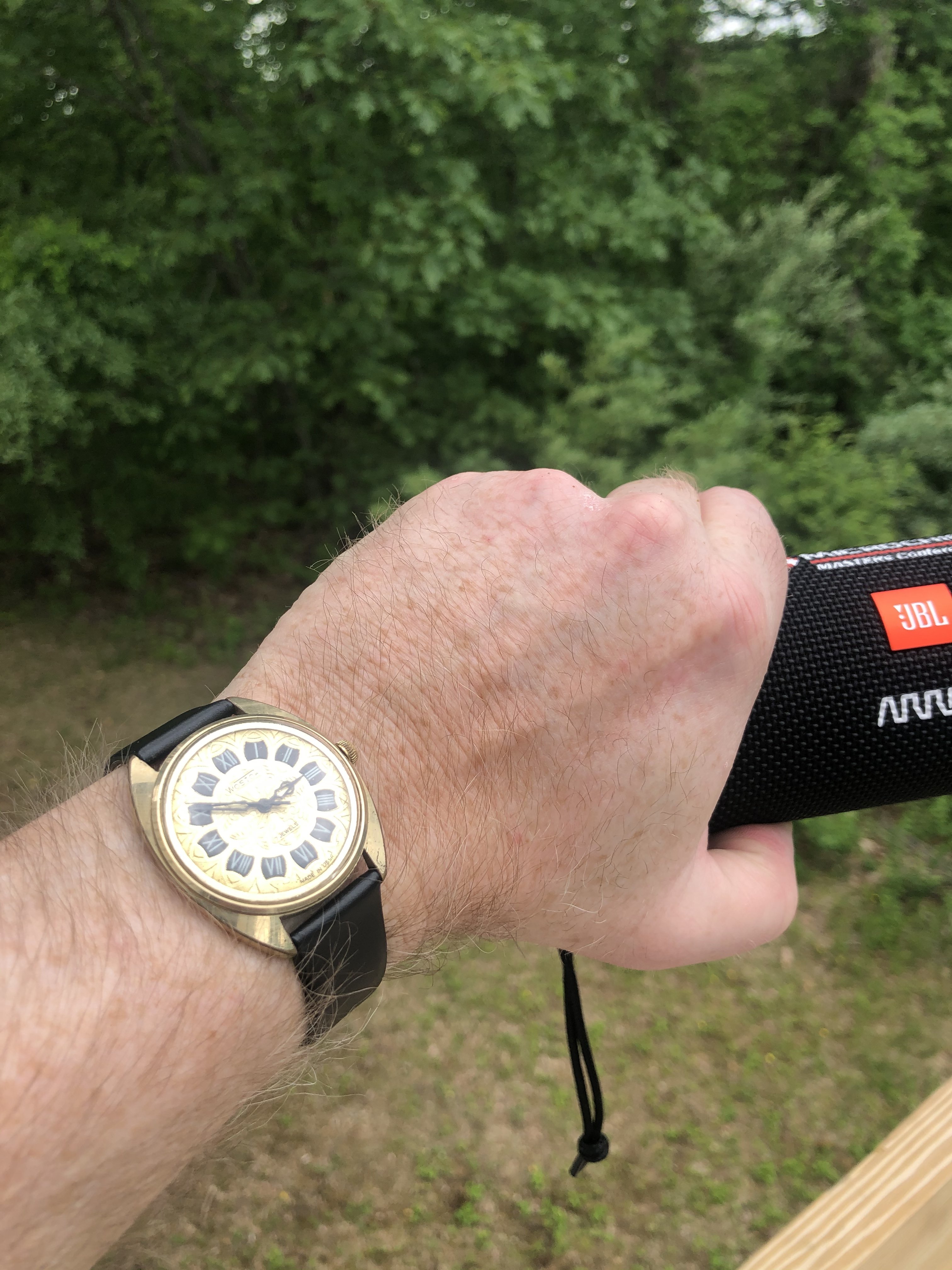 Decided to kick it up a notch today. Very dressy redial vintage Vostok. You know when you buy a twenty dollar watch from the Ukraine shipping included the quality is real. Although this JBL Bluetooth speaker my wife won in some company BS thing has some crazy sounds, nothin left to do but smile smile smile m