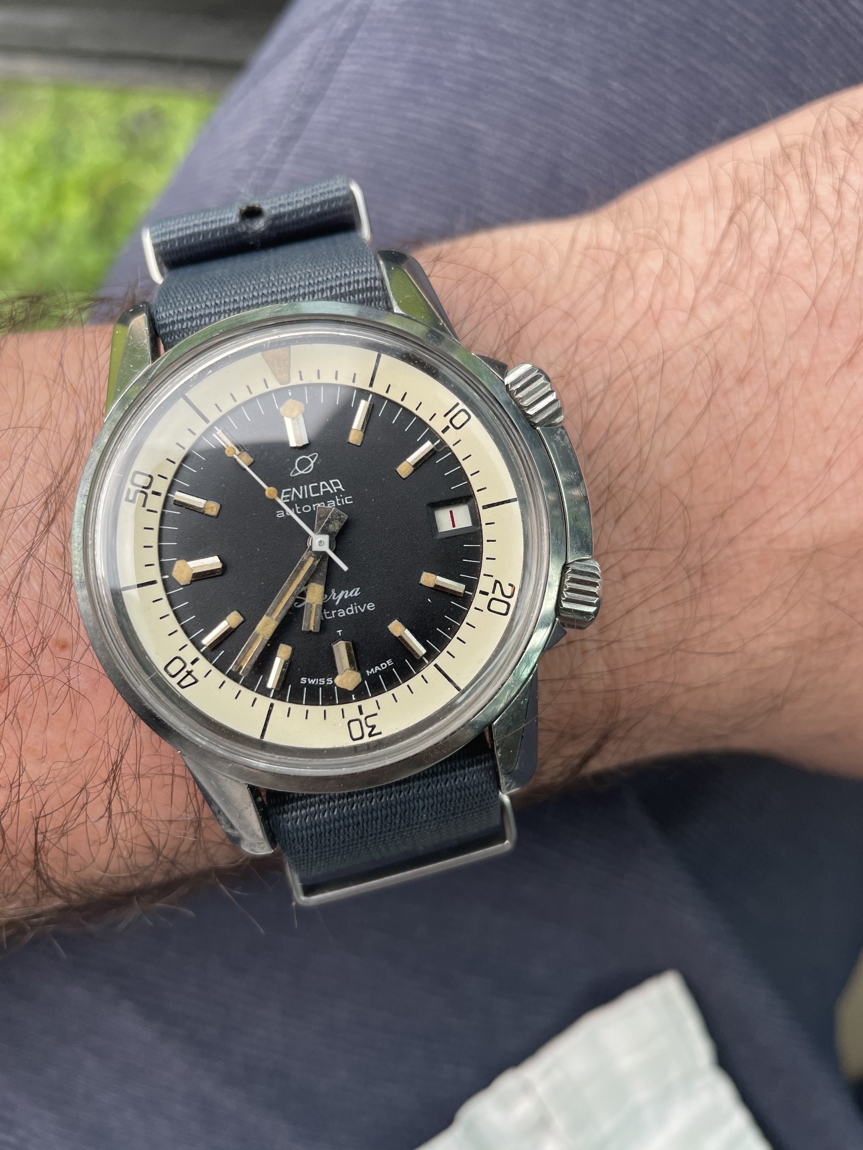 Posts 1,957 Likes 25,748 allwoundup ·May 27, 2021 Going with this ETA 2879 powered chunk-o-funk Nivada “Antarctic” today, circa 1969.