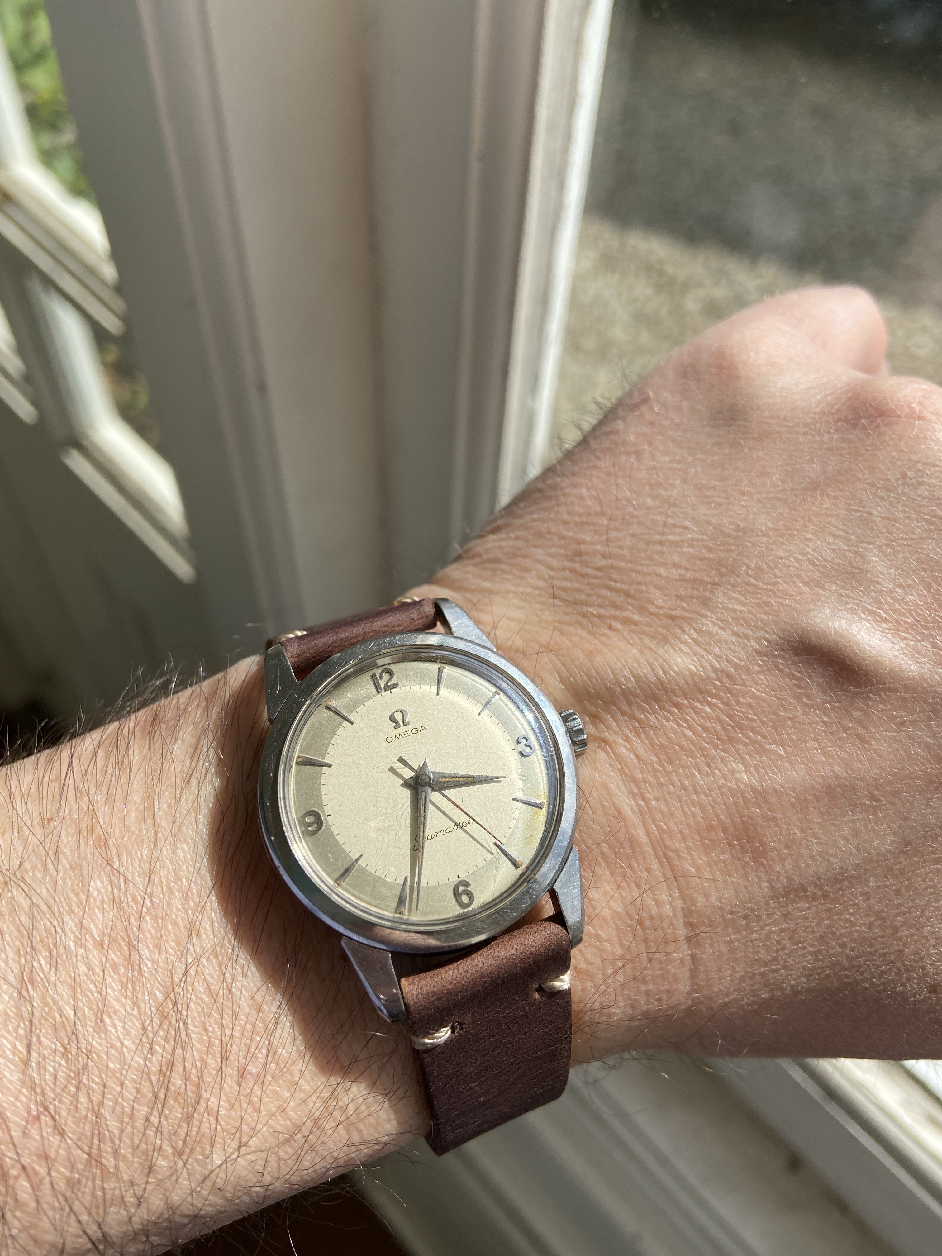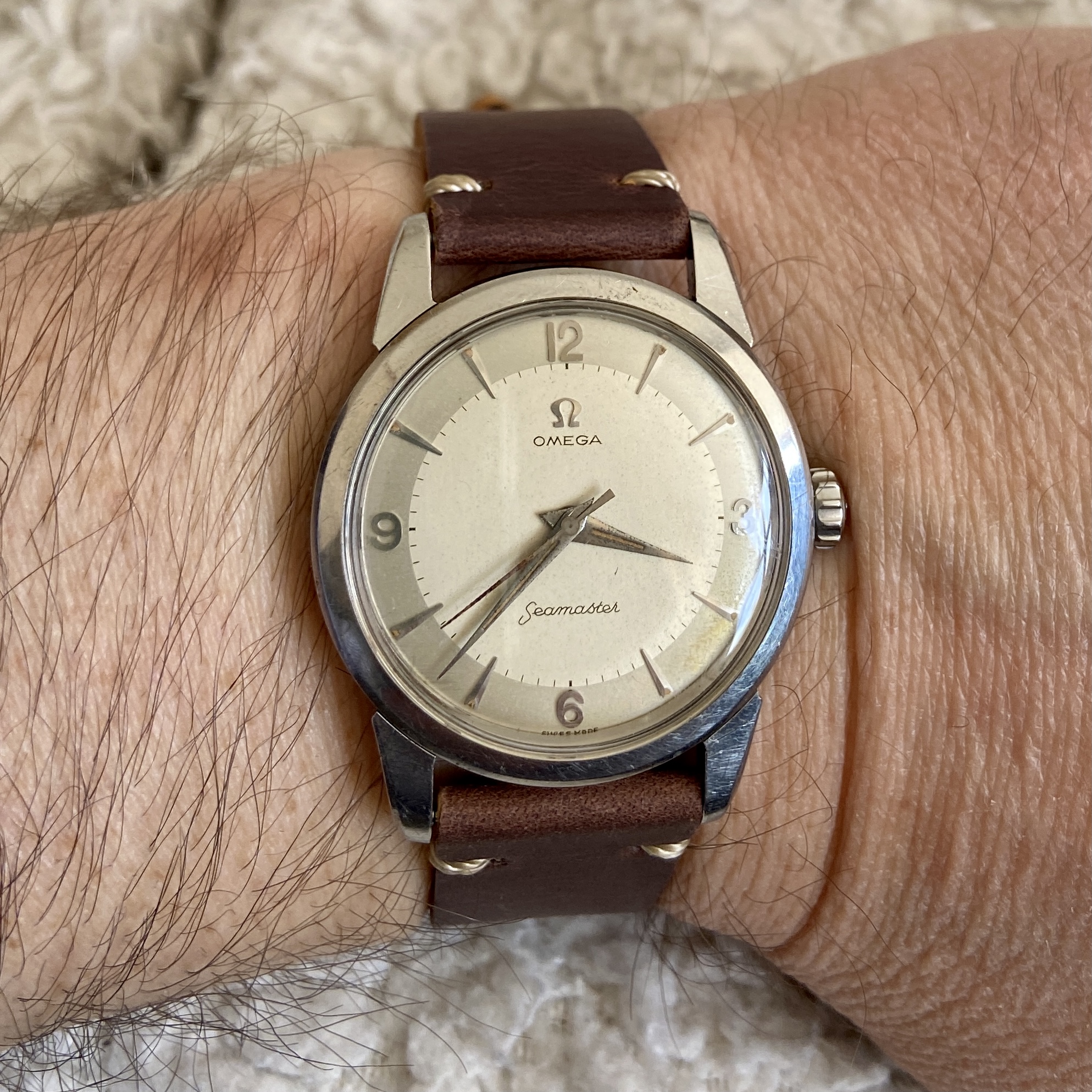 Posts 10,458 Likes 16,356 padders ·May 27, 2021·Oooo subtitles! Just back from a very prolonged Spa visit. Dennison cased fat lug Seamaster with 420 manual wind movement, dated to around 1958. Crown though unusual for at fatty is original for the UK models I believe. Edited: May 27, 2021