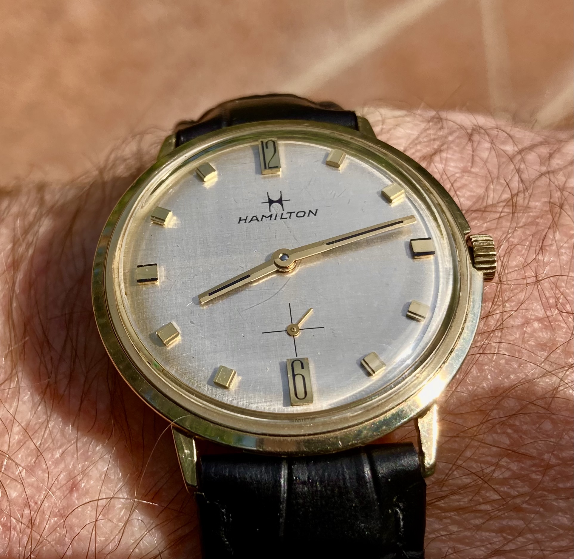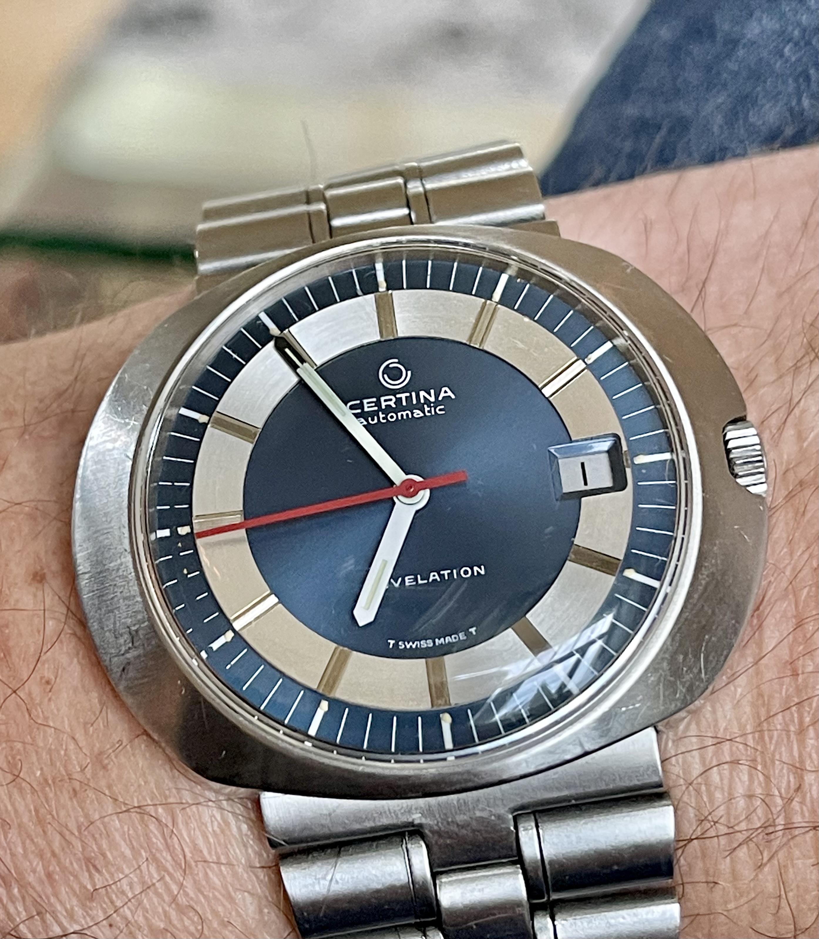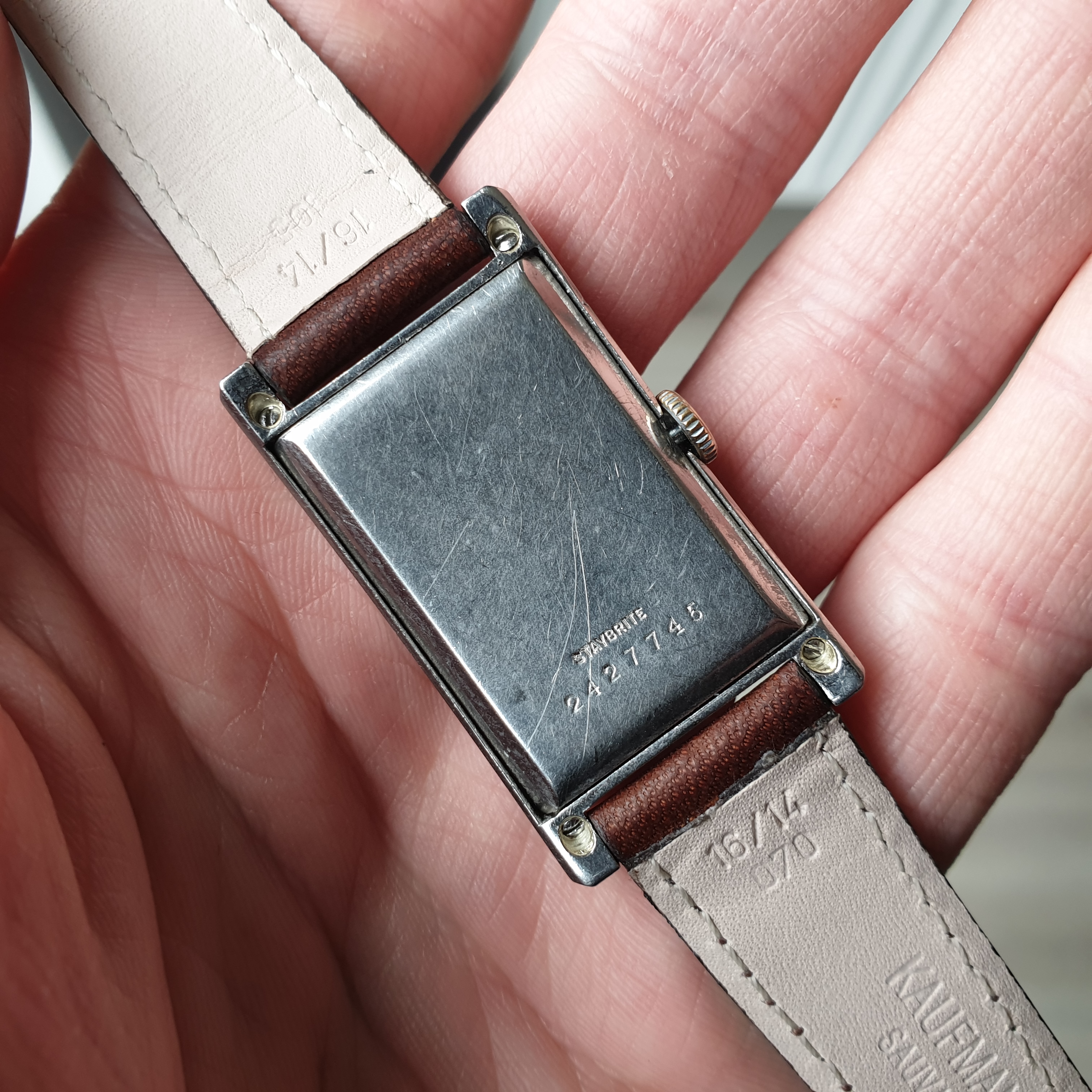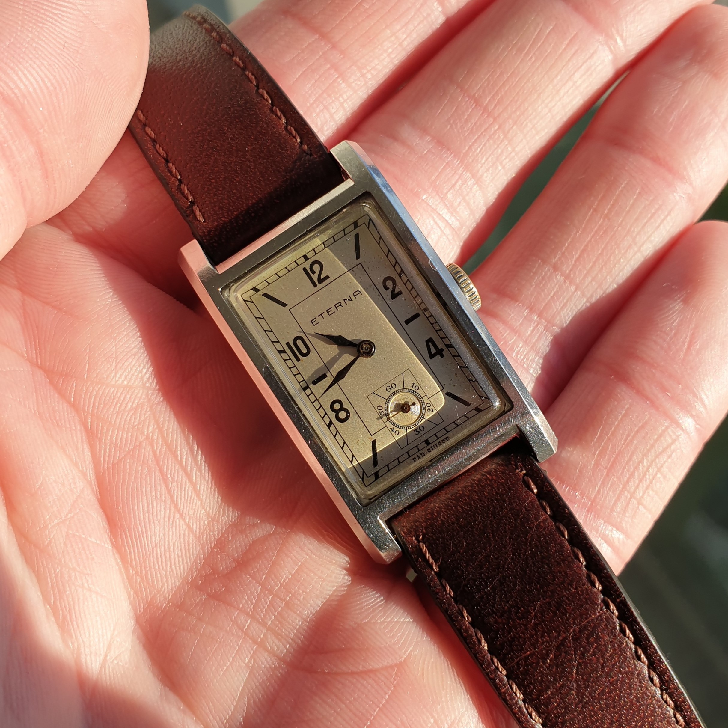 Now for an evening switch to something special: this 1931 Eterna with Clamshell case in Staybrite material. The very early waterproof case appears unpolished after 90 years in this world, being razor sharp as it is, and it boasts drilled lug holes.