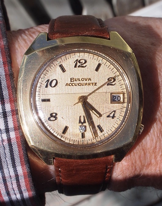 This watch was produced by Bulova in 1973, so he only wore it for about 3 years. Since then it has been in my collection, but I doubt I have worn it for one month over those 44+ years. It is a Bulova Accuquartz, model 2241. Bulova was totally unprepared for the quartz watch revolution when it hit in the late 1960s. Bulova Accutron had owned the battery watch market for 15 years, from 1962. Quartz watches had such overwhelming success that Bulova lost market share, trying to compete with Accutron which were far more expensive than most quartz watches. Bulova introduced their own quartz watch, the Accuquartz circa 1971-72. It was just an Accutron, with a quartz oscillator added. The writing was on the wall. Bulova folded as a manufacturer within about 4 years after this one was made.