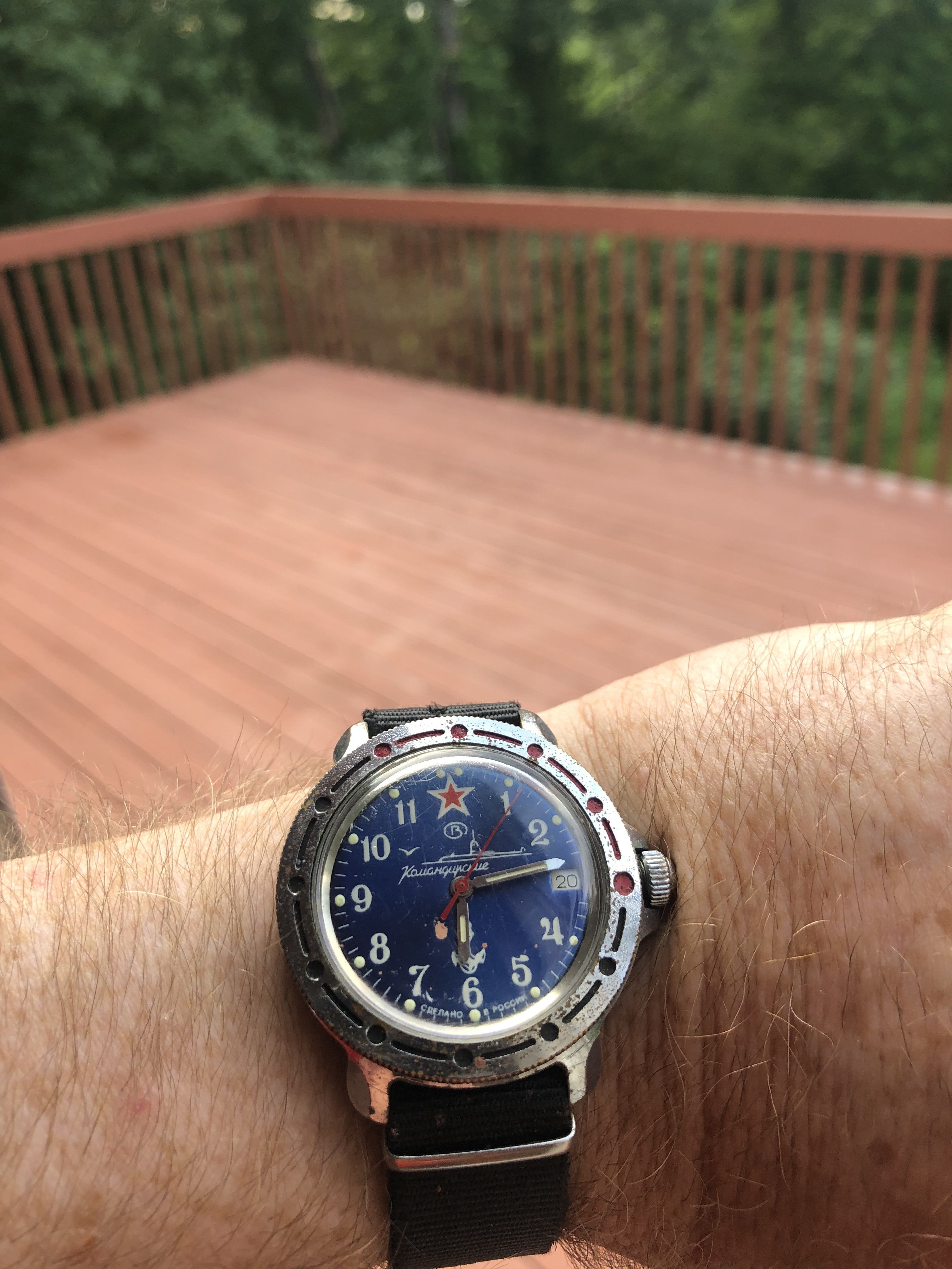 Deck finished with vostok assistance. Odd I’m looking at it only two drops of paint on the 1.50 cent nato and very little on the watch. Wore it the entire staining process. I was not even trying not to get stain on it. I hope everyone had a good weekend mine was not a lot of fun doing this but it’s done, I’ll let it dry see if it needs another coat. It’s funny I think I paid 25 bucks for this vostok but I’d be lost doing things like this without it.