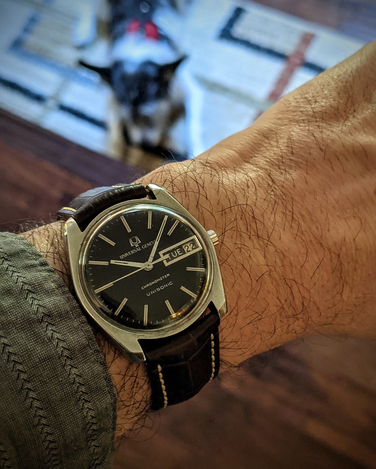 Universal Geneve Unisonic cal 1-52, c.1975. UG's tuning fork movement based on the Bulova 218-1(F). You always want what you can't have, but gosh darn I wish UG had made it through the 70's in one piece (the current zombie shell corp doesn't count...).