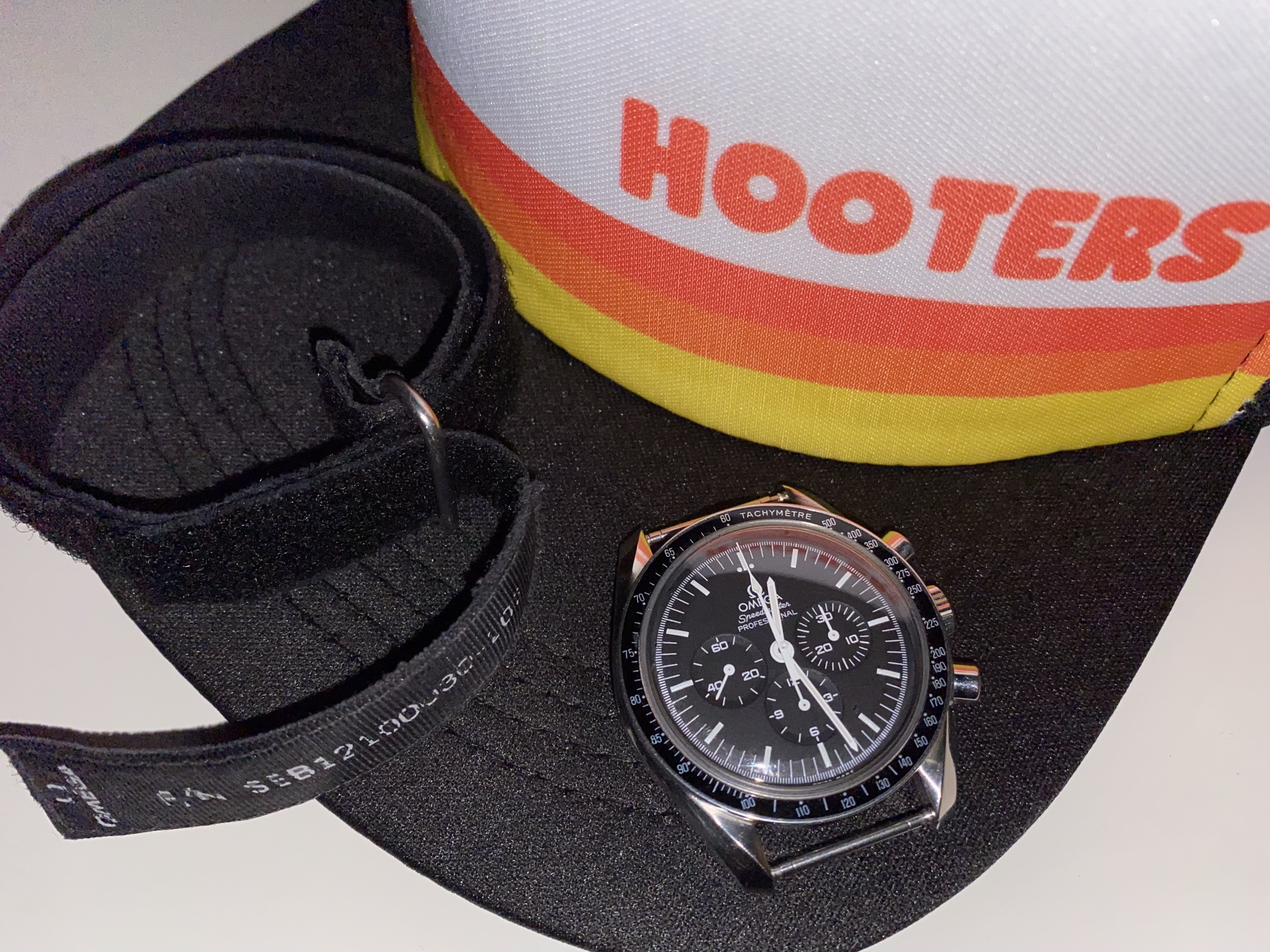 Anyway, I wore my modern Speedy Gonzales Moonwatch with its original Omega replica NASA strap all day…and I got a new Hooters hat tonight which is so “1977” that it looks like a barn door on my head…which I dig. 👍
