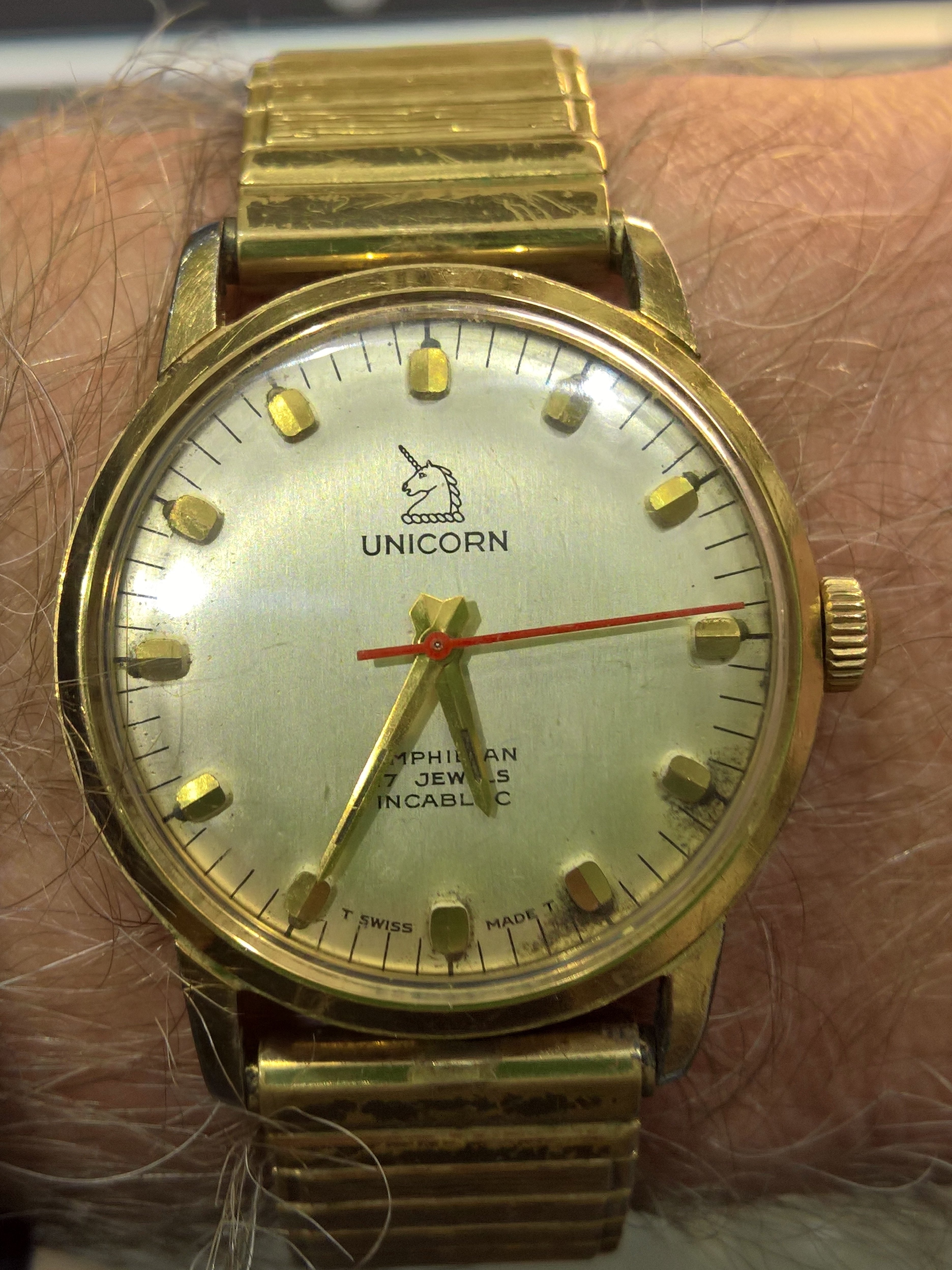 After this mornings Roamer disappointment and returning the watch to my WM he quickly confirmed my problem with his timegrapher indicating more than 30 seconds a day gained, he turned my sorrow into happiness with the 2 watches he had repaired and serviced for me, a Hafis and a Unicorn.