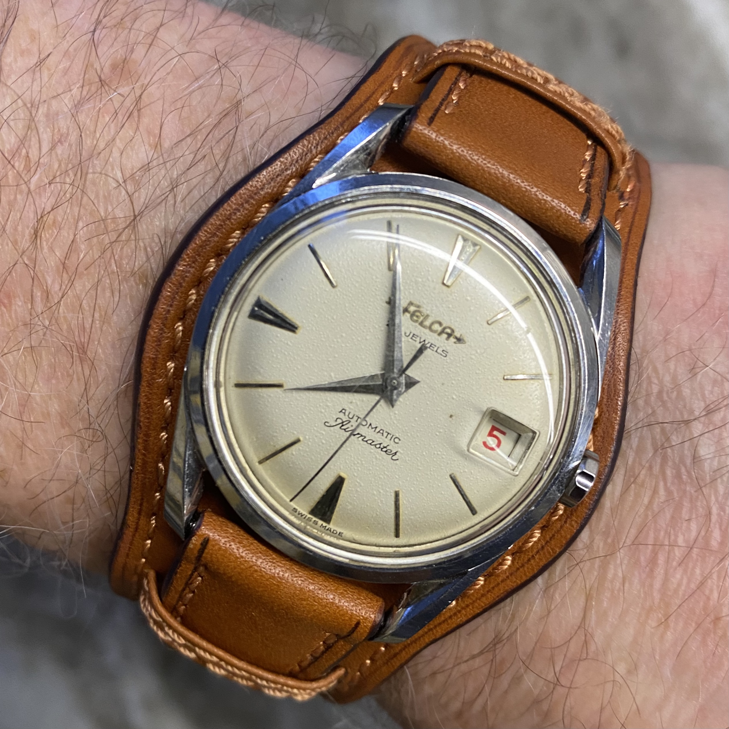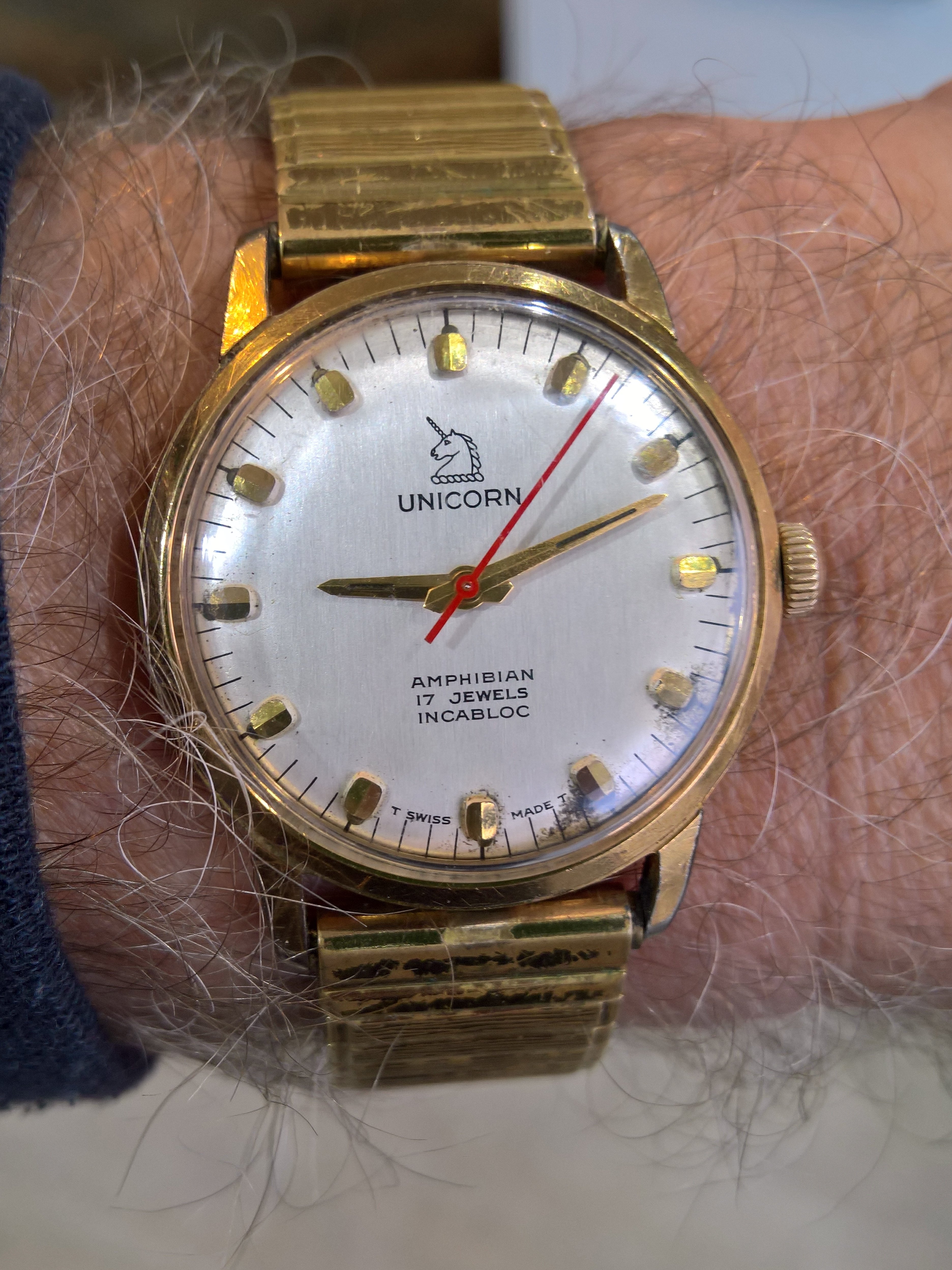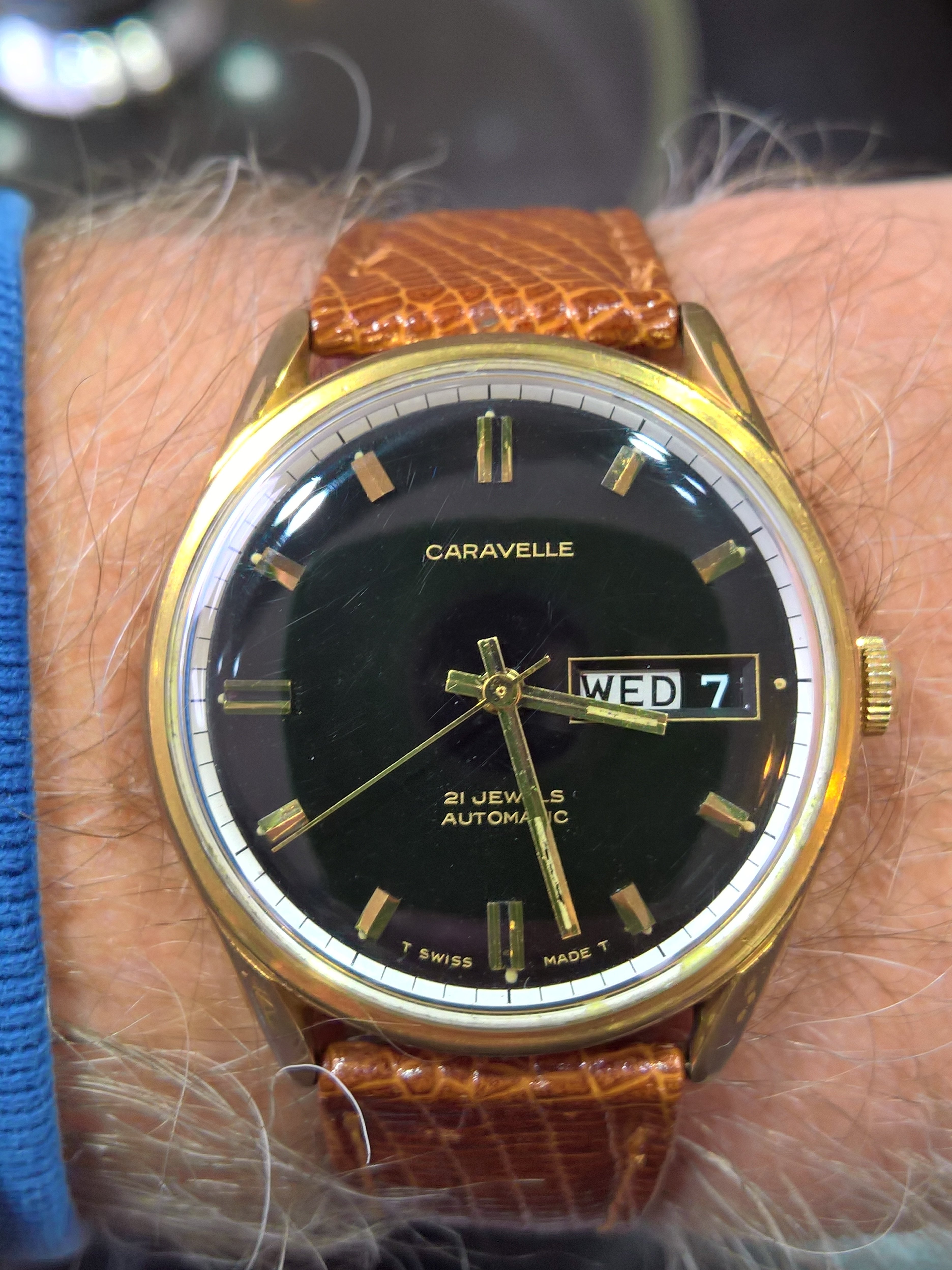 Luckily I had a new strap sitting around that seems to fit it, was wanting a black leather or a gold bracelet but for the moment this looks good and I can get some wrist time with it while I decide which other strap I might want for it.