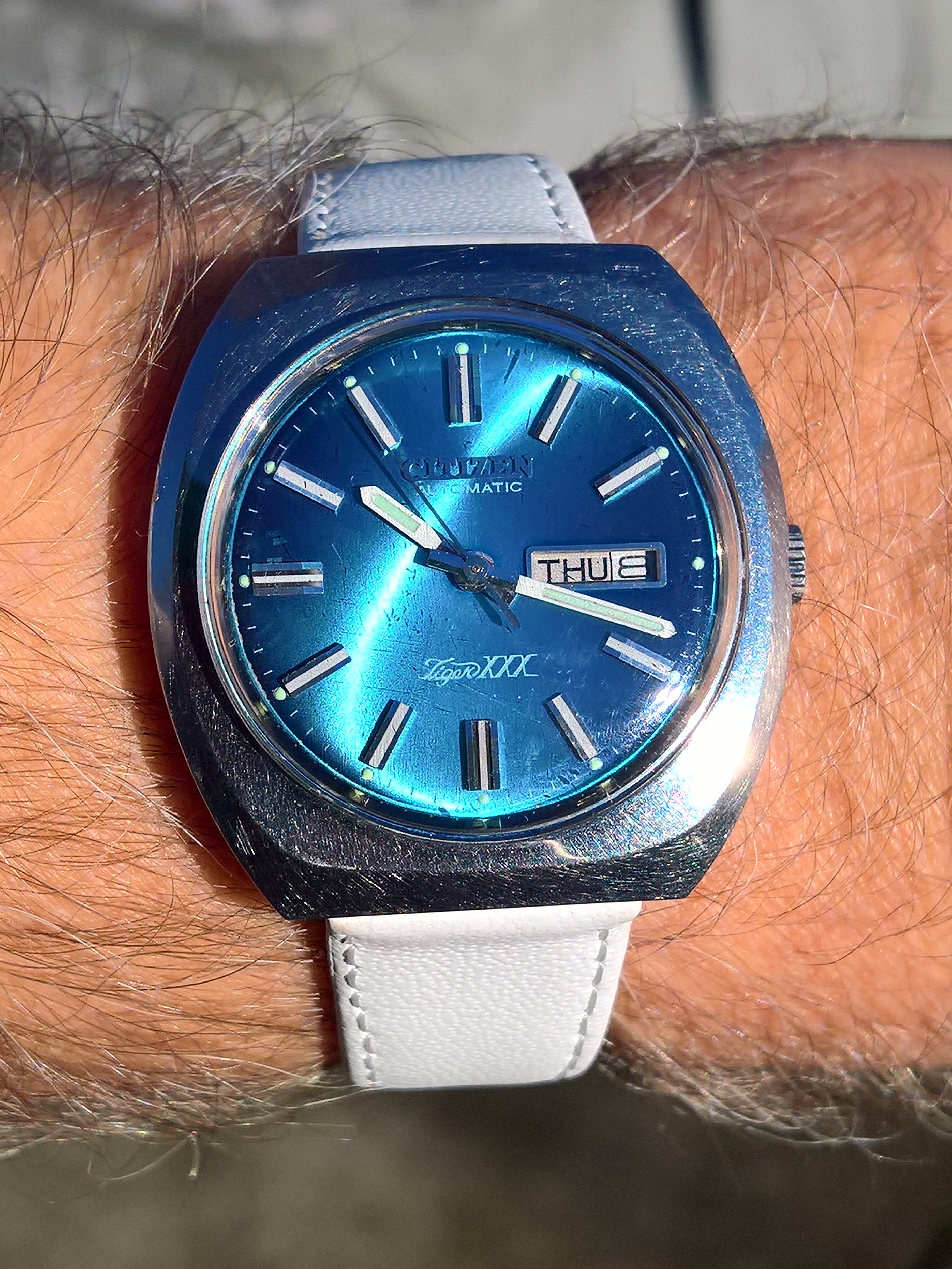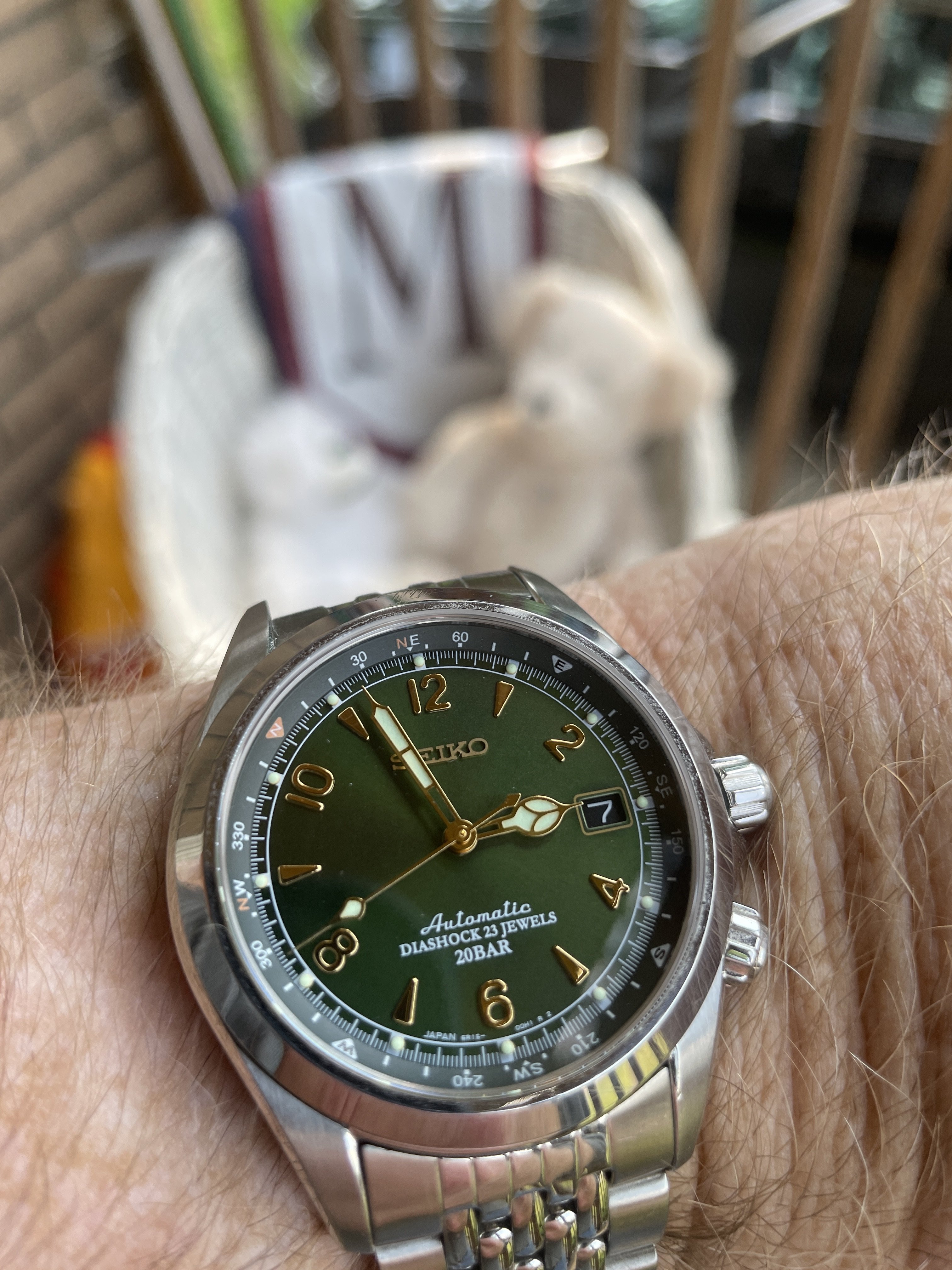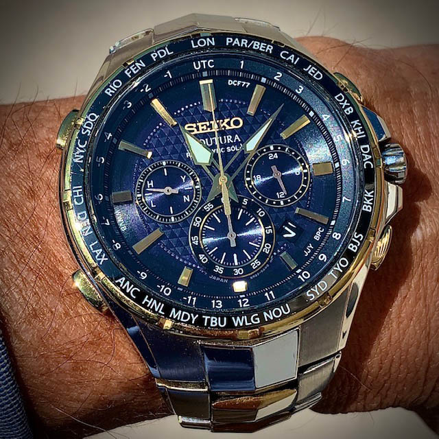 Giving my late father's gi-normous, techno-whiz-bang solar-charged radio-synchronized Seiko some charging time in the sunshine. Kudos to Seiko for coming up with such a comfortable bracelet for a watch of this size and weight -- it's one of the comfortable I've ever worn. No doubt that's one of the reasons my Dad was so enamoured with this watch.
