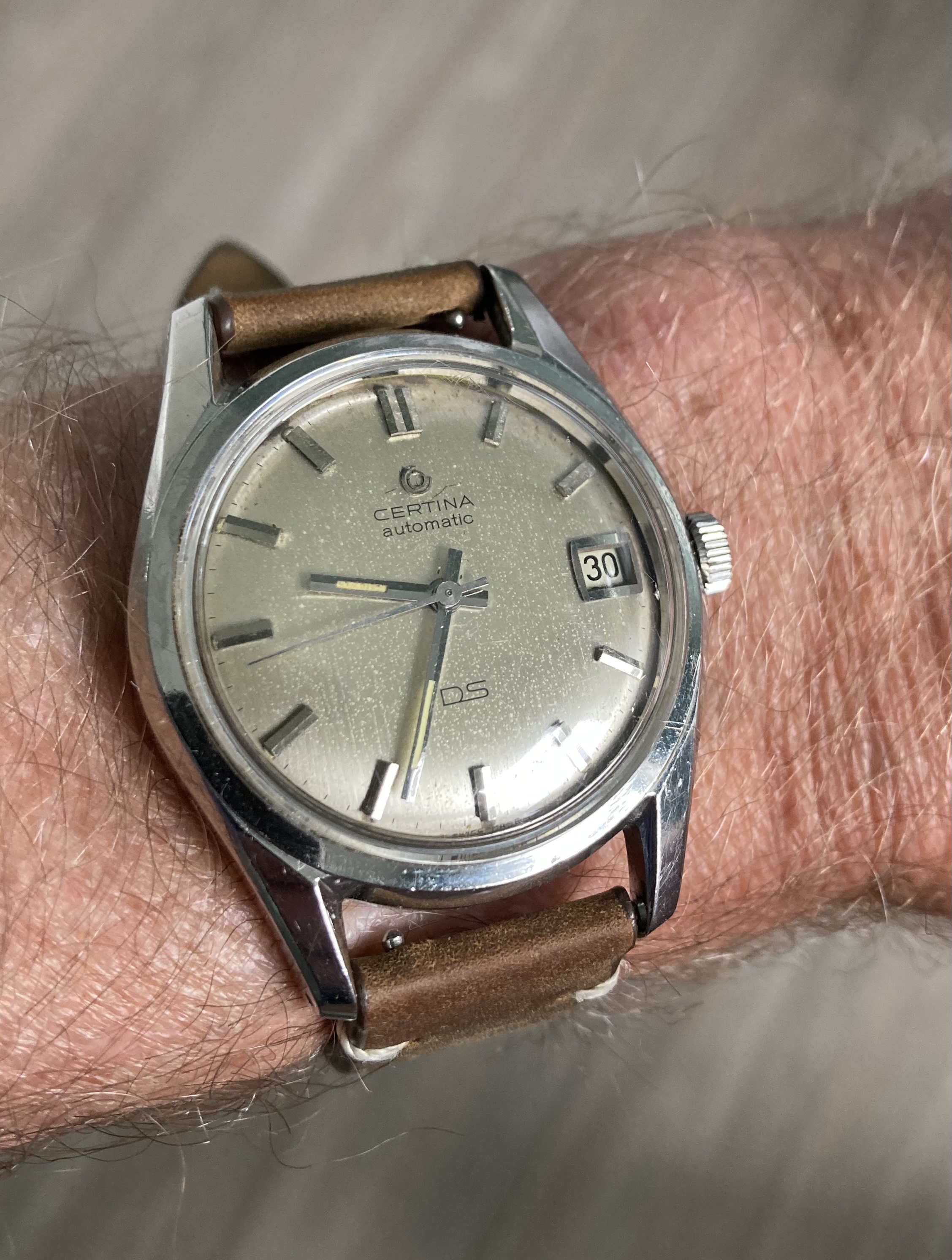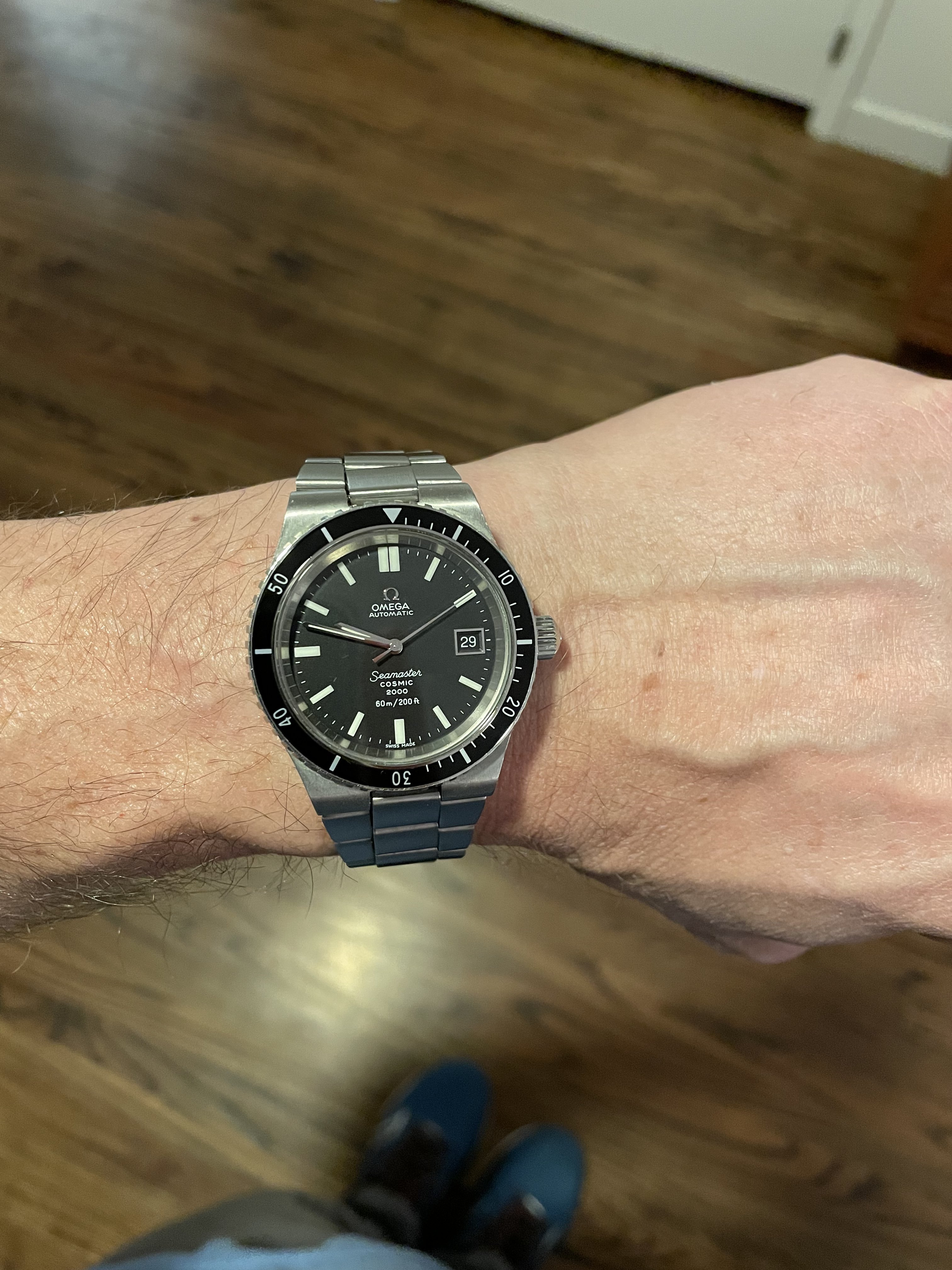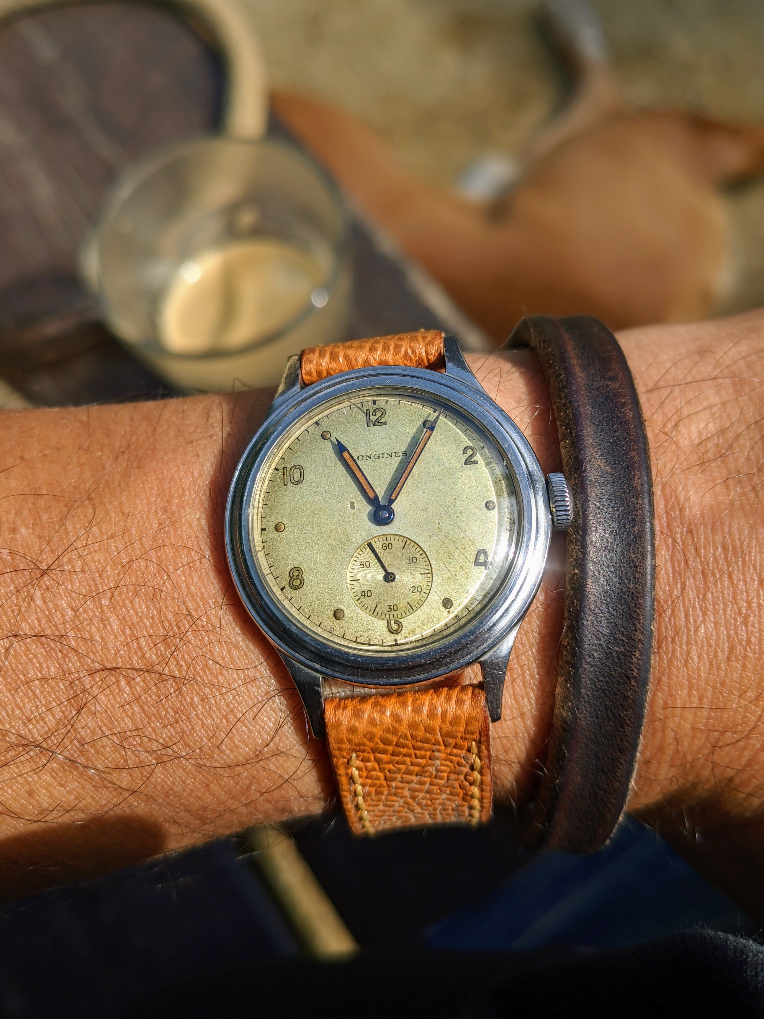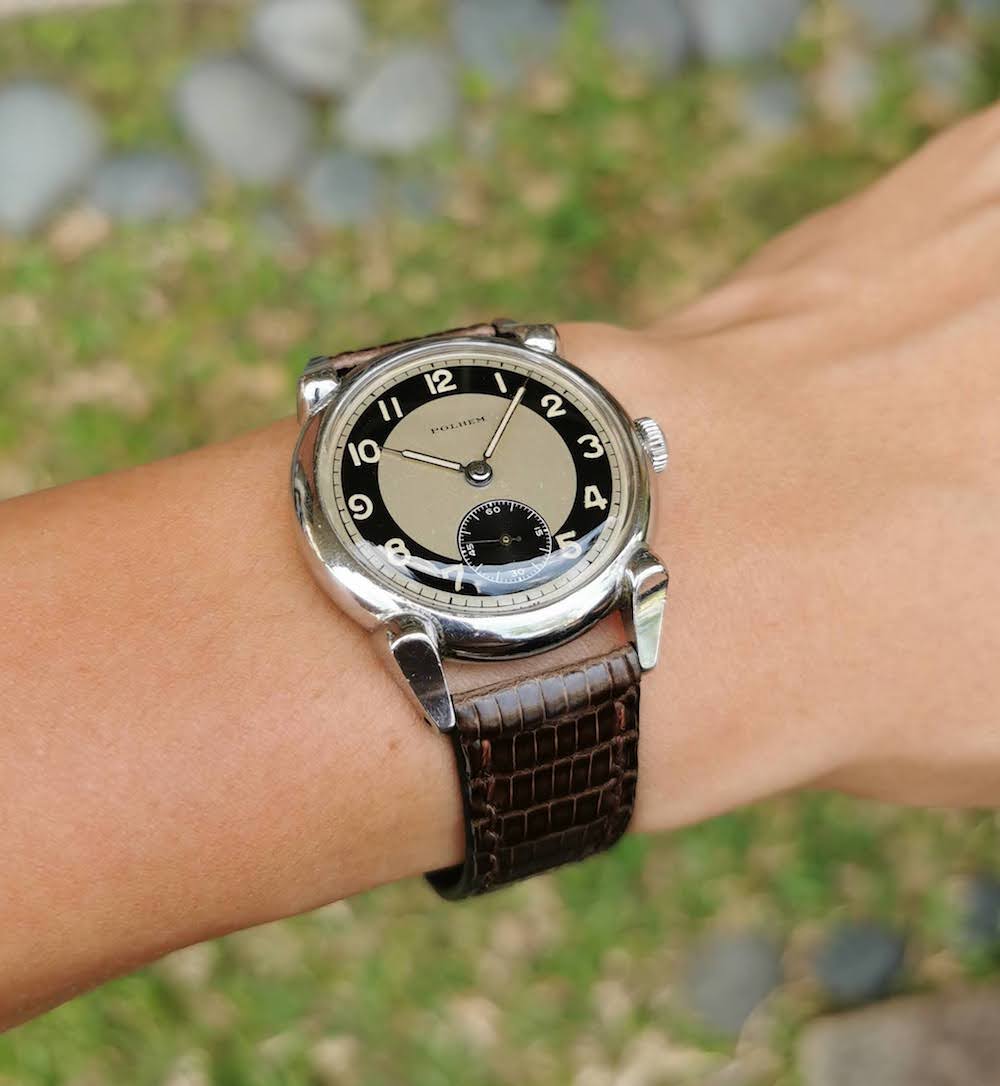 ·Not wearing this (a wee bit too small for me). Estate sale from up the street. It was tarnished and in bad shape. Cleaned it up as best as I could and am giving it to a friends daughter (13 years old who enjoys watches). Hand-wound and working fine. Total cost: $6.00. )
