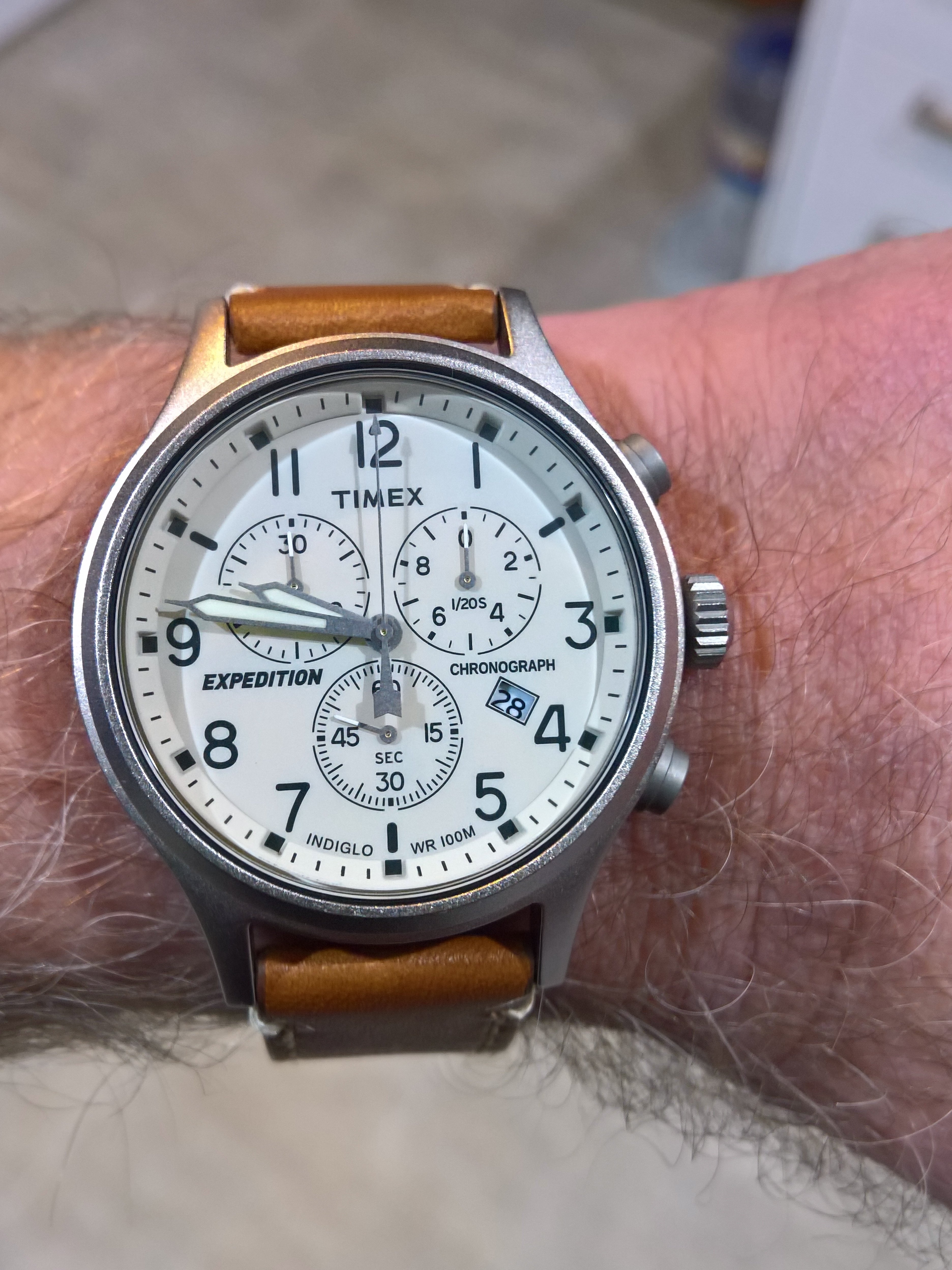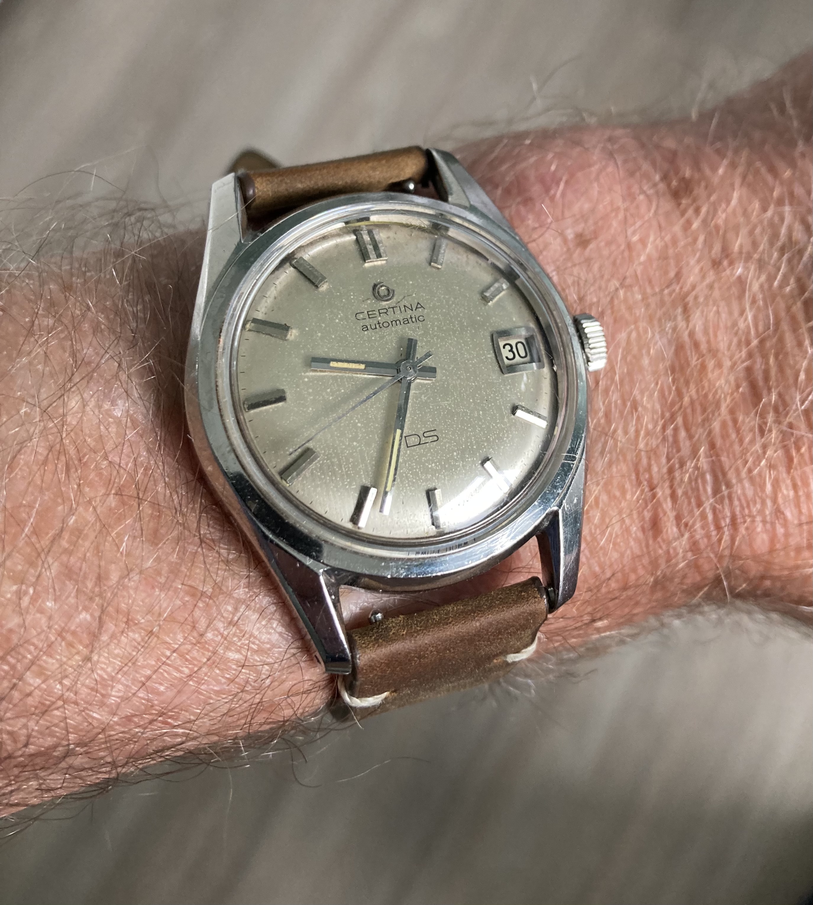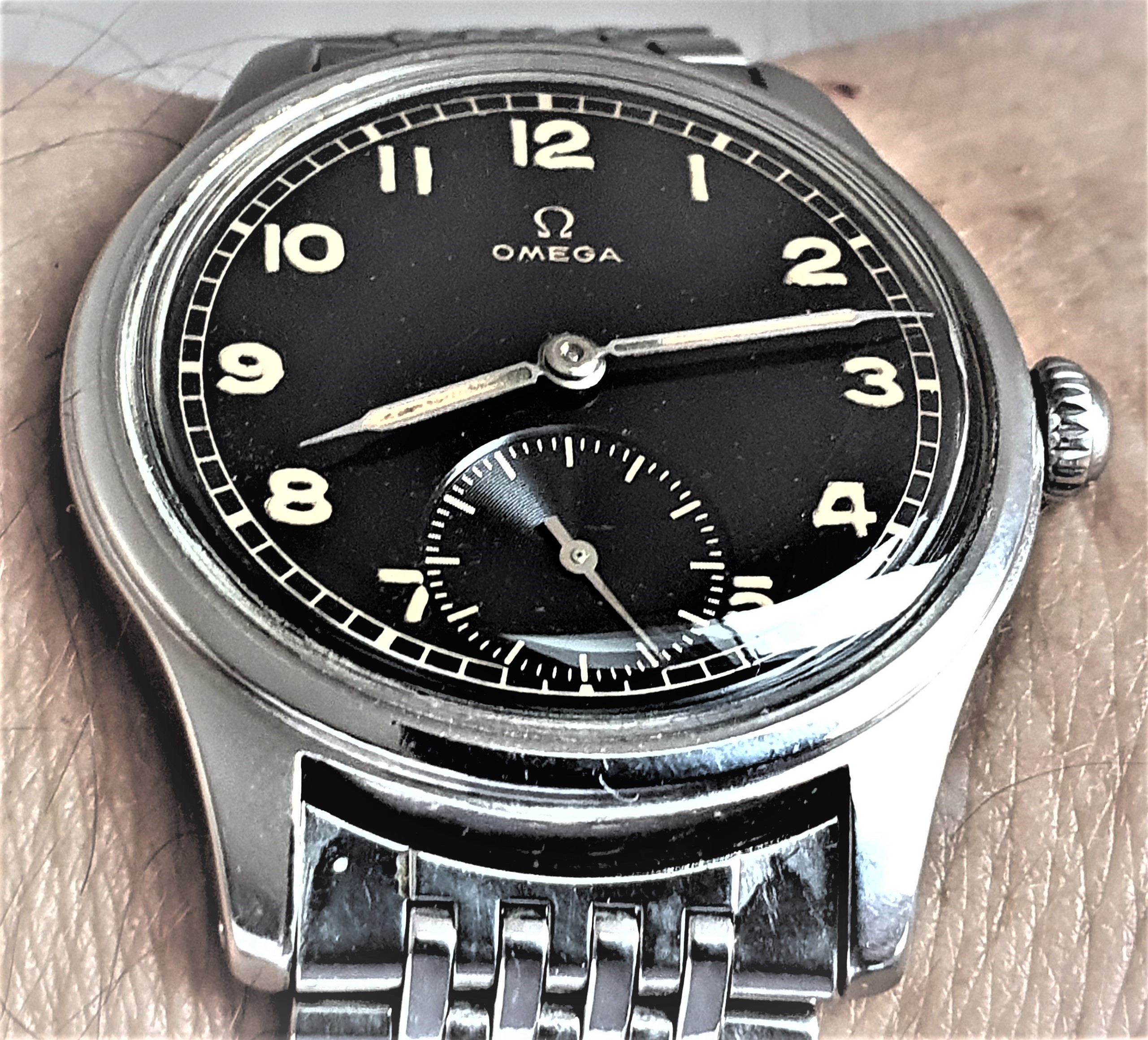 ·Not wearing this (a wee bit too small for me). Estate sale from up the street. It was tarnished and in bad shape. Cleaned it up as best as I could and am giving it to a friends daughter (13 years old who enjoys watches). Hand-wound and working fine. Total cost: $6.00. )