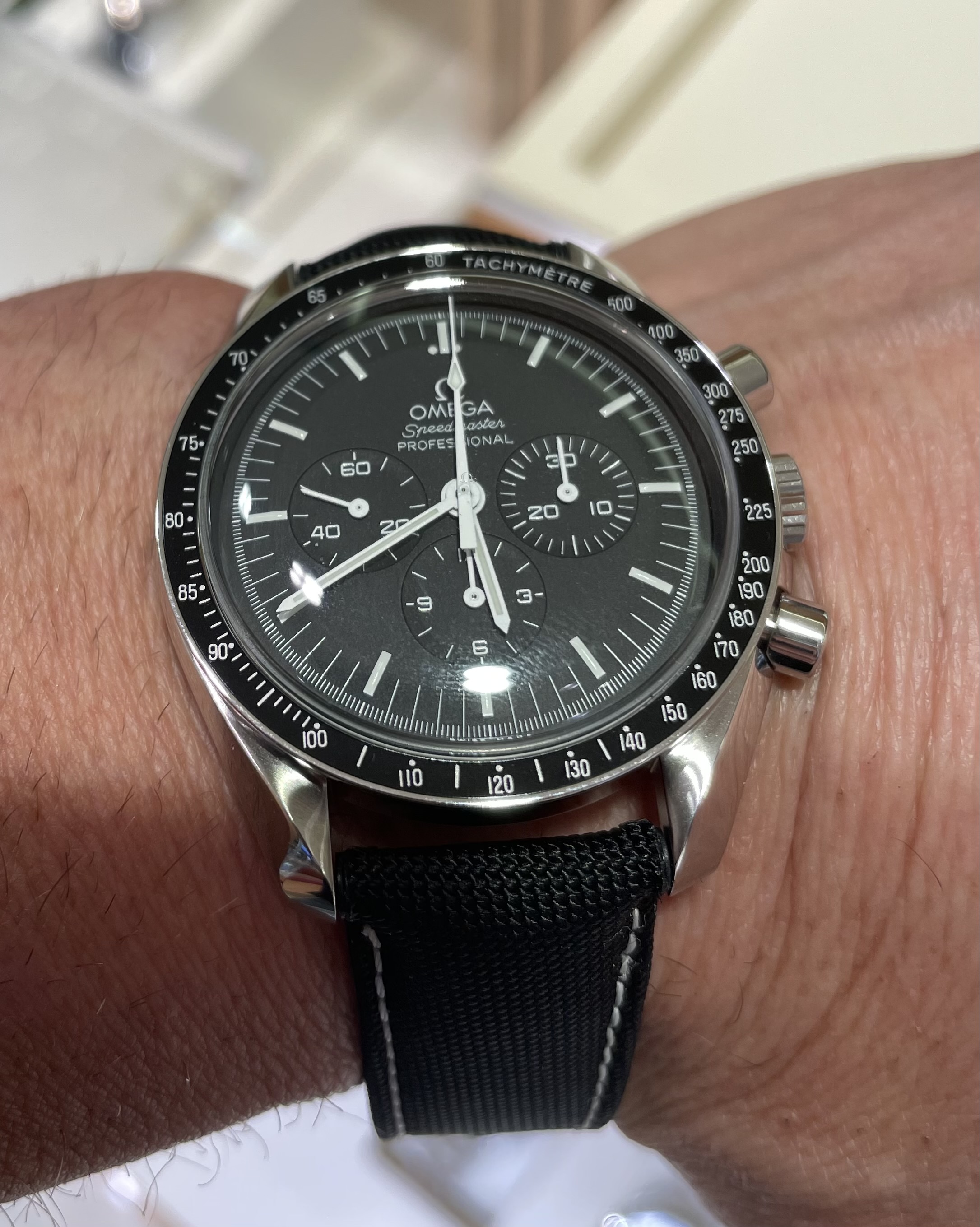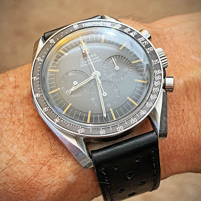 I won’t be wearing it today, but I have one. Thirty years old this year. This model is the first Speedmaster to introduce the sapphire back….back in 1980. Wearing my 50 year old Rolex Air-King Date, instead.