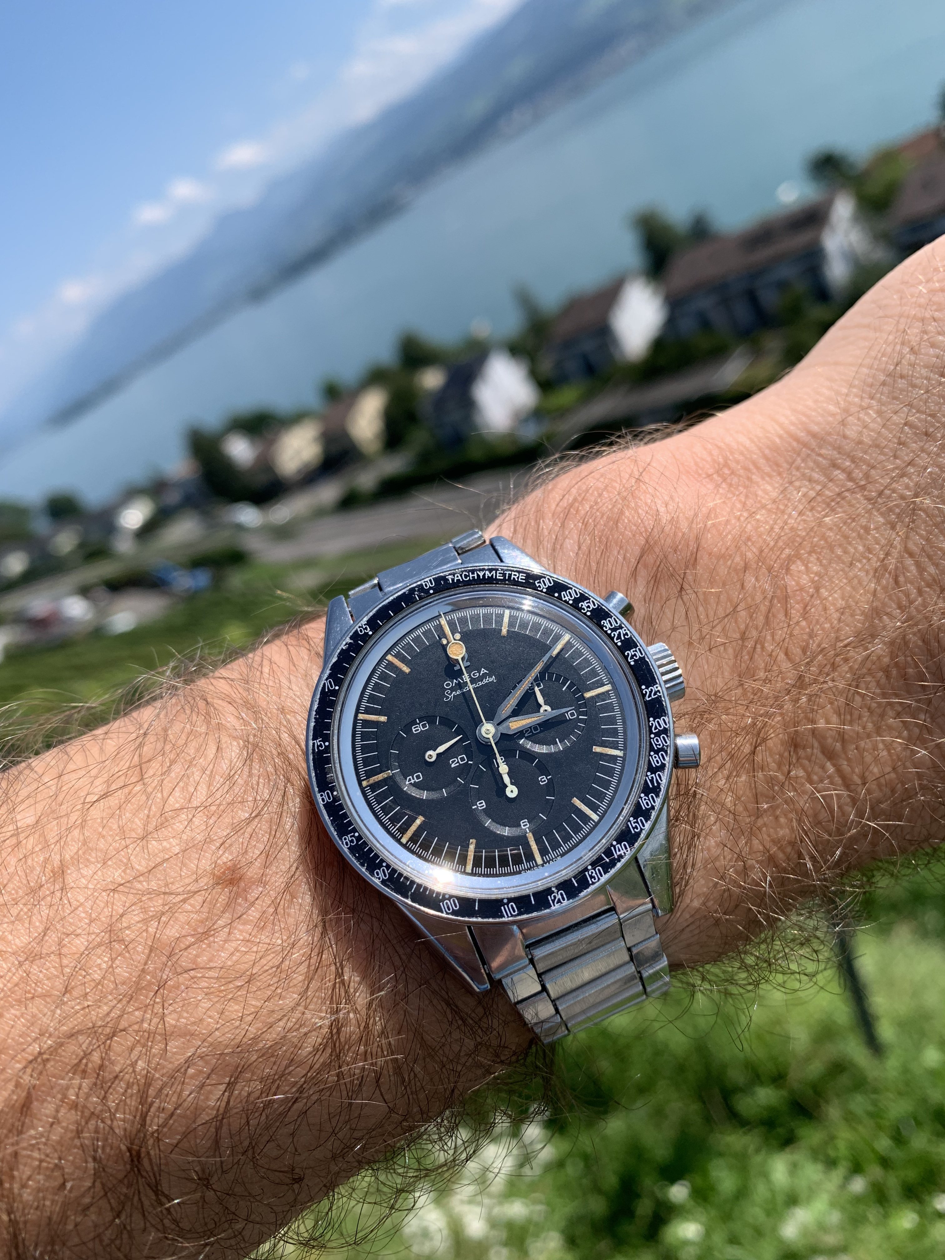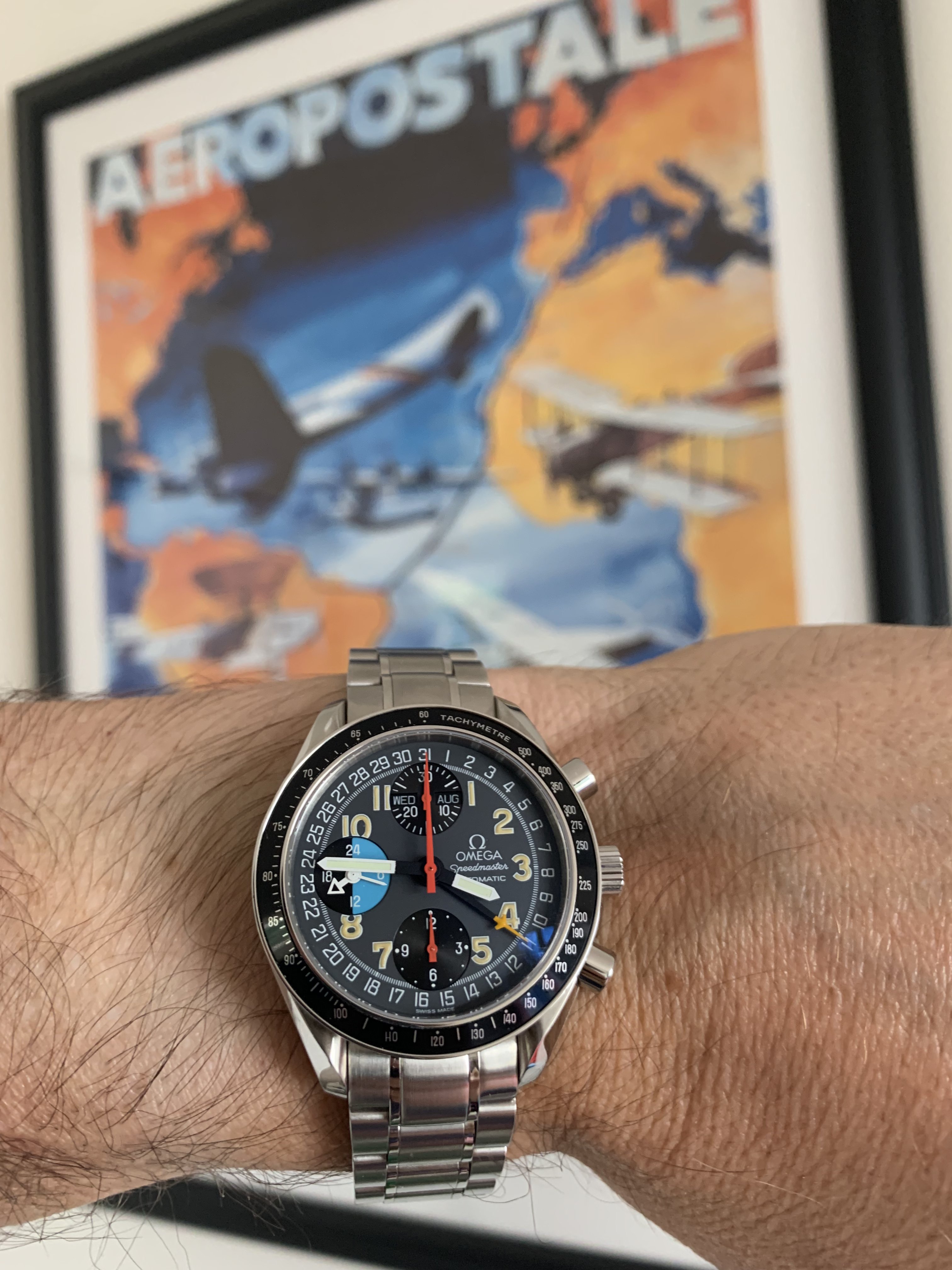 This is the Omega 3820.53 Day Date, also called the Speedmaster Mark 40, or Speedmaster Triple Date, or also referenced as one of the Michael Schumacher Speedys (see below).