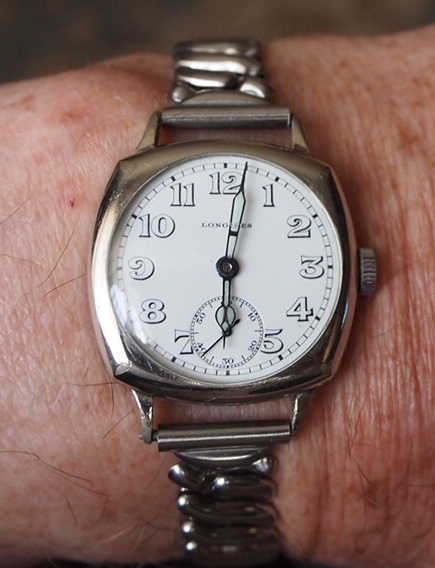 I had planned to change from a watch with no calendar, today, into one with a calendar. But in scanning my collection, I decided to wear my 1922 Longines. Canadian made, white gold filled case, 15-jewel, calibre 12.92 movement, vitreous enamel dial, probably originally with radium numerals. Original hands, re-lumed . What you see is the end result of a lengthy restoration. This case came to me with a basket case 12.92 calibre movement in it. It sat for probably close to 50 years, in a drawer of scrap watches. Then, one day, another Longines came my way with a 12.92 calibre movement, in much better shape, but with a trashed case and vitreous enamel dial. The owner and I made a deal, and I ended up with it. So this is the product of merging the best parts of the two watches.