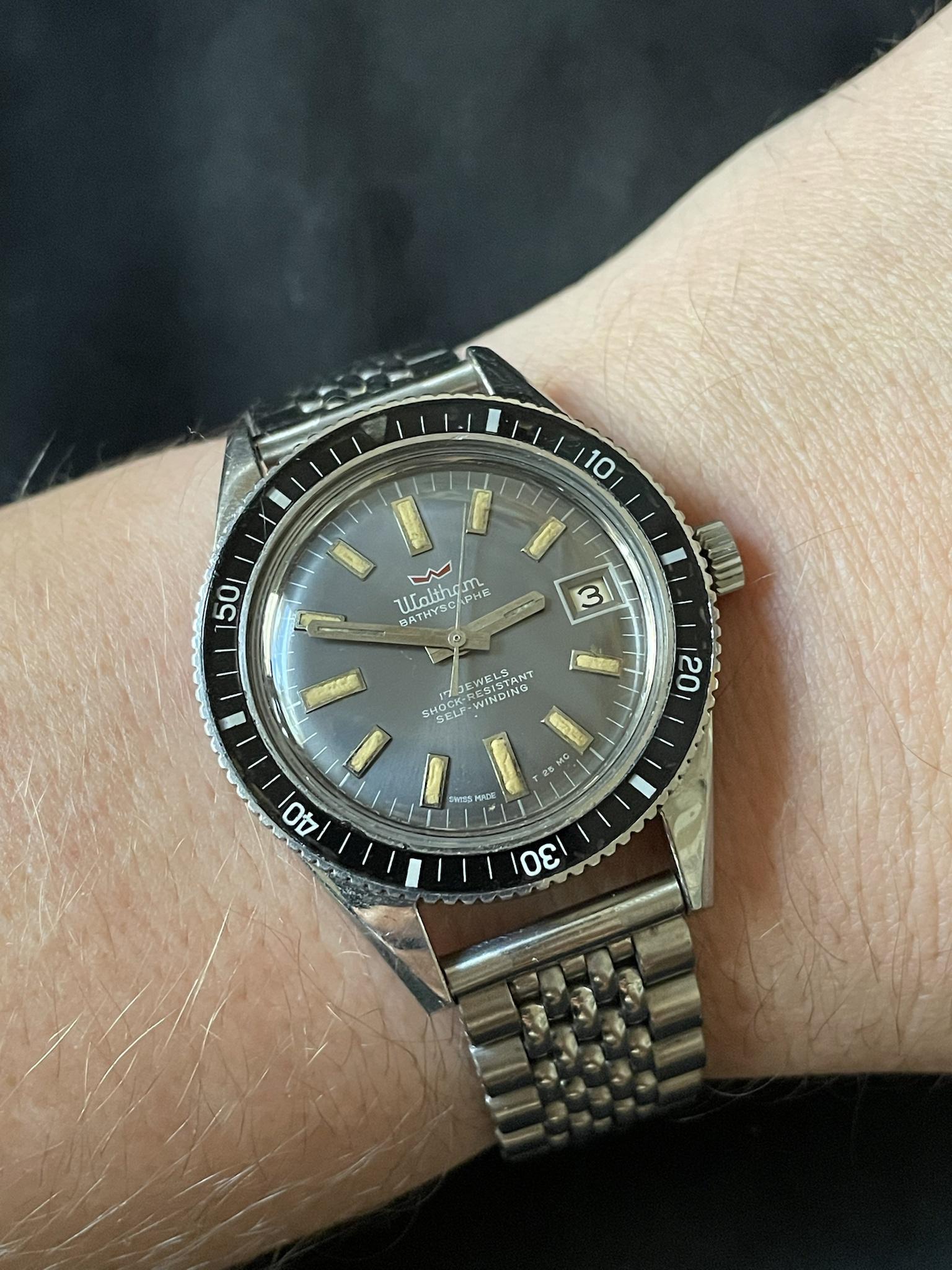 Posts 133 Likes 113 spe777 ·Aug 30, 2021 Wearing my Dad's old Waltham (Blancpain) Bathyscaphe. There's no quickset on this one, unfortunately, so the date is often wrong. Sorry!