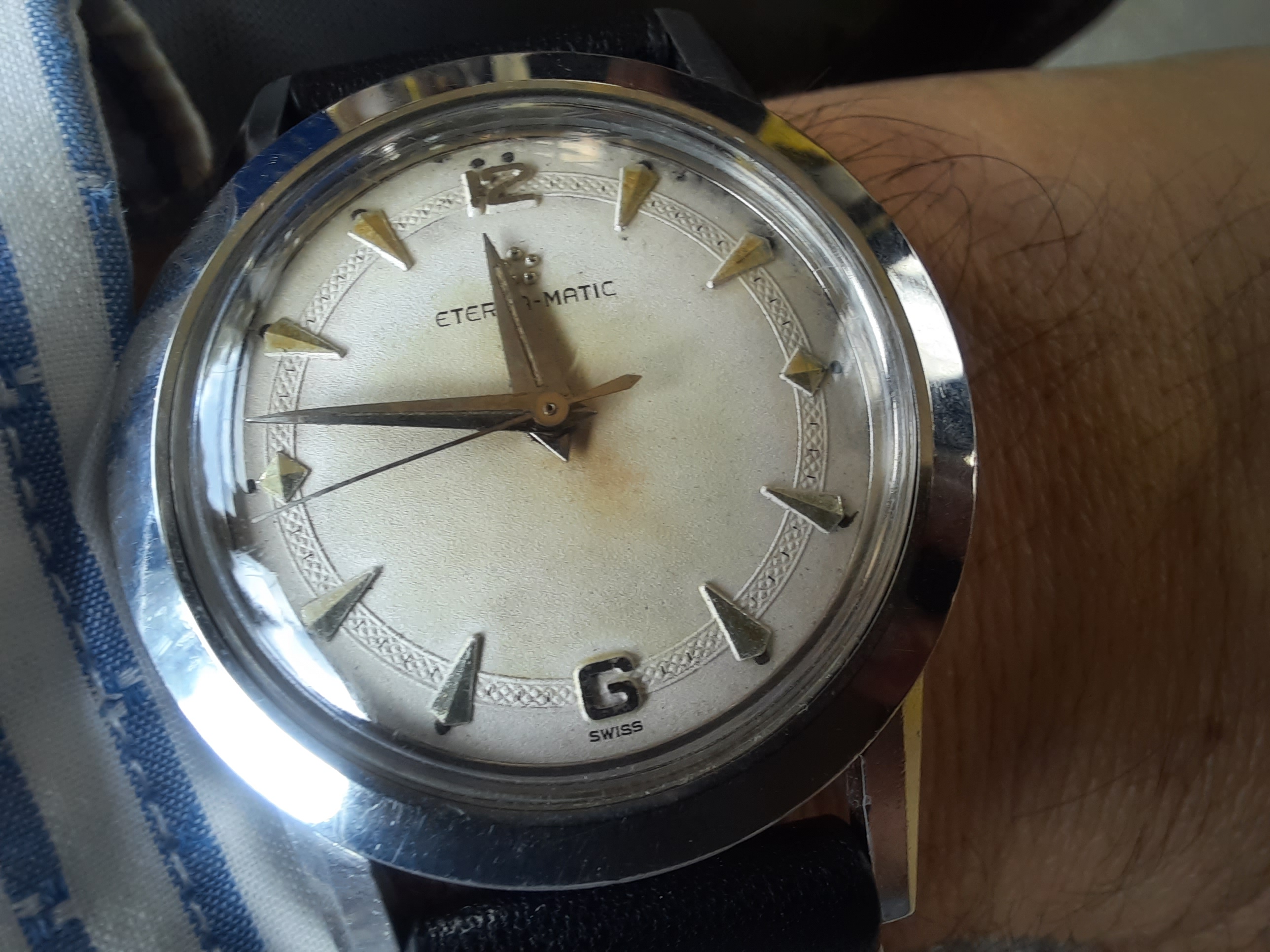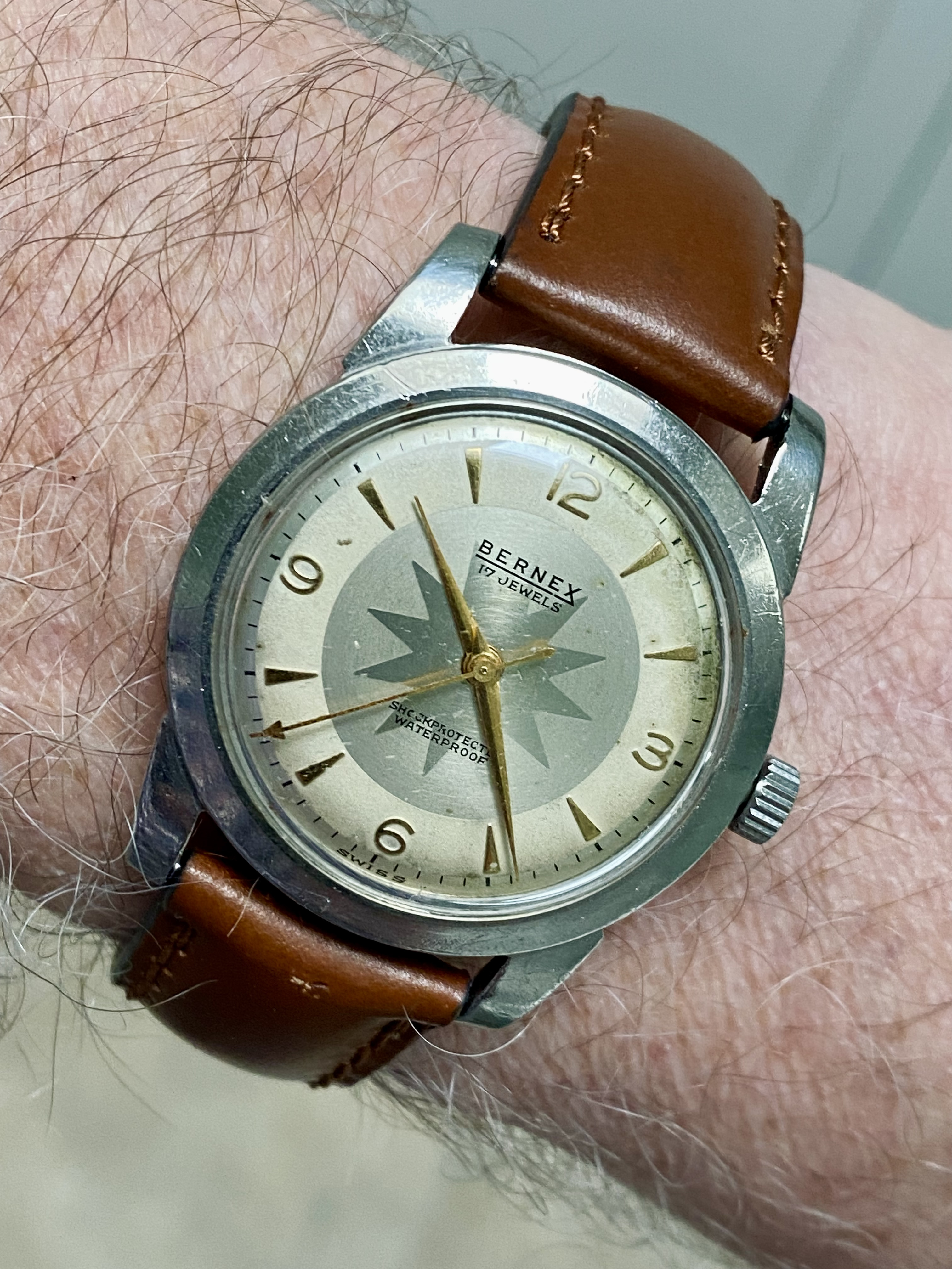 About 20 years ago, a fellow brought me the subject watch for an estimate for repair. The movement is only a 7-jewel model. When I quote on a 7 jewel watch, I quote a higher price than I do for watches with 15, 17, 19 jewels, or more. I usually have to contend with worn bearings on 7-jewel models. He declined the repair, and never picked it up! I took a look at it on Sunday, and decided it had possibilities. I’m sure it hasn’t been worked on after it left Elgin in 1919, or so. It had likely been lubed with whale oil! I could not believe how it was gummed up. It was difficult to take the movement apart. I had to peg the bearings, scrub it with Mr. Clean solution and water, rinse it, dry it thoroughly, and clean it again, in L & R Extra Fine cleaner. Even at that, I had to glass brush the congealed oil off the bearings, and re-clean it. Turned out nice!