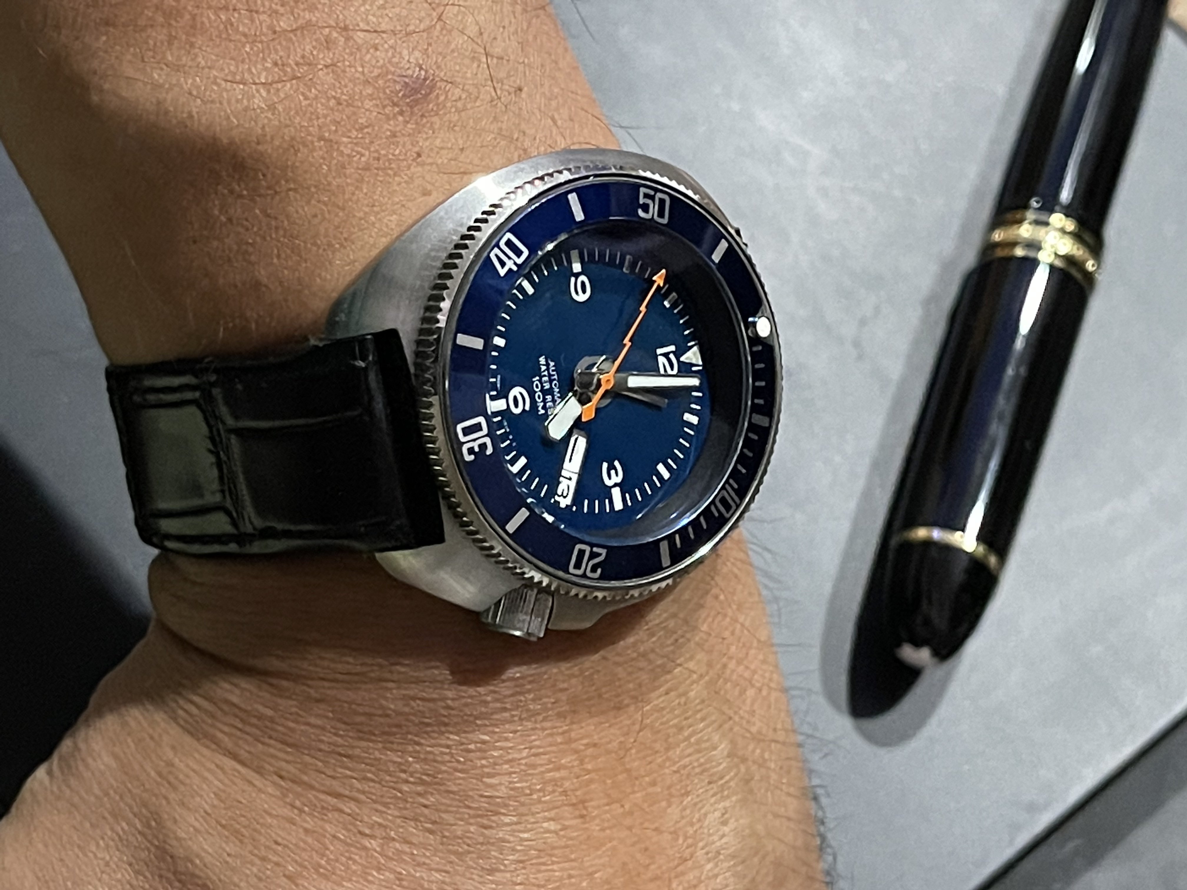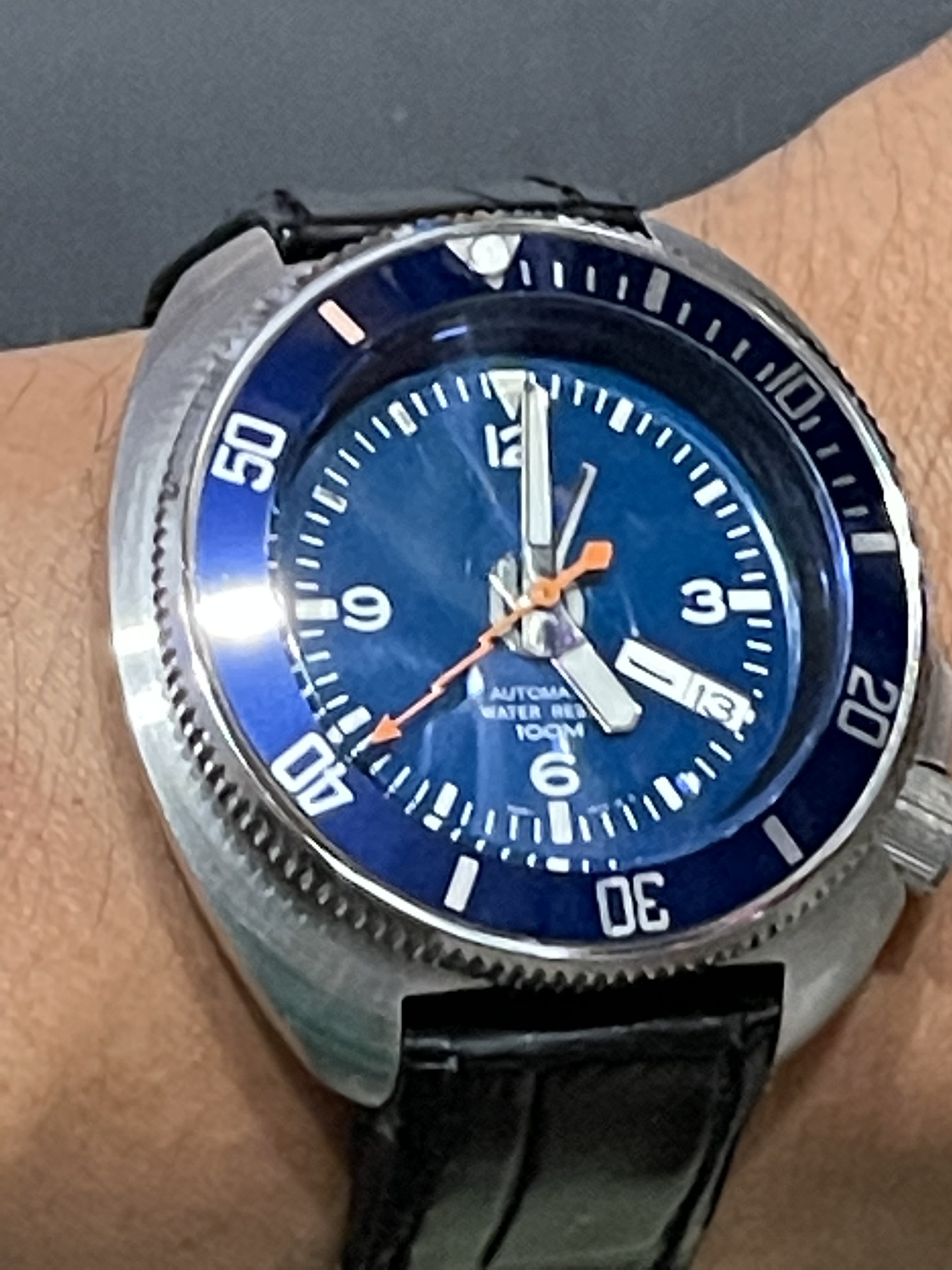 The case is a 10 year gold filled case. The style is called a Demi hunter (half hunter), and the numerals are translucent blue vitreous enamel. The enamel is not damaged, and that is unusual! The movement is Elgin. The inner cuvette indicates it was a presentation to the secretary of a union in Newtownards, County Cork, Ireland, in 1920. The hour hand is a “double spade” style, typical of a Demi-hunter, allowing the time to be read without opening the front cover.