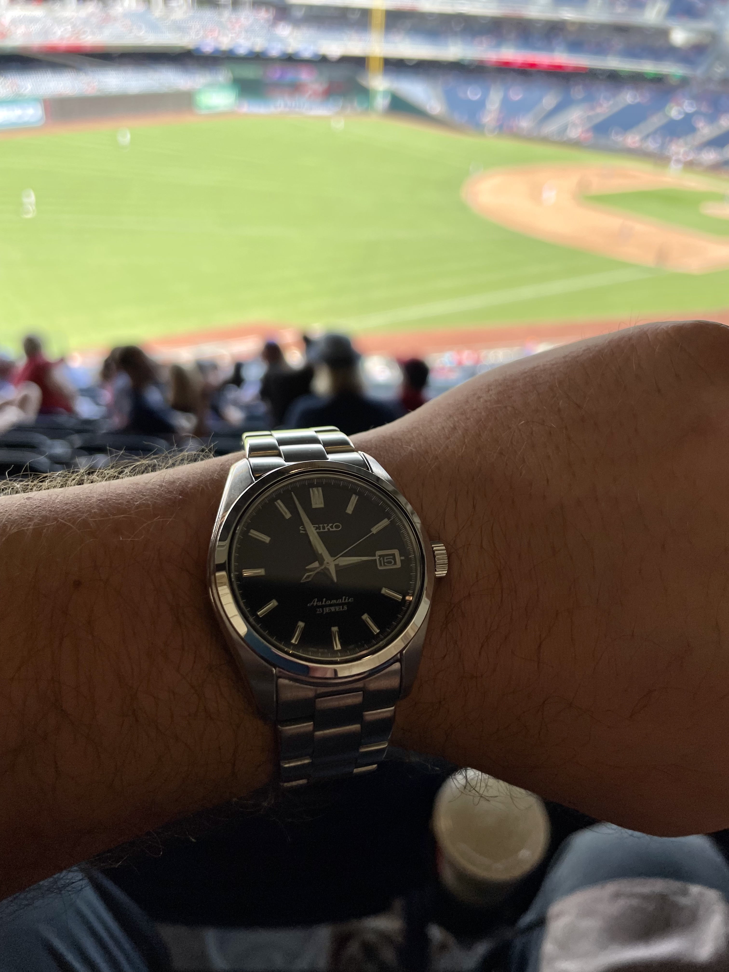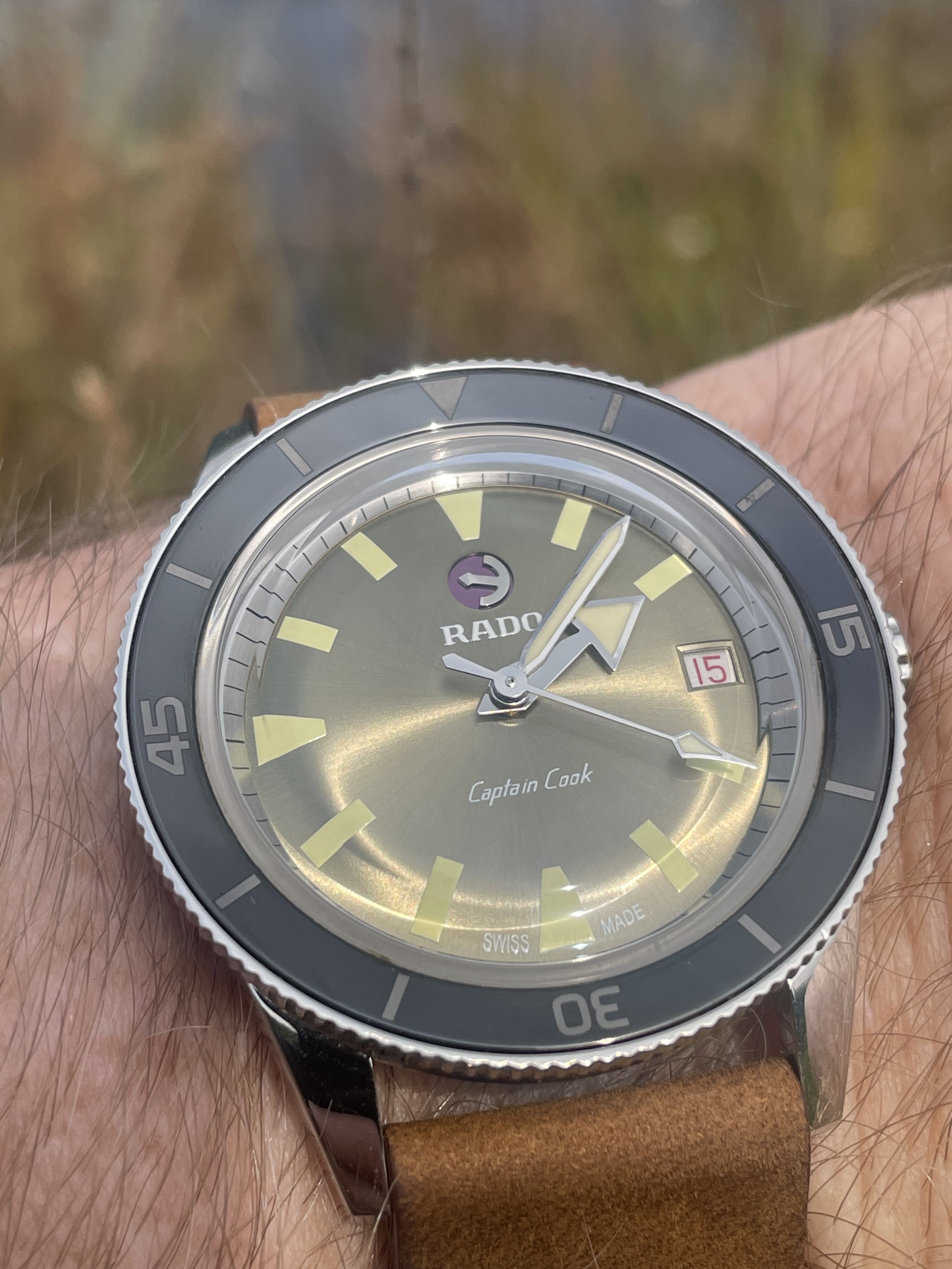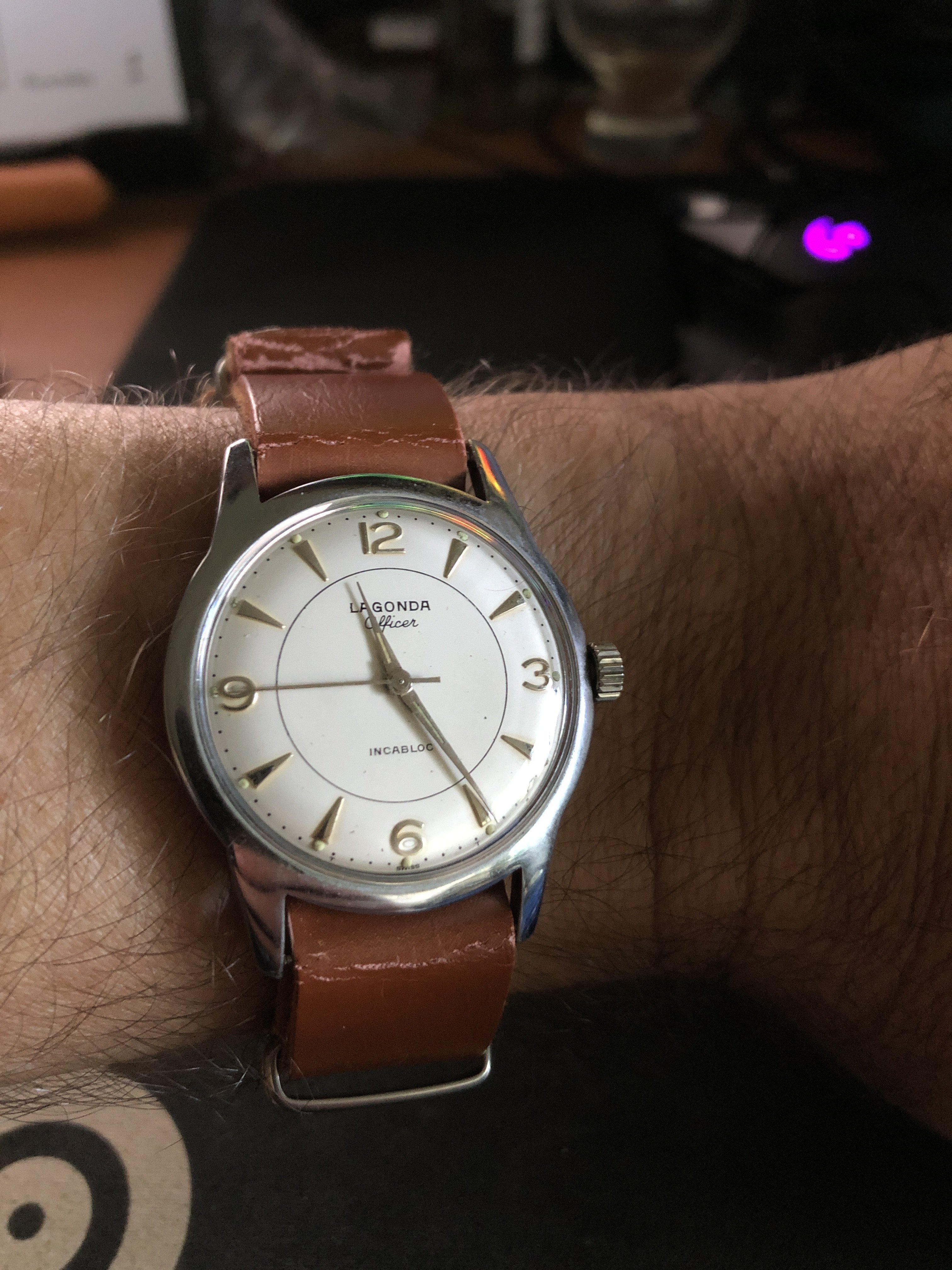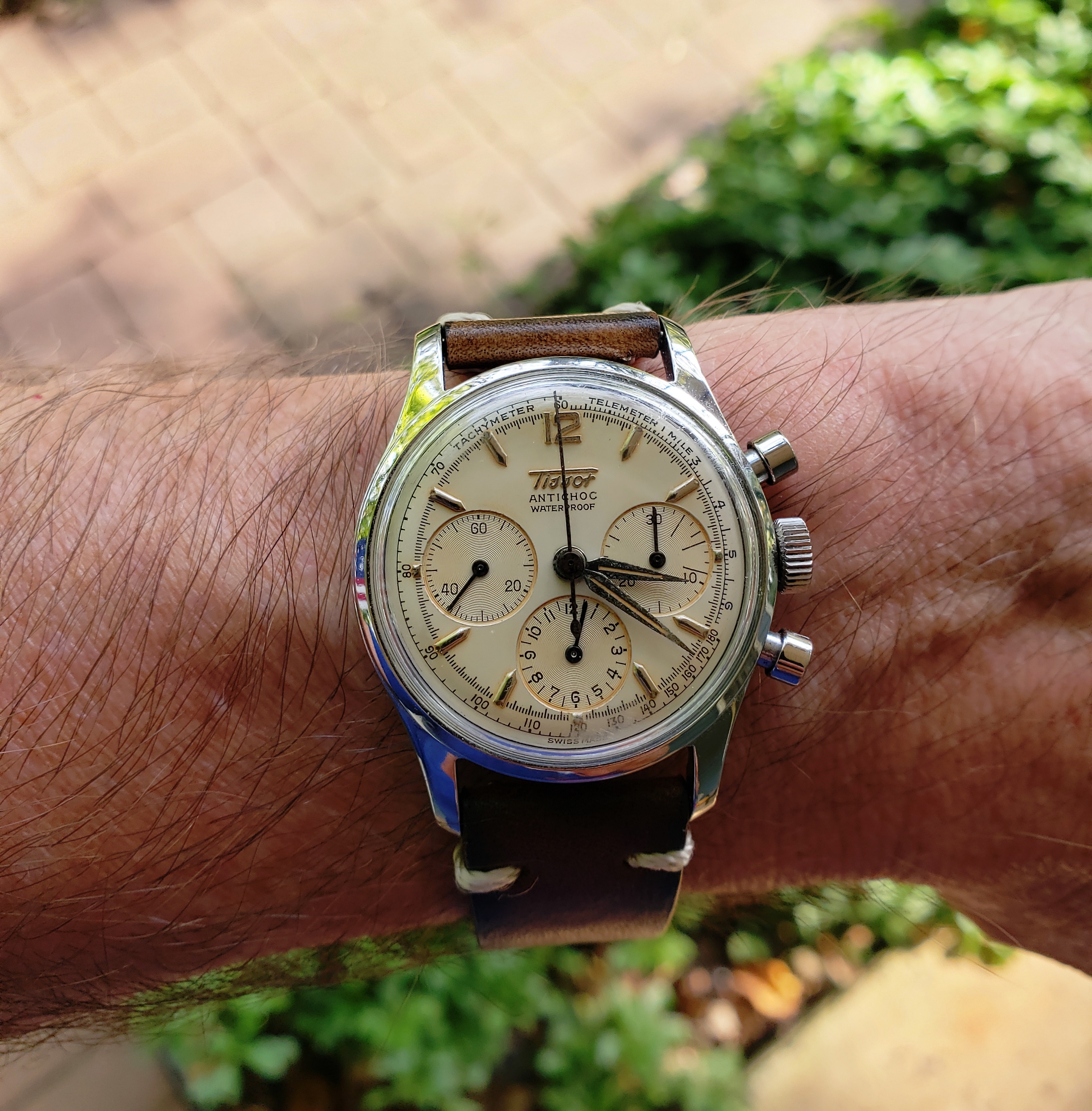 lots of things you never see in combination of 2, let alone everything together. C case, hummer, no red on the dial, looks NOS, gold plated (I assume), chronograph, and a gorgeous Grey sunburst/soliel dial.