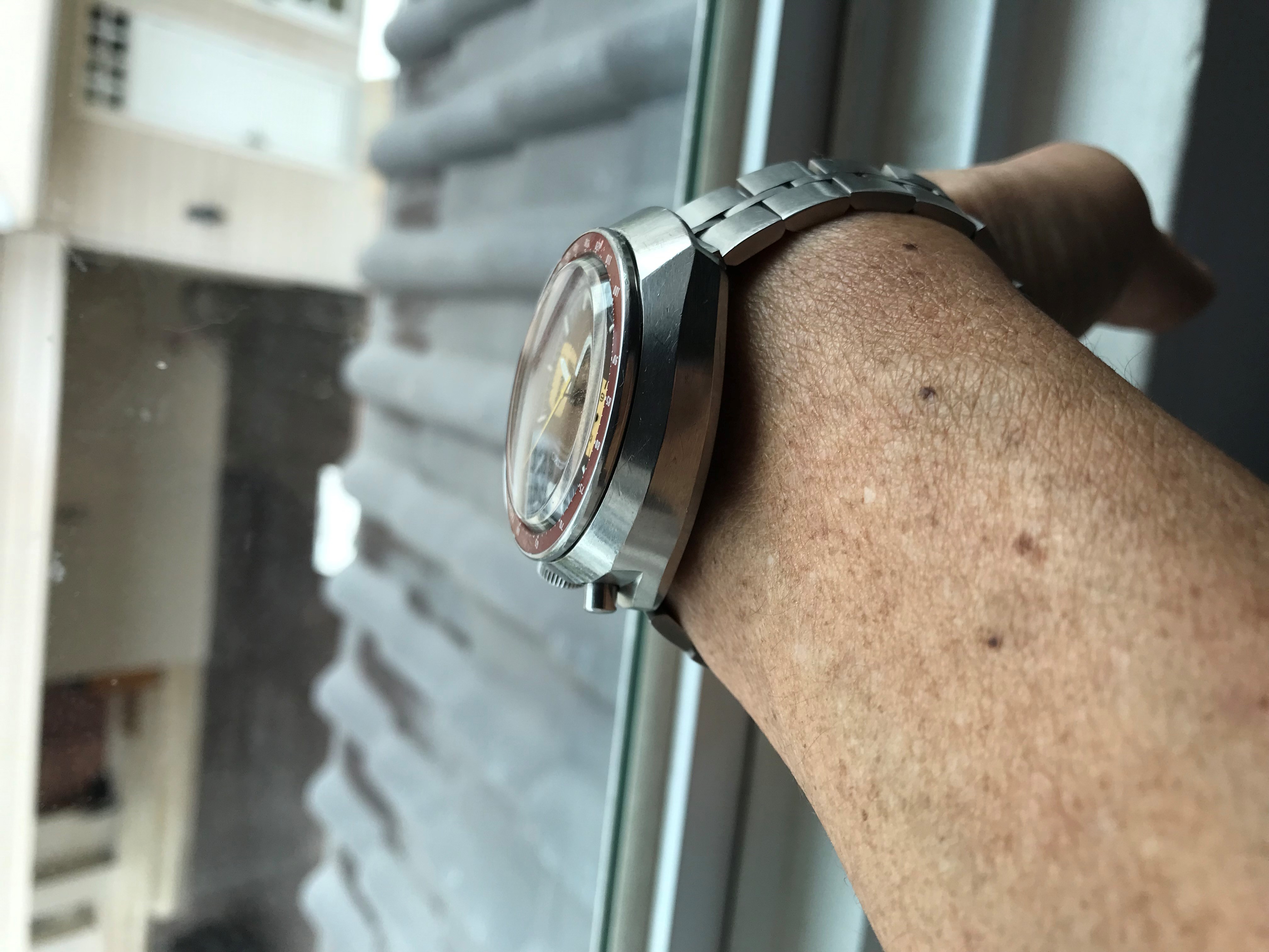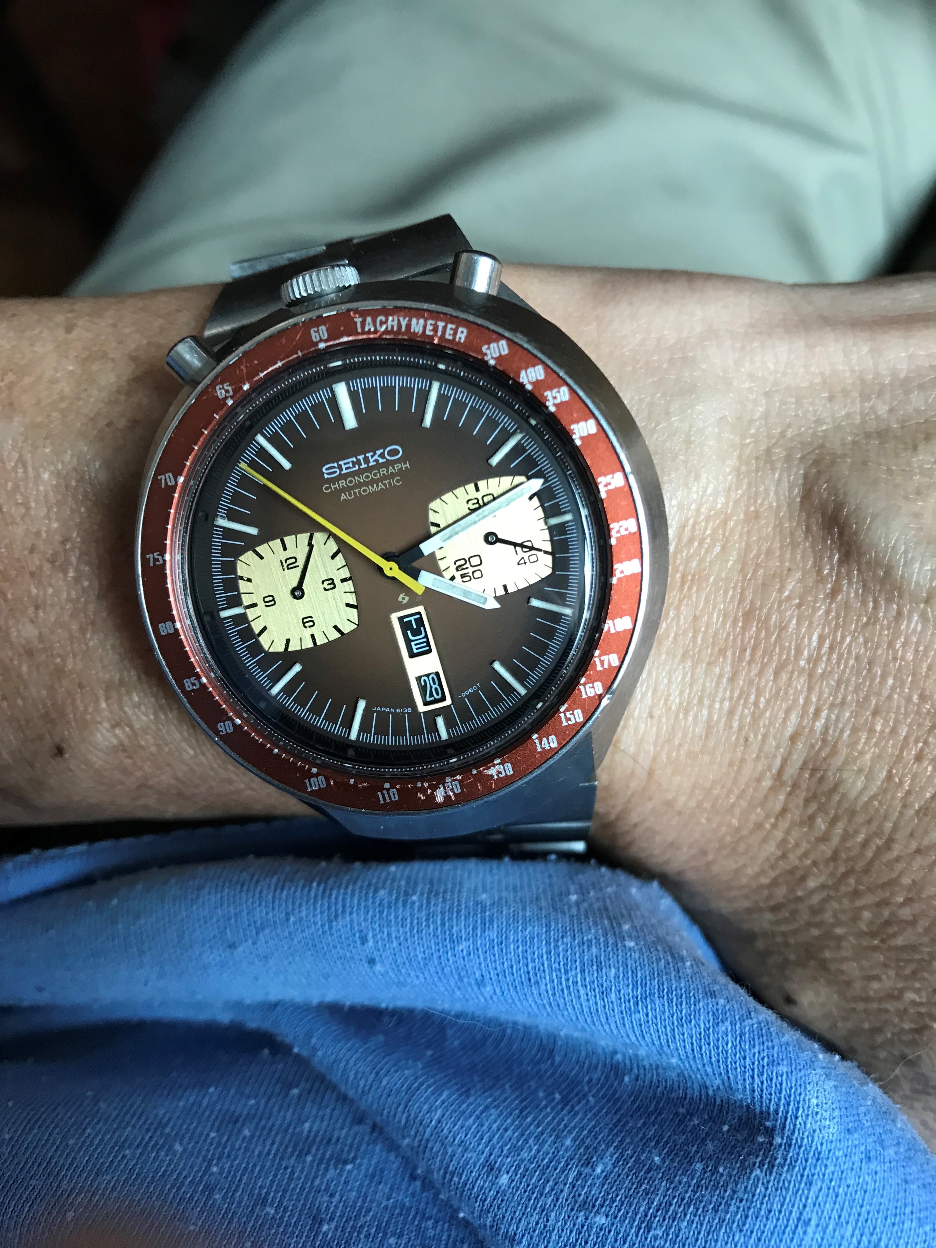 Wearing my new arrival today. Seiko 1978 6138-0049 Bullhead. Love the faded dial and bezel. Big, thick watch but wears surprisingly comfortable on original tin-foil bracelet.