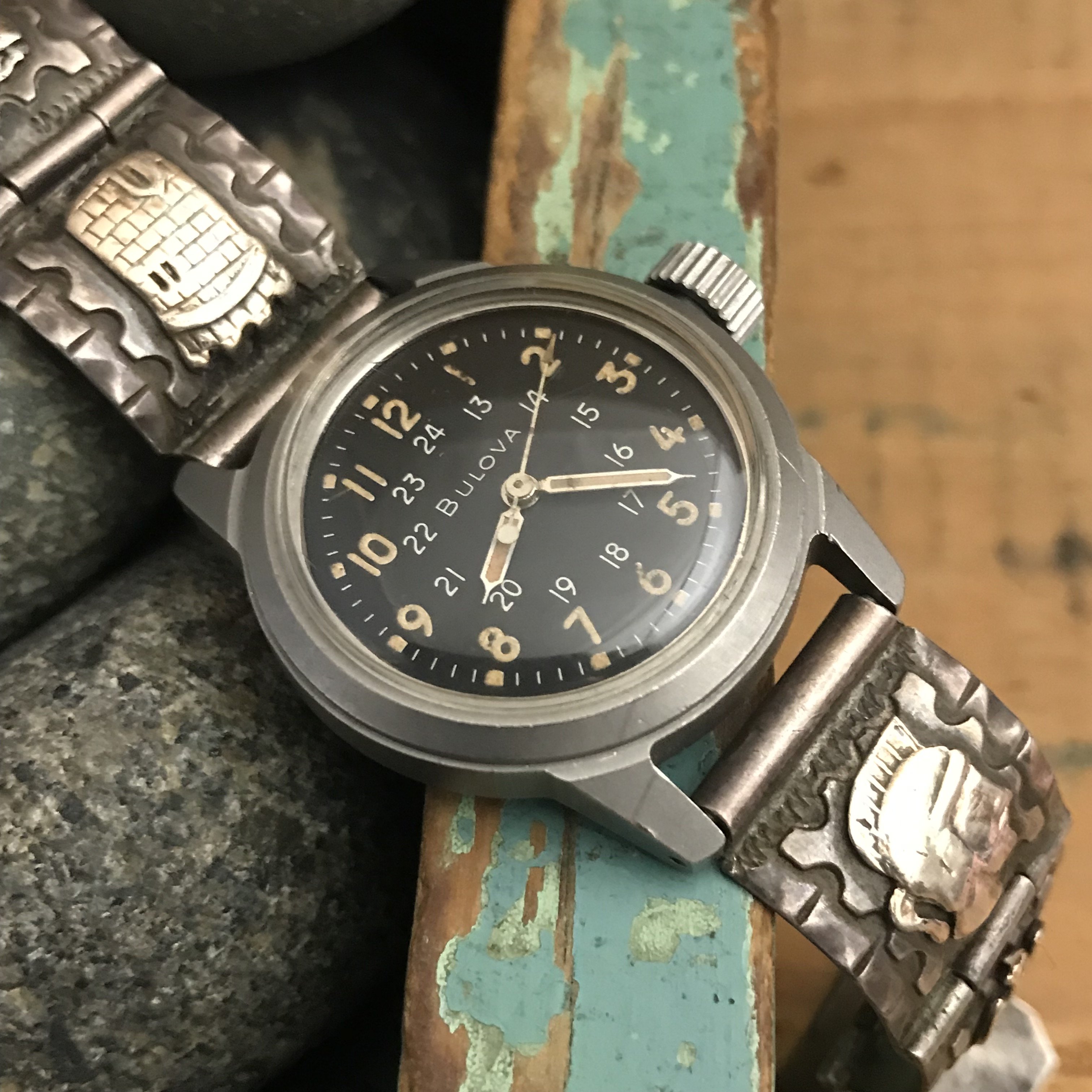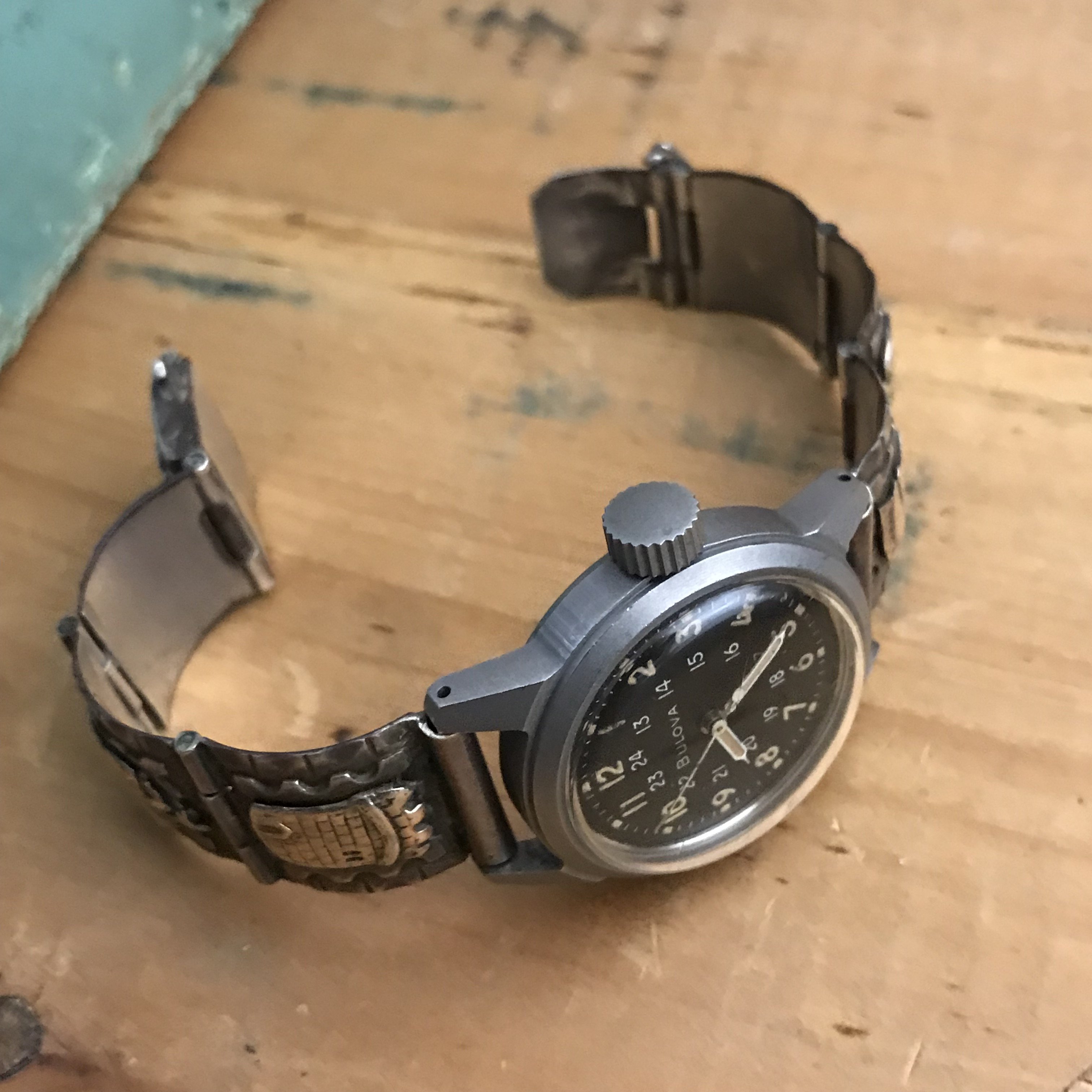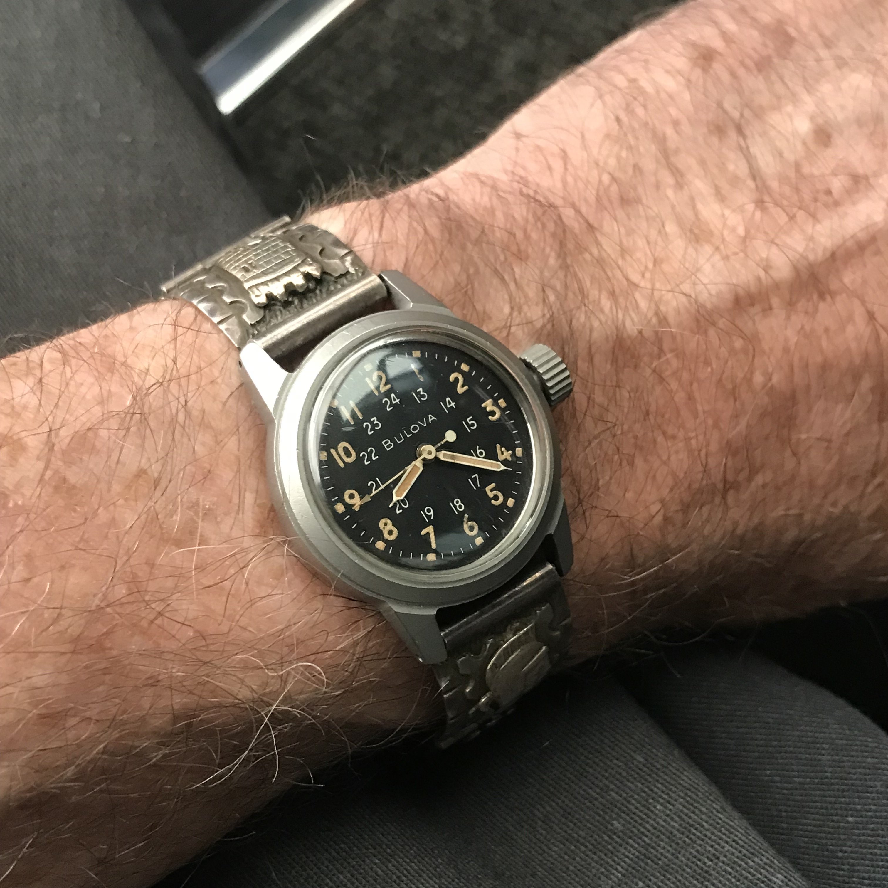 this bulova mil--w-3818a came my way from the estate of a naval officer in san diego, it had this mexican sterling & gold bracelet attached so that's how it's on my wrist today.