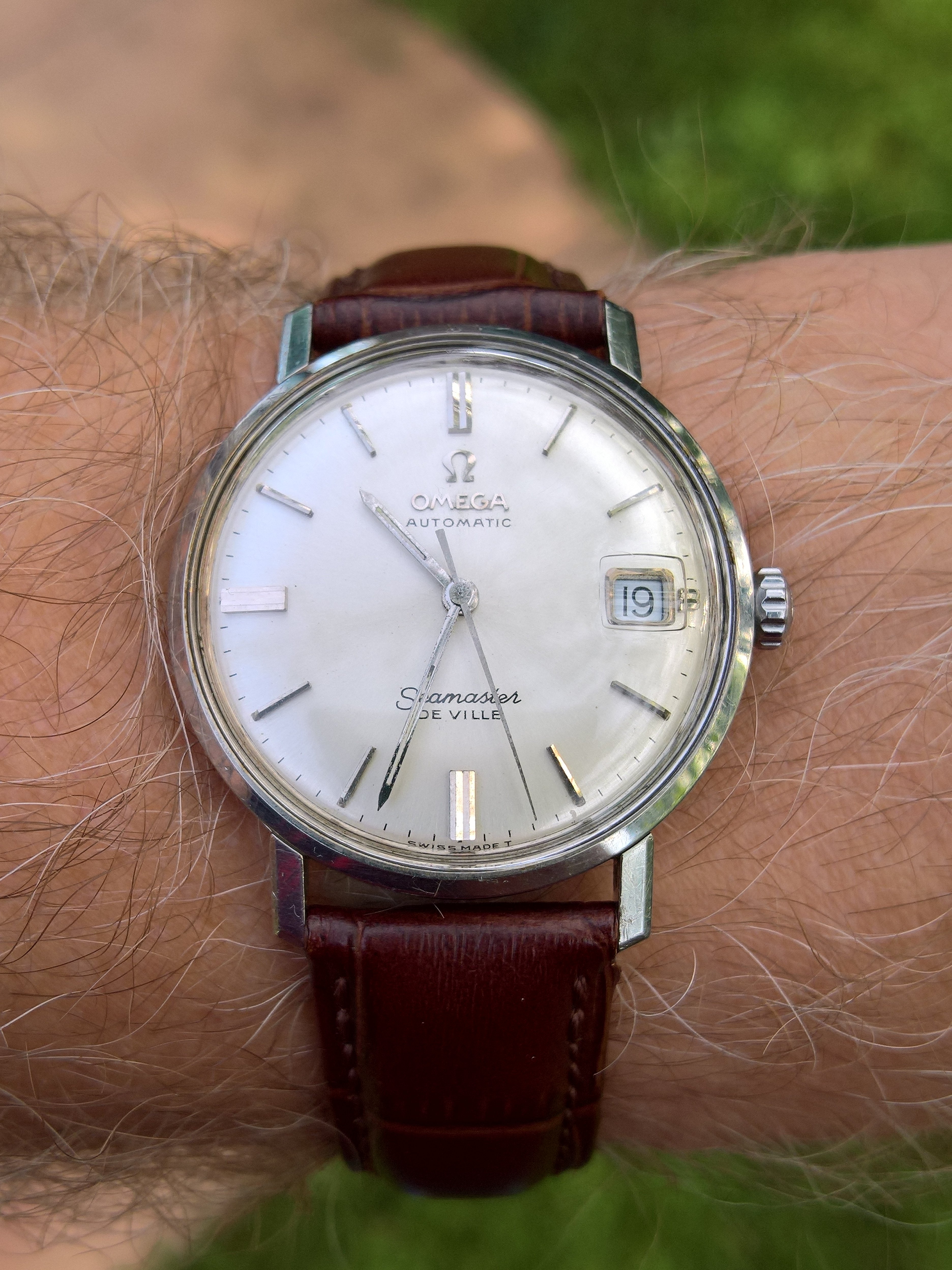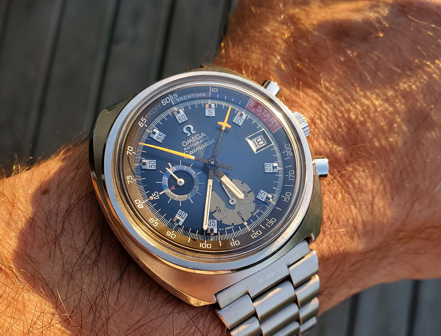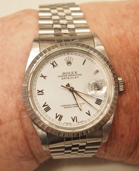 This one. My 32-year old Rolex Oyster Date- Just, calibre 3135. Finished servicing this three days ago, and replacing the mainspring. I didn’t touch the regulators. Set to time, and dialling it in begins. This is the sixth time I have serviced this one in 32 years. Dialling this watch in is never a challenge. Right off the bench, it is 3 seconds slow in three days. I’ll wear it for a week and then decide if I want to regulate it.