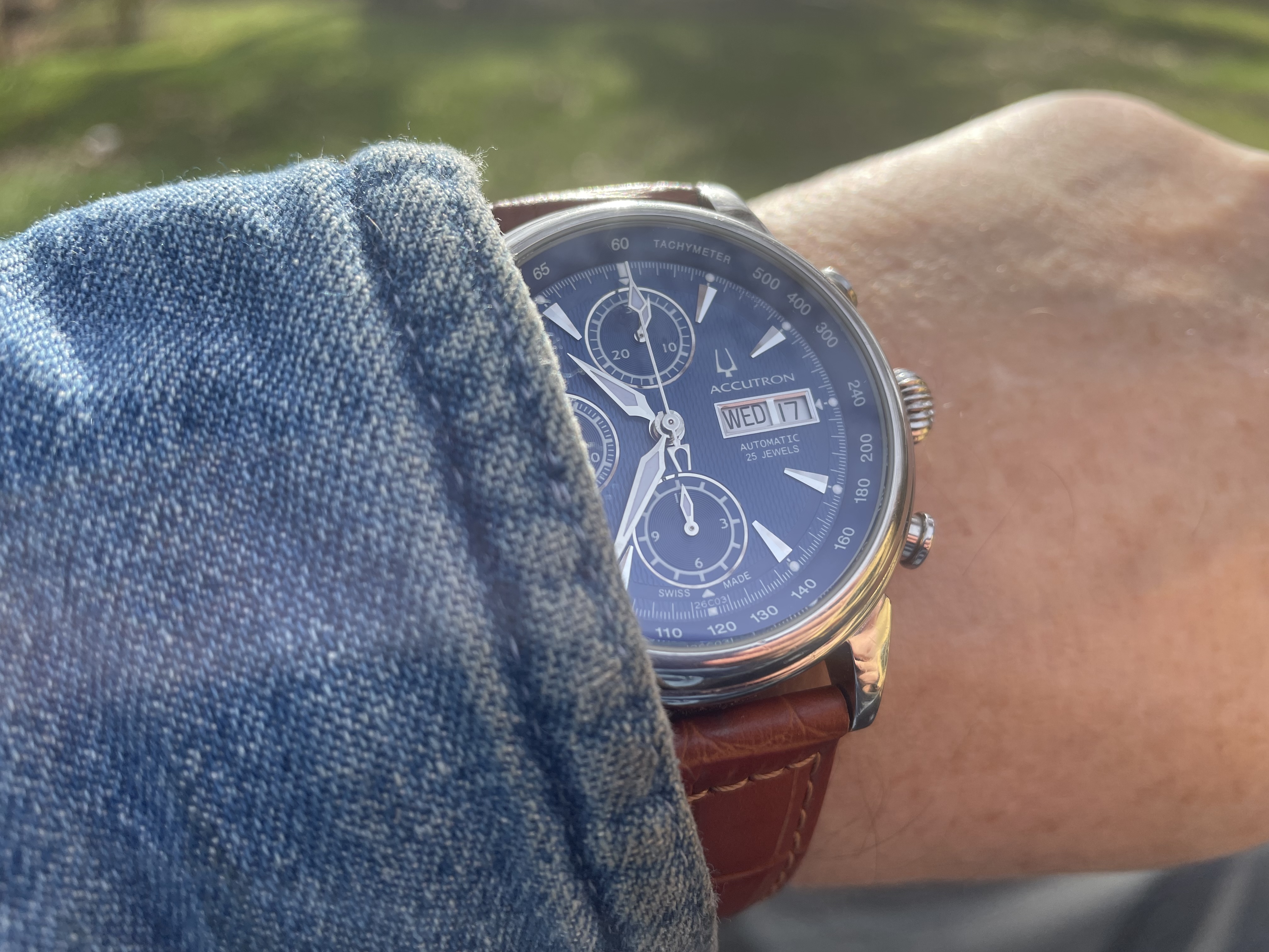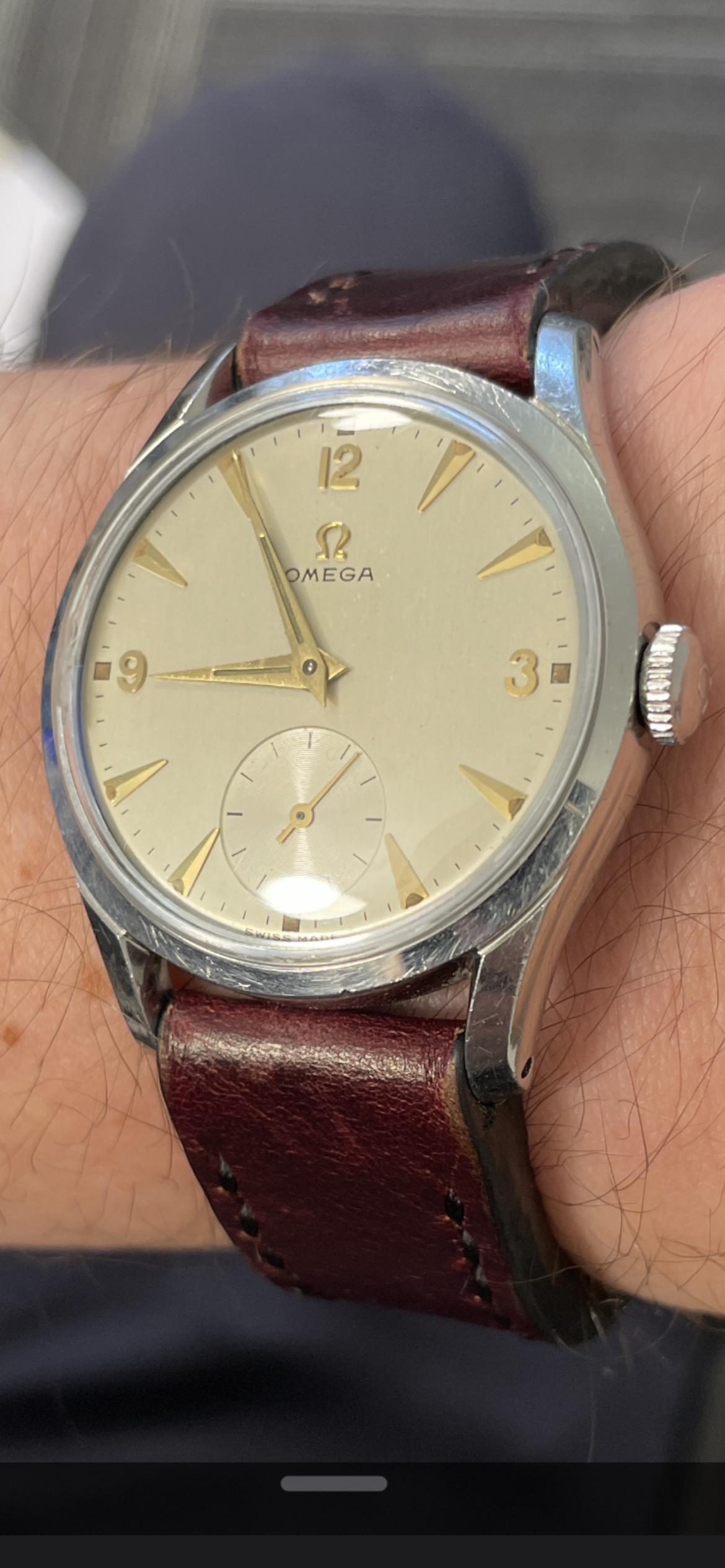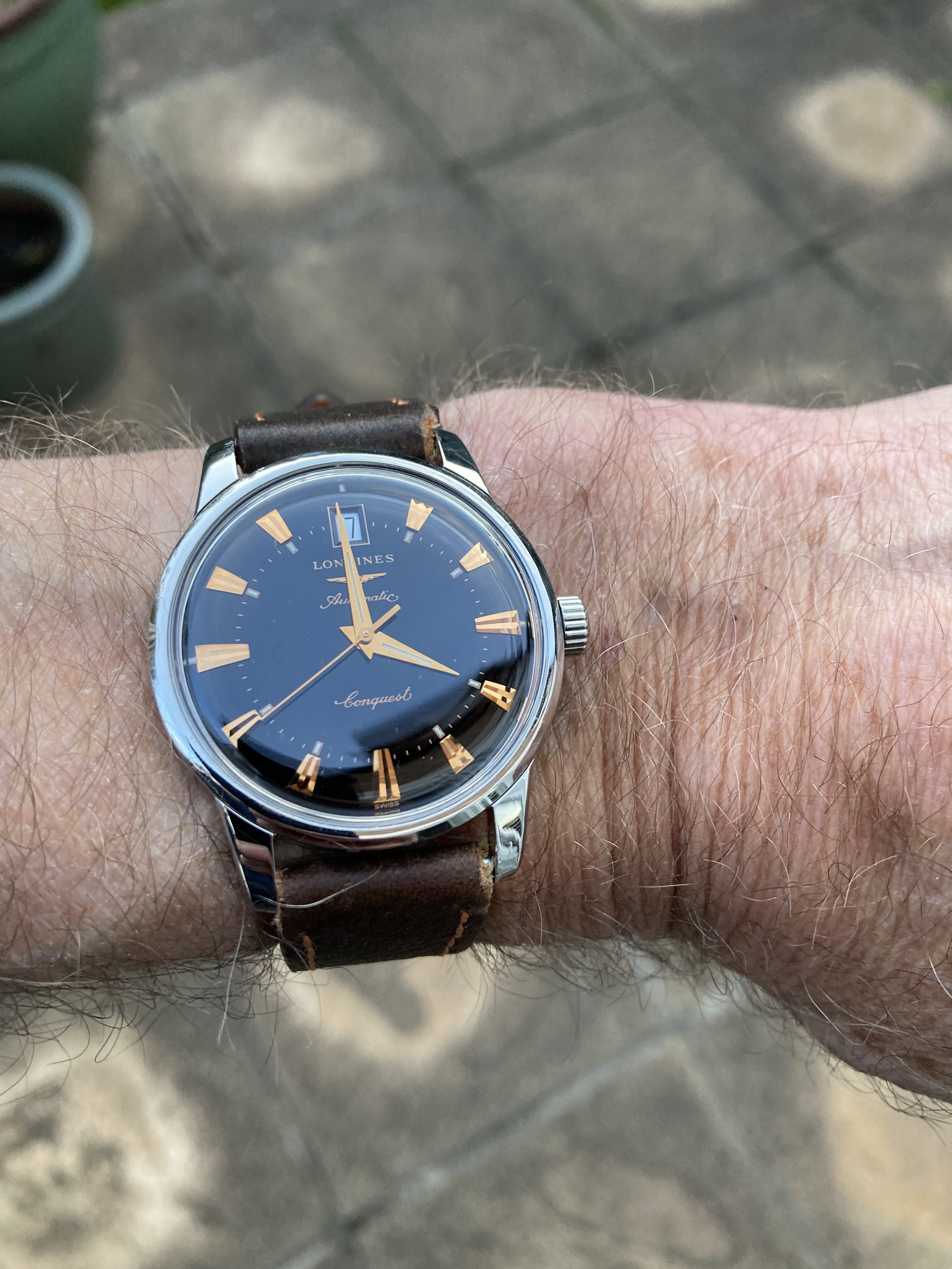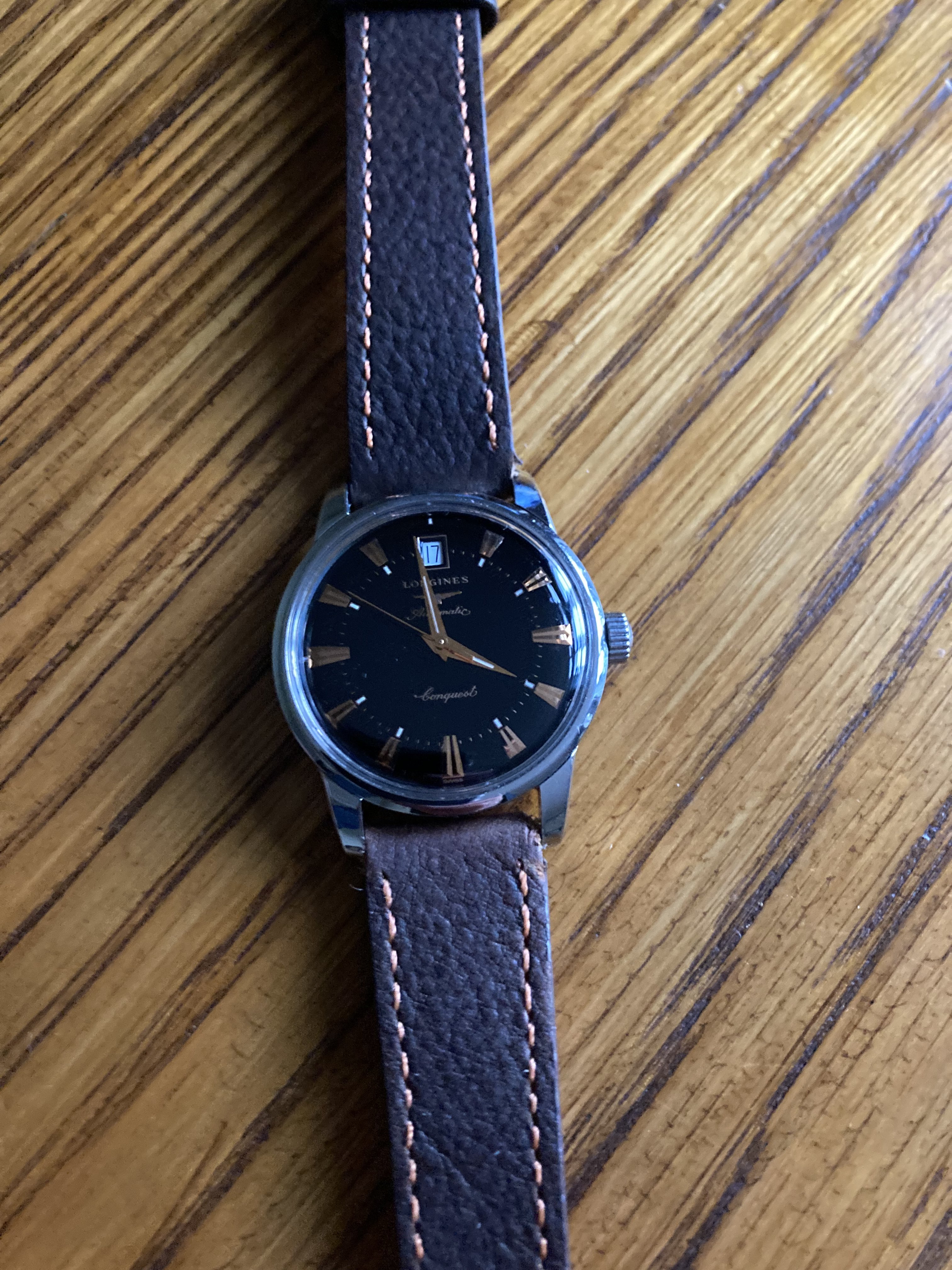 I don’t wear this one that often because I’ve had trouble matching it with a strap I like. I think this brown leather with orange stitching may just be okay.