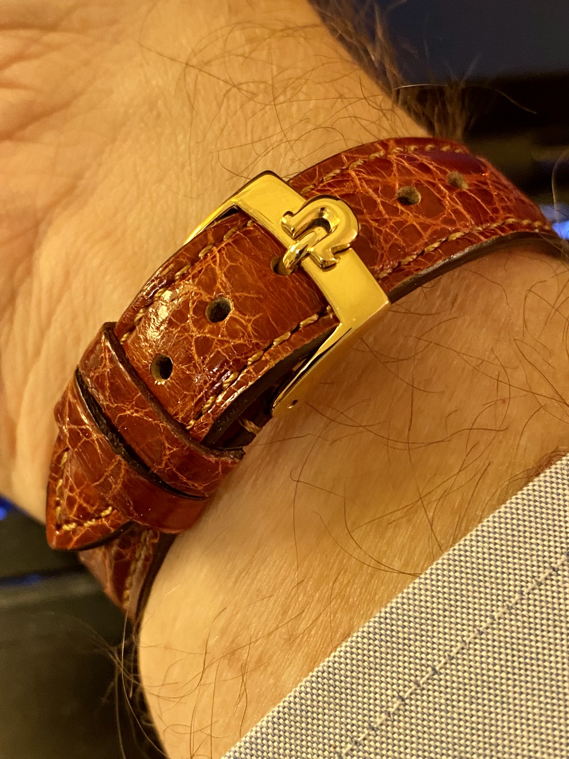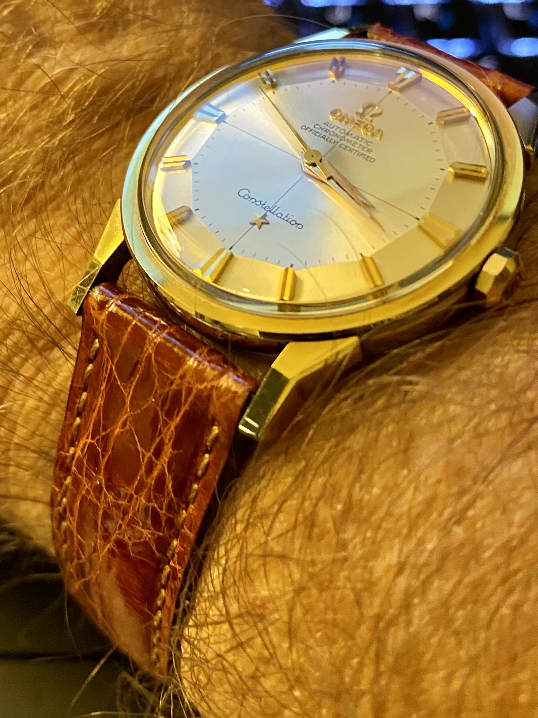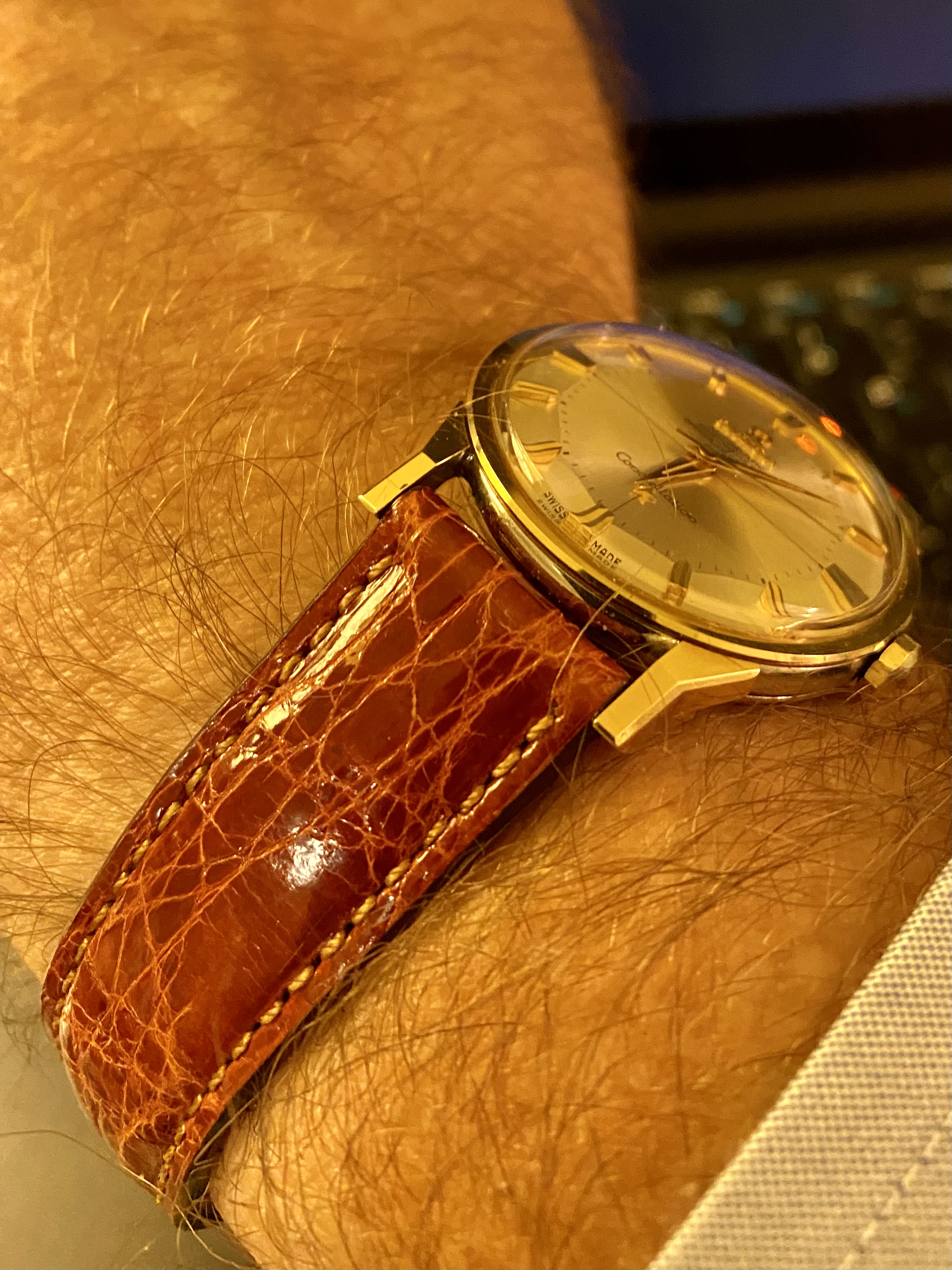 Put a new genuine crocodile strap in cognac on my 1962 gold capped dog leg Connie. Transferred the original Omega pin buckle to the new strap. Opinions?