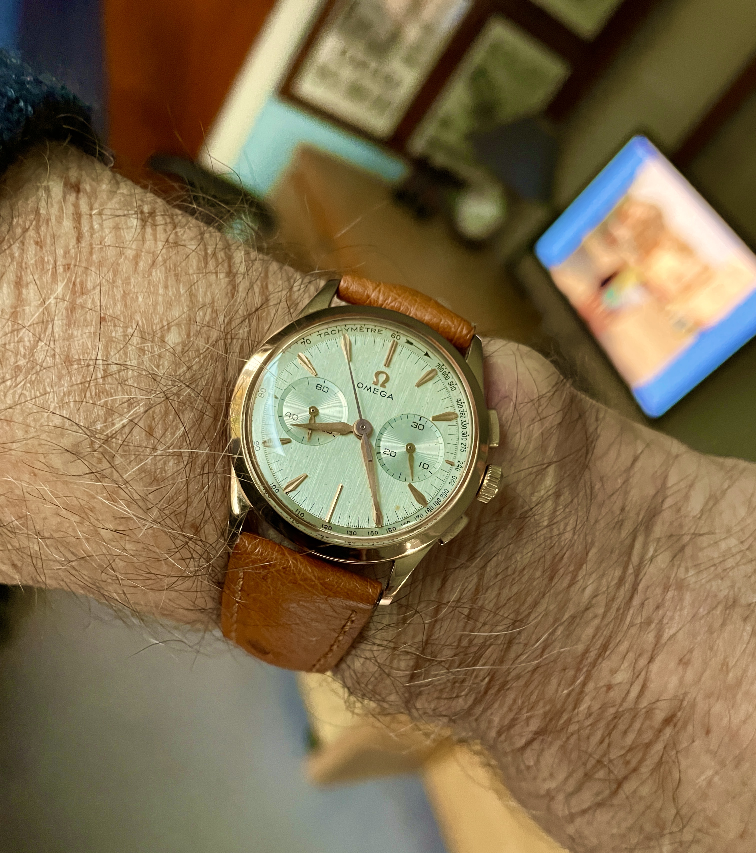 Put a new genuine crocodile strap in cognac on my 1962 gold capped dog leg Connie. Transferred the original Omega pin buckle to the new strap. Opinions?