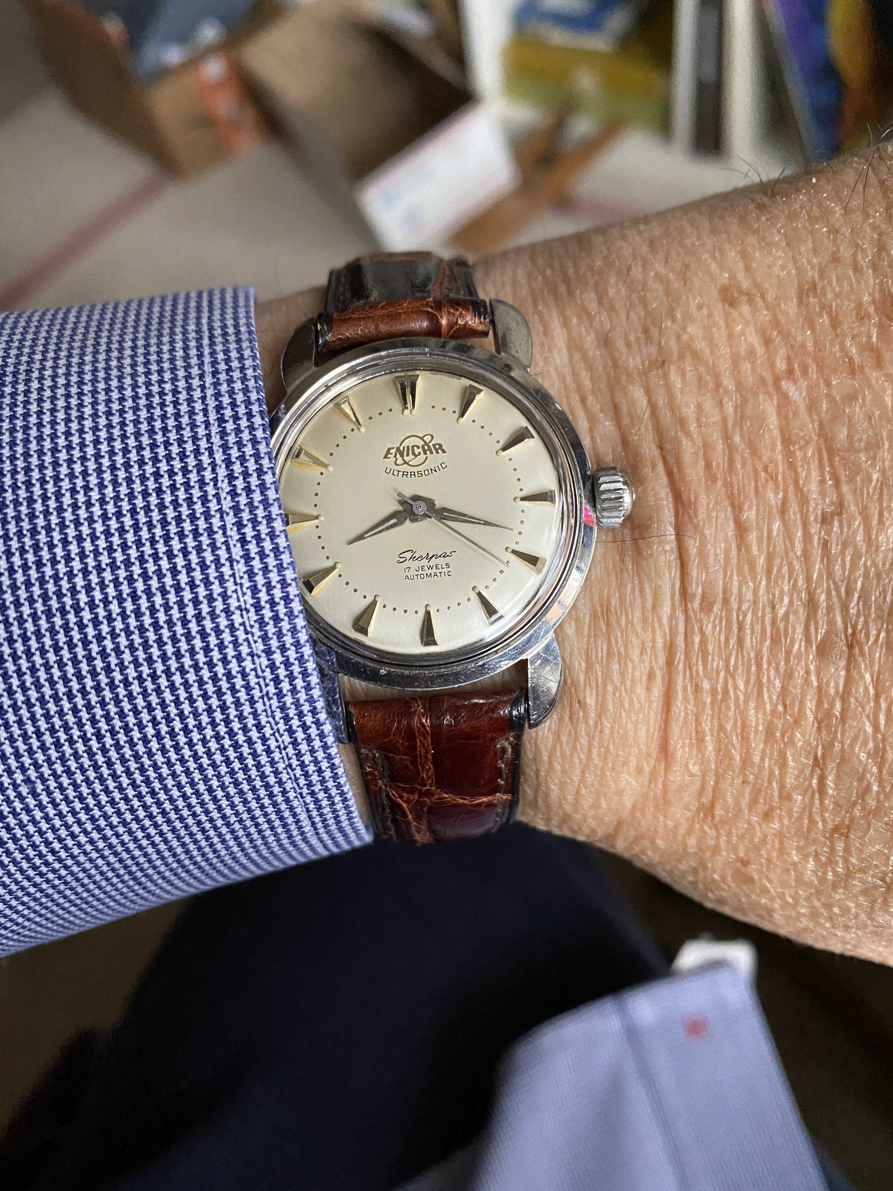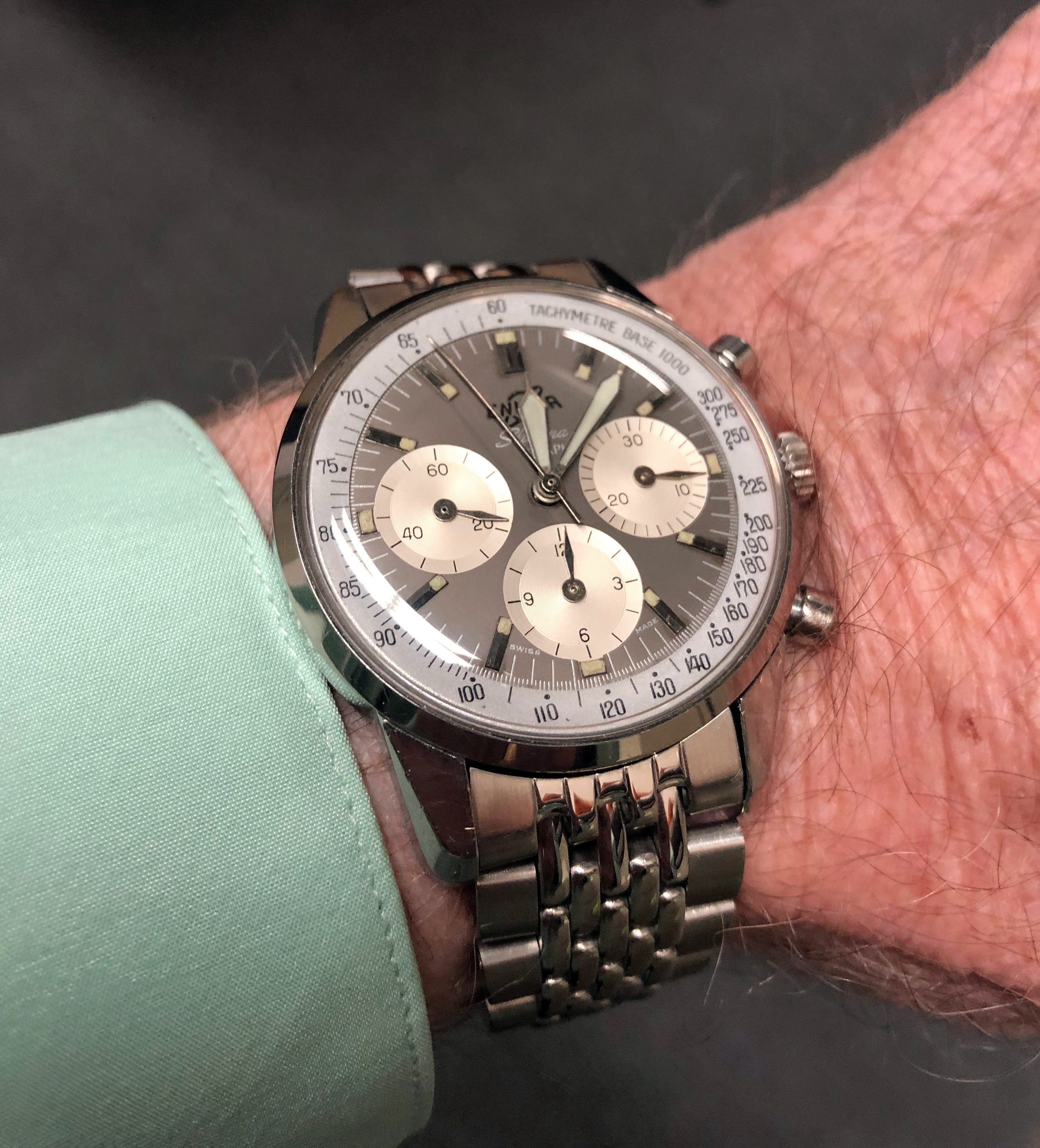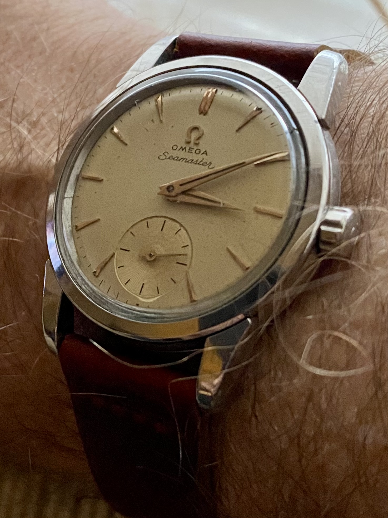 New arrival. 1954 Seamaster 2759. Stainless steel case with rose gold dial furniture, one of my favorite combinations. And a small seconds subdial. Love it already.