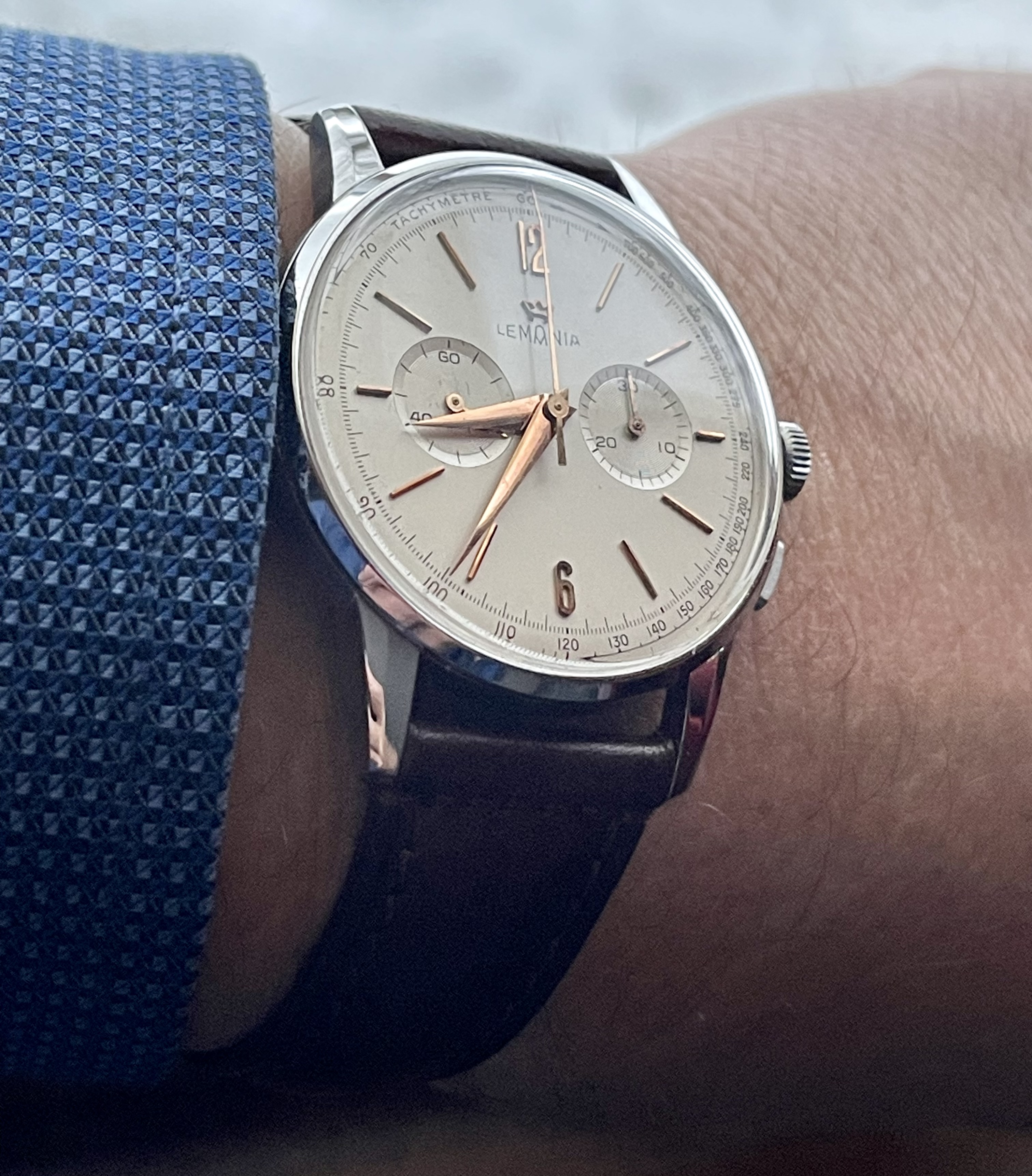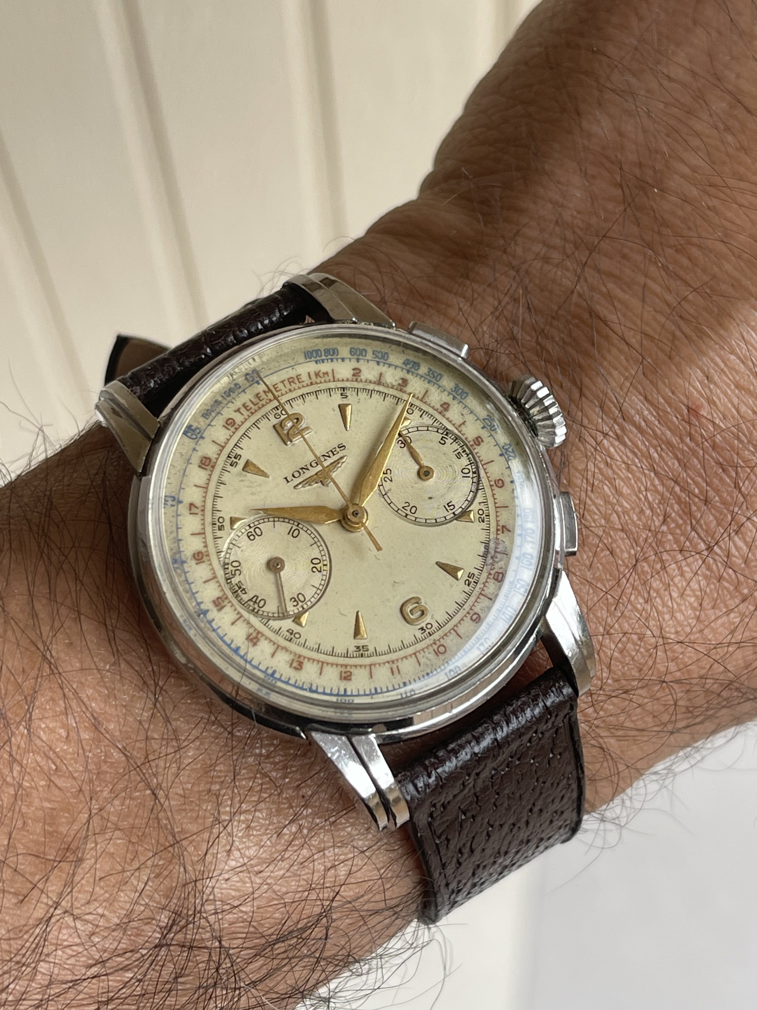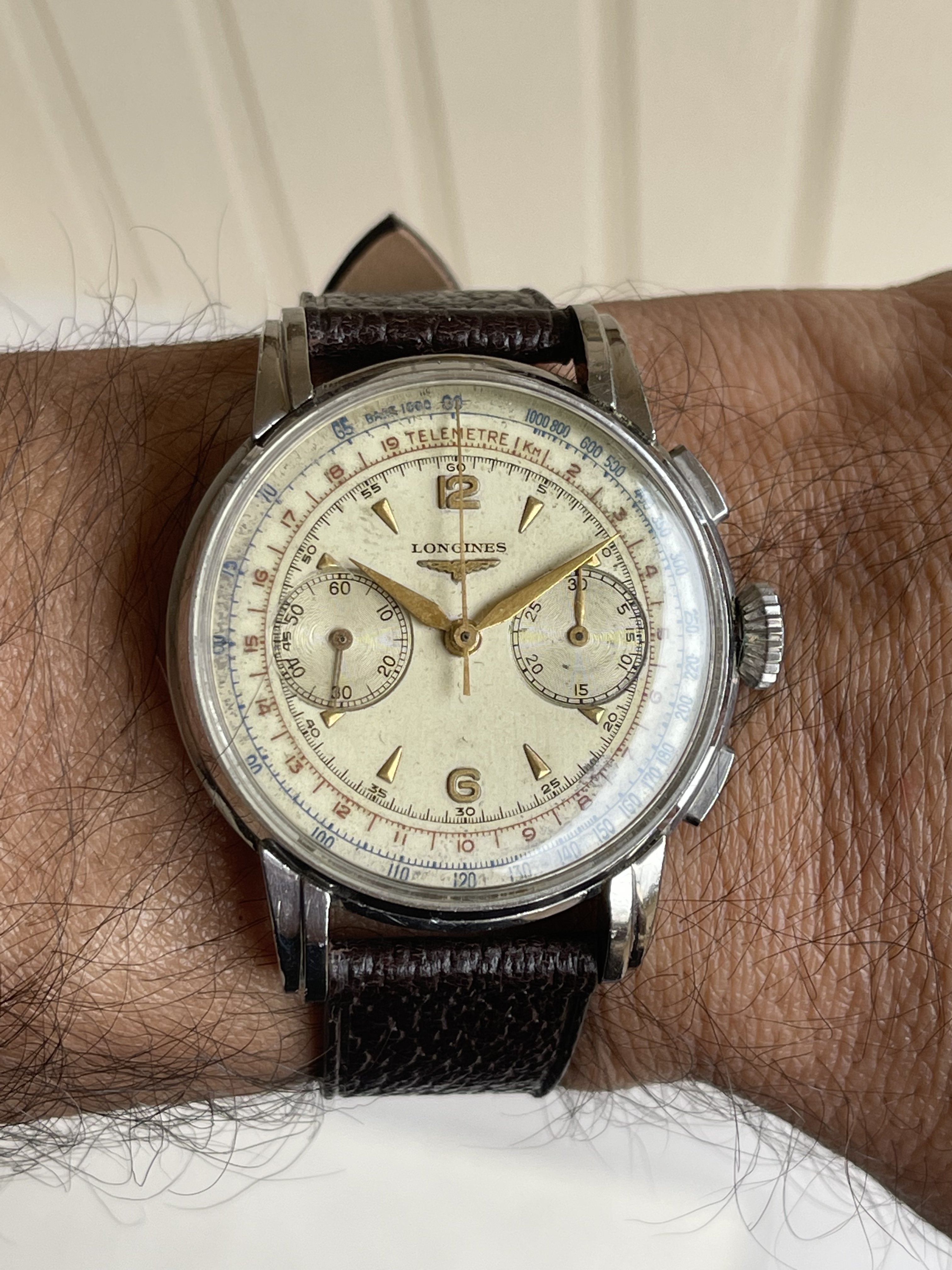 From the top: Zenith El Primero, Omega Speedmaster, Breitling Navitimer (?), Hanhart Pilots Chrono (?)