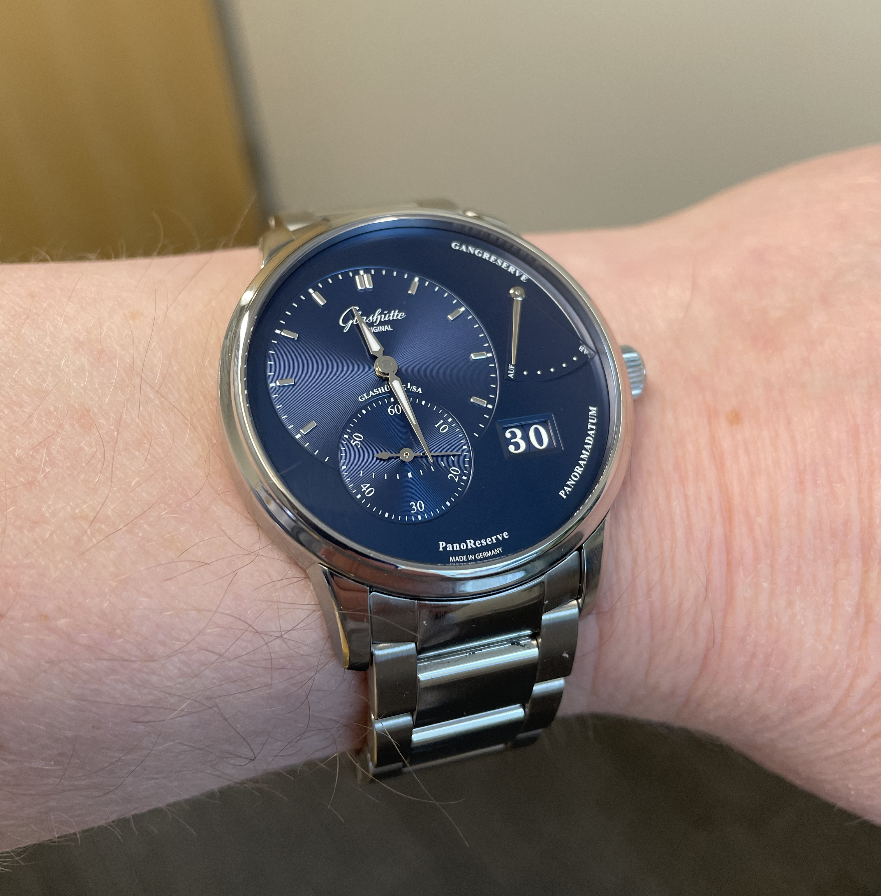 I love that watch, but for one, tiny, insignificant thing that bothers me. It's a beautiful watch with a great movement, I just can't get past the "Panoreserve" printed at the bottom above "Made in Germany." Personally, I'd love a dial that picked a language and stuck with it. Unfortunately, the standard used 95% of the time for German products is "Made in Germany" and not the alternative "Hergestellt in Deutschland." Nonetheless, if this dial was available without the "Panoreserve" text, I'd be pulling the trigger. It's superfluous, IMO, and is the only text not in caps. This isn't an objective problem with the beautiful dial, it's just my subjective opinion. 😉