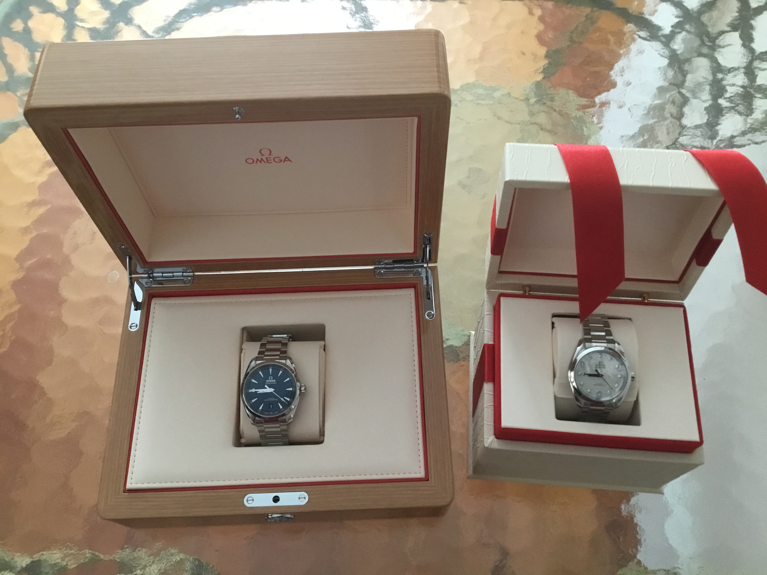 Following the “Aqua Terra Conundrum” thread, and everything else I could find online relative to AT colors and size choices, I bought a BLUE Aqua Terra 38 on the bracelet last Friday morning. “We” also bought a ladies Aqua Terra, size 34, with a mother of pearl dial and diamond indices.