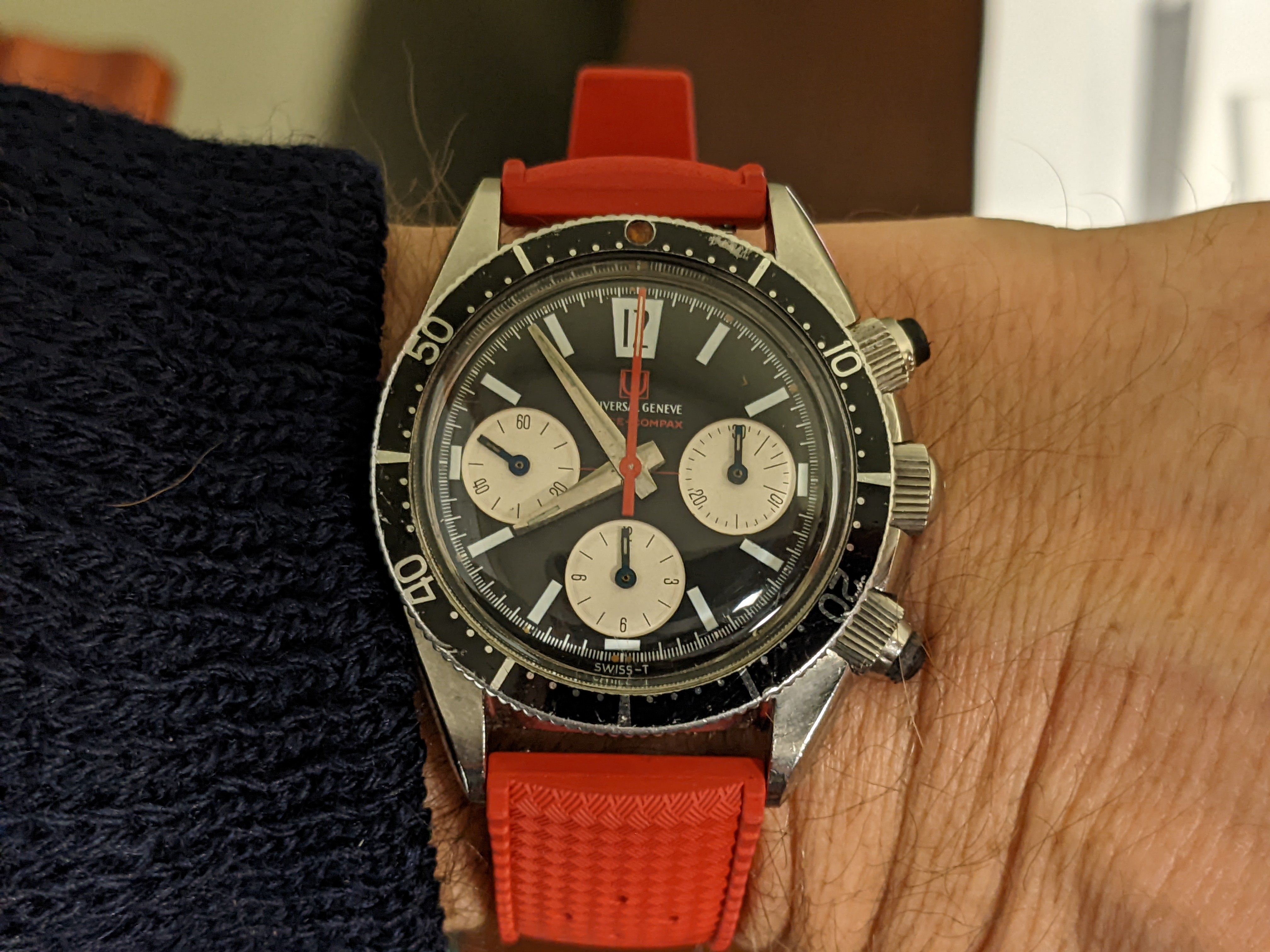 Posts 430 Likes 5,672 Gopher ·Feb 3, 2022 Universal Geneve Space Compax, late Gen 1 from 1967. How about those blued-steel subdial hands (sorry for the glare)!