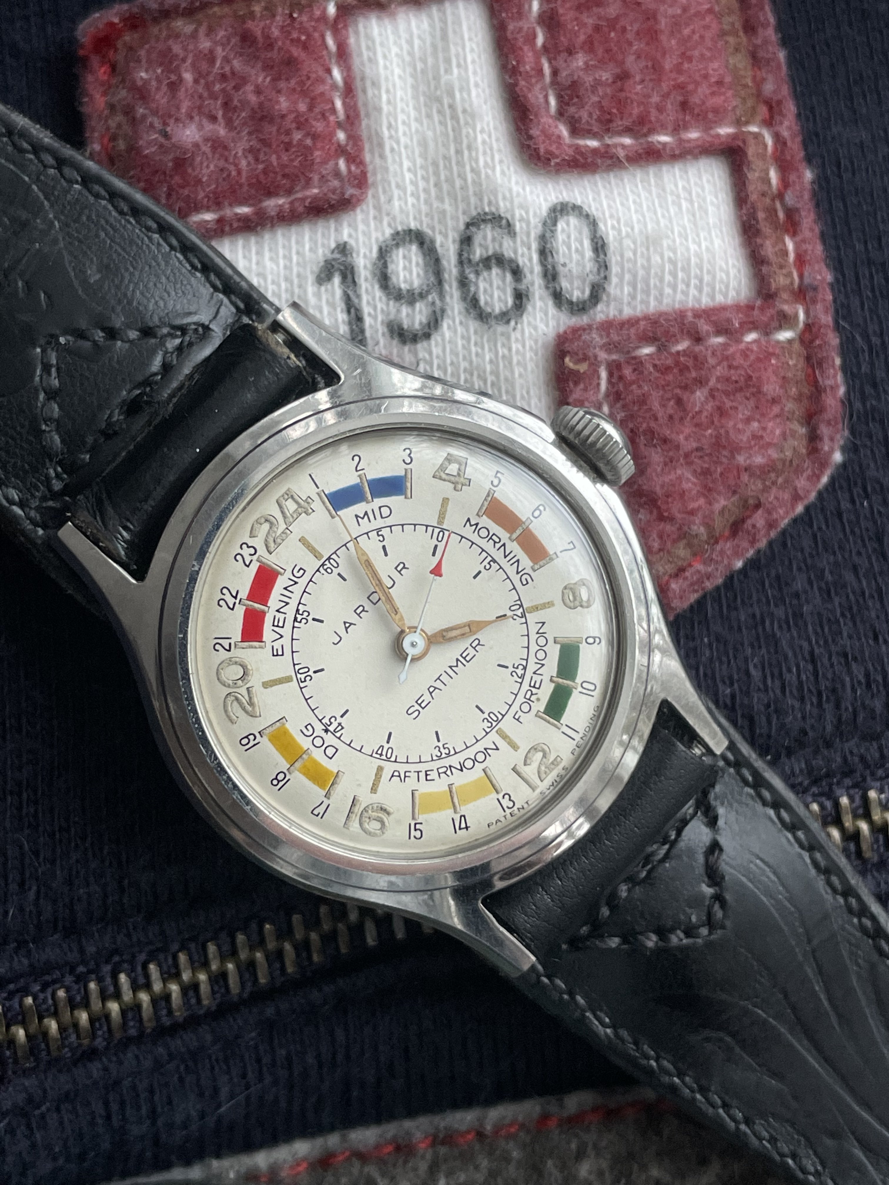 Two Accutrons, today. The first one is my 53 year old Accutron 218 day/date of which I am the second owner. I showed it here several days ago with a black leather strap. I wanted a bracelet on it, so I went through my stash, and found the one that is on it, in the images. It came as part of a job lot I bought from the estate of a deceased collector who used to buy out jewellery stores and watchmaker estates. I have also showed a picture of the sales tag that was on the bracelet container. Price? The tag shows $4.50! I wonder how long this was in a store’s inventory? You can’t buy a cheap nylon strap for that, today.