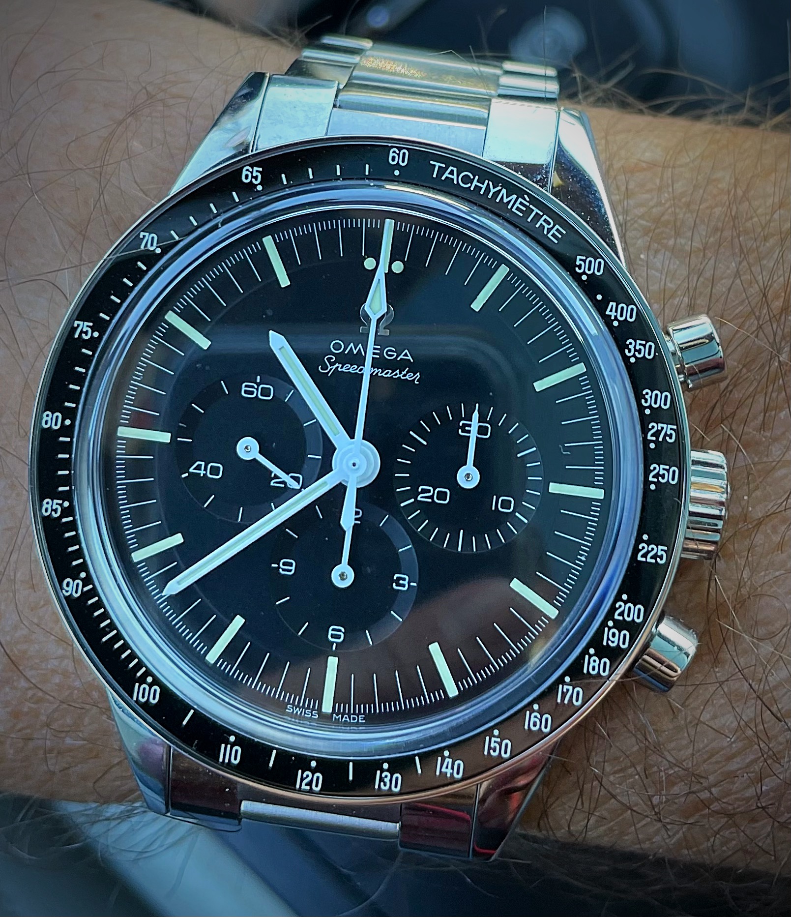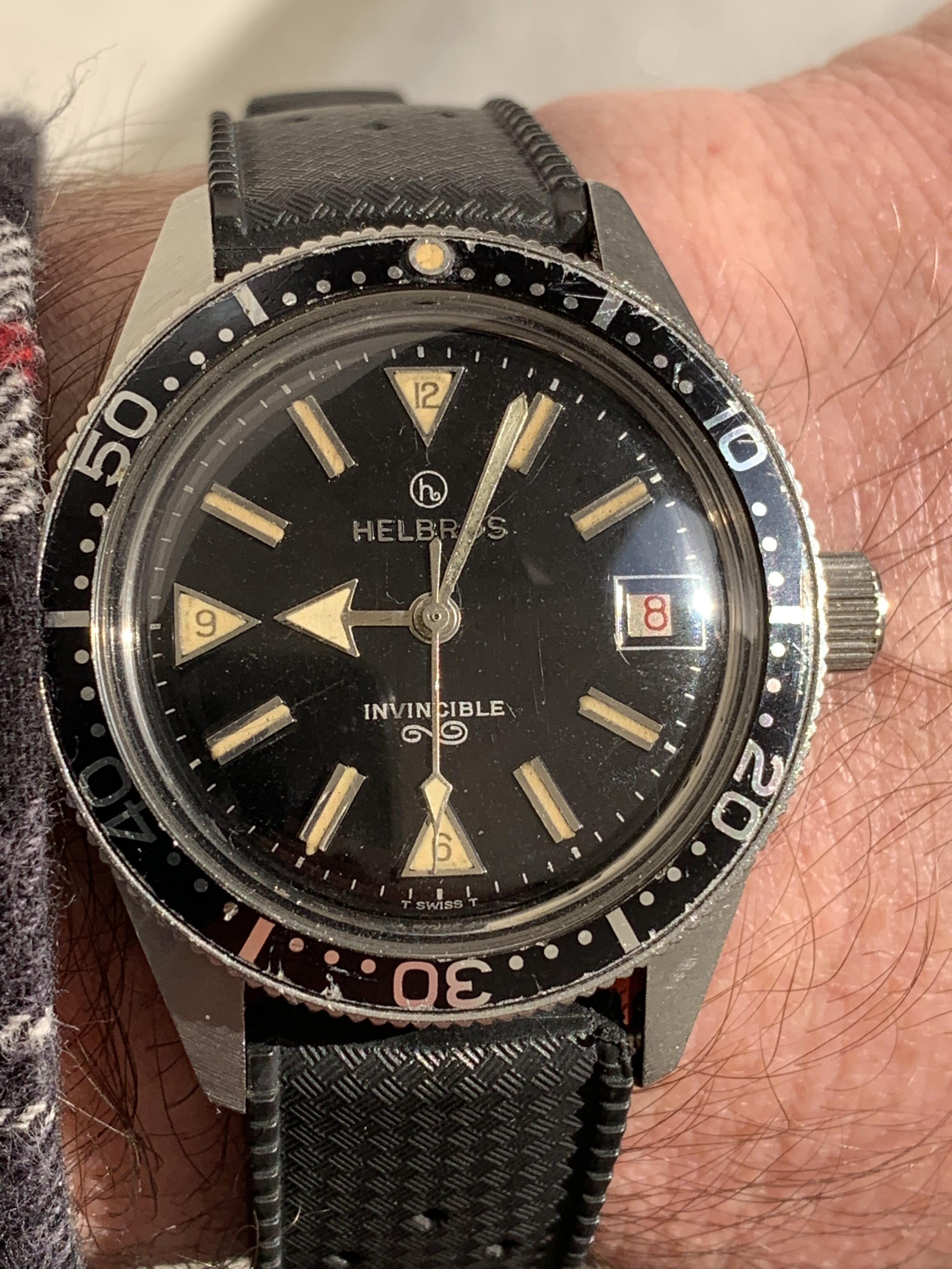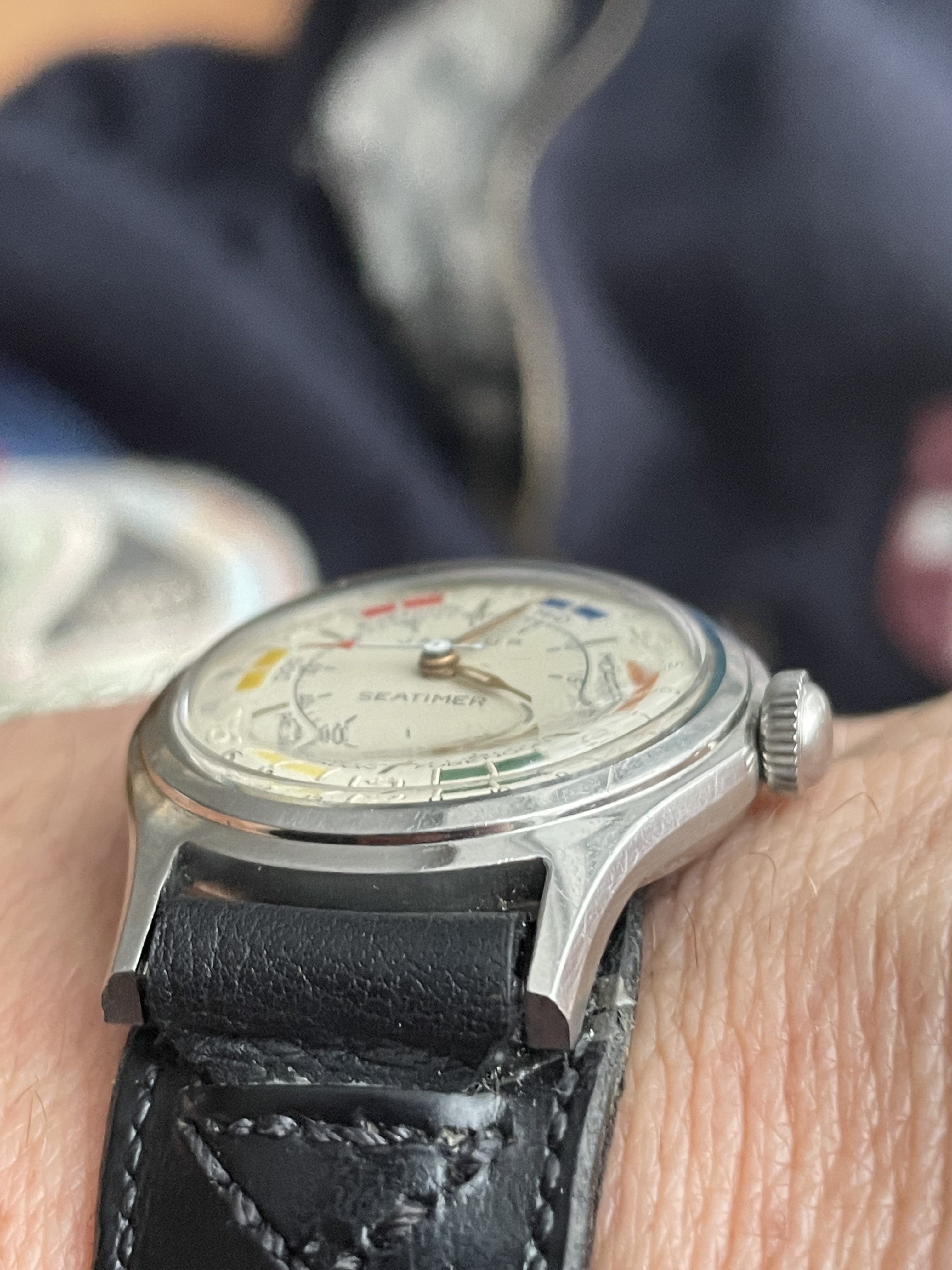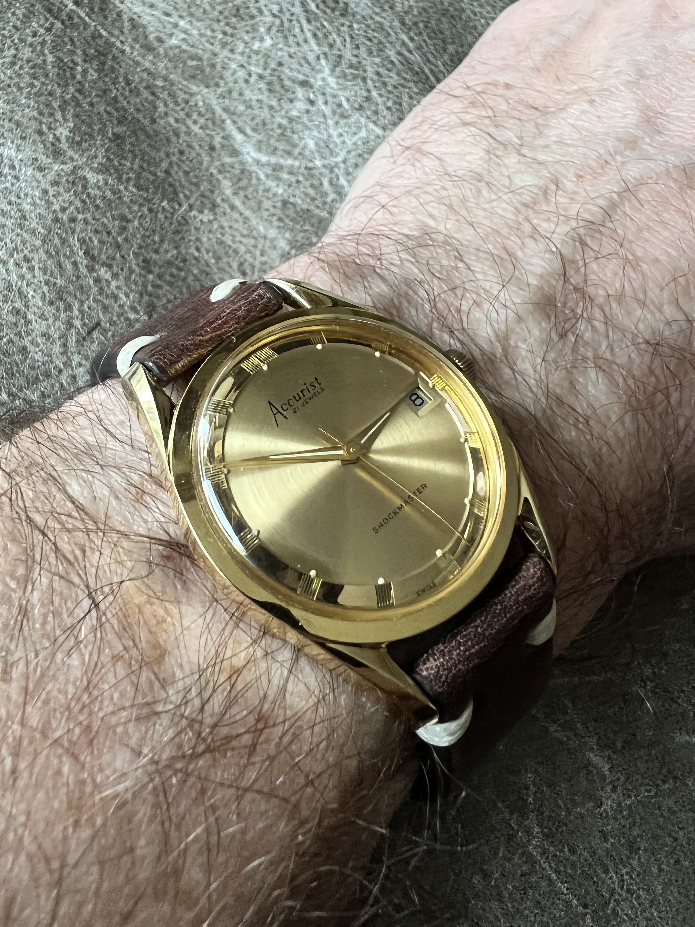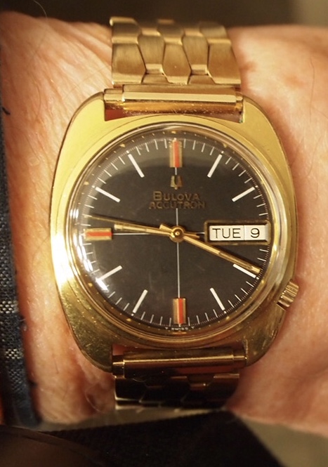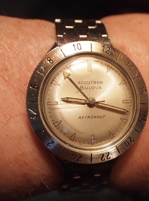 The second Accutron is my 1967 Accutron Astronaut. This one has had me tearing my hair out for weeks, to try to get it right! On Sunday, I cleaned it for the second time, but this time, I fitted a NOS genuine Accutron 214 index wheel, and adjusted the index jewel spring a teensy bit. With Accutrons, it is my preference to service them, then phase them to operate properly on currently available 1.55-volt batteries. They are readily replaceable, and they last a lot longer than the modern modified Accu-Cell which I find do not last a full year. I have finally succeeded with this one. So, off for the day wearing two watches. Lunch with a brother collector.
